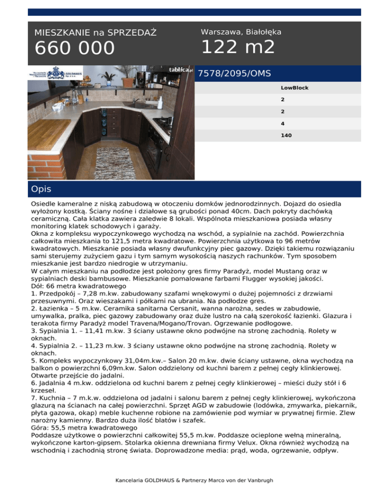 MIESZKANIE na SPRZEDAŻ 660 000 Warszawa, Białołęka 122 m2 7578/2095/OMS LowBlock 2 2 4 140 Opis Osiedle kameralne z niską zabudową w otoczeniu domków jednorodzinnych. Dojazd do osiedla wyłożony kostką. Ściany nośne i działowe są grubości ponad 40cm. Dach pokryty dachówką ceramiczną. Cała klatka zawiera zaledwie 8 lokali. Wspólnota mieszkaniowa posiada własny monitoring klatek schodowych i garaży. Okna z kompleksu wypoczynkowego wychodzą na wschód, a sypialnie na zachód. Powierzchnia całkowita mieszkania to 121,5 metra kwadratowe. Powierzchnia użytkowa to 96 metrów kwadratowych. Mieszkanie posiada własny dwufunkcyjny piec gazowy. Dzięki takiemu rozwiązaniu sami sterujemy zużyciem gazu i tym samym wysokością naszych rachunków. Tym sposobem mieszkanie jest bardzo niedrogie w utrzymaniu. W całym mieszkaniu na podłodze jest położony gres firmy Paradyż, model Mustang oraz w sypialniach deski bambusowe. Mieszkanie pomalowane farbami Flugger wysokiej jakości. Dół: 66 metra kwadratowego 1. Przedpokój – 7,28 m.kw. zabudowany szafami wnękowymi o dużej pojemności z drzwiami przesuwnymi. Oraz wieszakami i półkami na ubrania. Na podłodze gres. 2. Łazienka – 5 m.kw. Ceramika sanitarna Cersanit, wanna narożna, sedes w zabudowie, umywalka, pralka, piec gazowy zabudowany oraz duże lustro na całą szerokość łazienki. Glazura i terakota firmy Paradyż model Travena/Mogano/Trovan. Ogrzewanie podłogowe. 3. Sypialnia 1. – 11,41 m.kw. 3 ściany ustawne okno podwójne na stronę zachodnią. Rolety w oknach. 4. Sypialnia 2. – 11,23 m.kw. 3 ściany ustawne okno podwójne na stronę zachodnią. Rolety w oknach. 5. Kompleks wypoczynkowy 31,04m.kw.– Salon 20 m.kw. dwie ściany ustawne, okna wychodzą na balkon o powierzchni 6,09m.kw. Salon oddzielony od kuchni barem z pełnej cegły klinkierowej. Otwarte przejście do jadalni. 6. Jadalnia 4 m.kw. oddzielona od kuchni barem z pełnej cegły klinkierowej – mieści duży stół i 6 krzeseł. 7. Kuchnia – 7 m.k.w. oddzielona od jadalni i salonu barem z pełnej cegły klinkierowej, wykończona glazurą na ścianach na całej powierzchni. Sprzęt AGD w zabudowie (lodówka, zmywarka, piekarnik, płyta gazowa, okap) meble kuchenne robione na zamówienie pod wymiar w prywatnej firmie. Zlew narożny kamienny. Bardzo duża ilość blatów i szafek. Góra: 55,5 metra kwadratowego Poddasze użytkowe o powierzchni całkowitej 55,5 m.kw. Poddasze ocieplone wełną mineralną, wykończone karton-gipsem. Stolarka okienna drewniana firmy Velux. Okna również wychodzą na wschodnią i zachodnią stronę świata. Doprowadzone media: prąd, woda, ogrzewanie, odpływ. Kancelaria GOLDHAUS & Partnerzy Marco von der Vanbrugh Powierzchnia otwarta. Możliwość wydzielenia łazienki i zrobienia dwóch sypialni. Na planie poddasza zaznaczono paskami poddasze przynależne do mieszkania, szare prostokąty oznaczają okna, grube czarne kreski oznaczają skosy, cienkie kreski to powierzchnia użytkowa. Miejsce parkingowe – znajduje się na parkingu tuż przy bloku. Jest wliczone w cenę mieszkania. 101/ Goldhaus Nieruchomości tel. +48/22622-52-30 email: [email protected] Kancelaria GOLDHAUS & Partnerzy Marco von der Vanbrugh Powered by TCPDF (www.tcpdf.org)