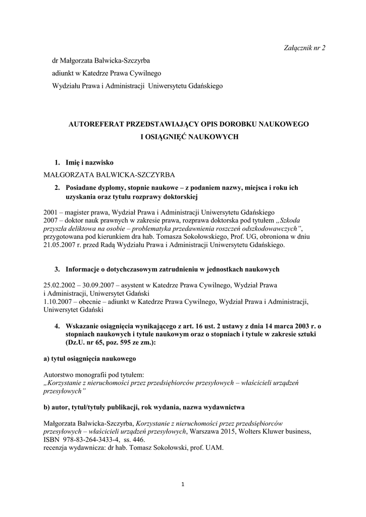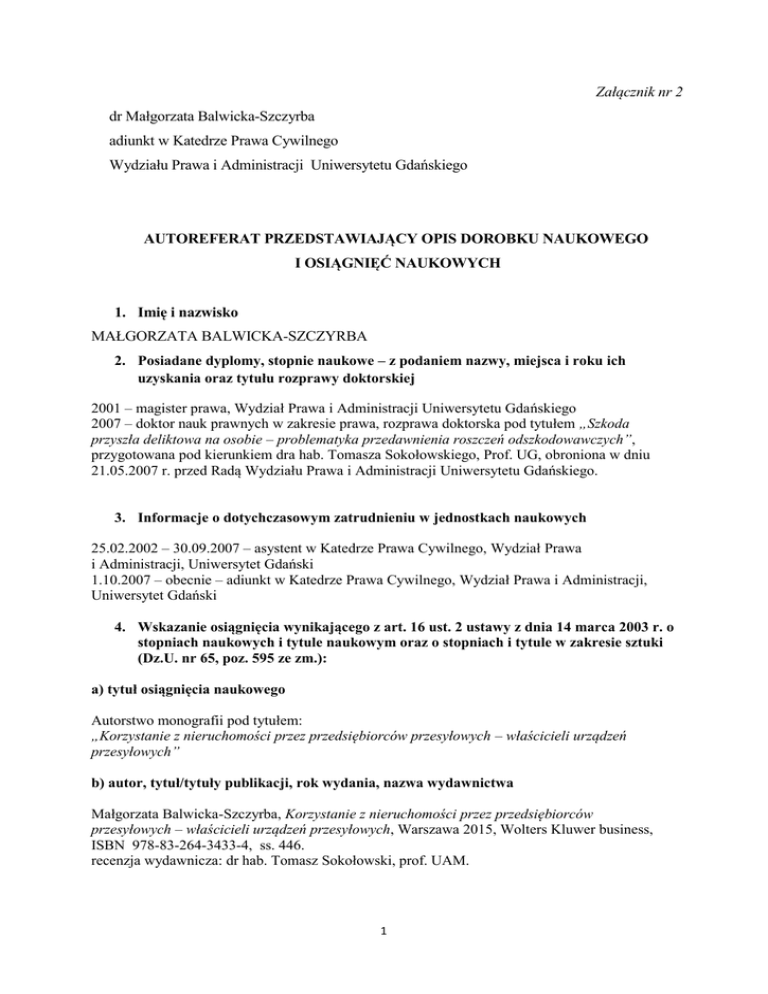 Załącznik nr 2 dr Małgorzata Balwicka-Szczyrba adiunkt w Katedrze Prawa Cywilnego Wydziału Prawa i Administracji Uniwersytetu Gdańskiego AUTOREFERAT PRZEDSTAWIAJĄCY OPIS DOROBKU NAUKOWEGO I OSIĄGNIĘĆ NAUKOWYCH 1. Imię i nazwisko MAŁGORZATA BALWICKA-SZCZYRBA 2. Posiadane dyplomy, stopnie naukowe – z podaniem nazwy, miejsca i roku ich uzyskania oraz tytułu rozprawy doktorskiej 2001 – magister prawa, Wydział Prawa i Administracji Uniwersytetu Gdańskiego 2007 – doktor nauk prawnych w zakresie prawa, rozprawa doktorska pod tytułem „Szkoda przyszła deliktowa na osobie – problematyka przedawnienia roszczeń odszkodowawczych”, przygotowana pod kierunkiem dra hab. Tomasza Sokołowskiego, Prof. UG, obroniona w dniu 21.05.2007 r. przed Radą Wydziału Prawa i Administracji Uniwersytetu Gdańskiego. 3. Informacje o dotychczasowym zatrudnieniu w jednostkach naukowych 25.02.2002 – 30.09.2007 – asystent w Katedrze Prawa Cywilnego, Wydział Prawa i Administracji, Uniwersytet Gdański 1.10.2007 – obecnie – adiunkt w Katedrze Prawa Cywilnego, Wydział Prawa i Administracji, Uniwersytet Gdański 4. Wskazanie osiągnięcia wynikającego z art. 16 ust. 2 ustawy z dnia 14 marca 2003 r. o stopniach naukowych i tytule naukowym oraz o stopniach i tytule w zakresie sztuki (Dz.U. nr 65, poz. 595 ze zm.): a) tytuł osiągnięcia naukowego Autorstwo monografii pod tytułem: „Korzystanie z nieruchomości przez przedsiębiorców przesyłowych – właścicieli urządzeń przesyłowych” b) autor, tytuł/tytuły publikacji, rok wydania, nazwa wydawnictwa Małgorzata Balwicka-Szczyrba, Korzystanie z nieruchomości przez przedsiębiorców przesyłowych – właścicieli urządzeń przesyłowych, Warszawa 2015, Wolters Kluwer business, ISBN 978-83-264-3433-4, ss. 446. recenzja wydawnicza: dr hab. Tomasz Sokołowski, prof. UAM. 1 c) omówienie celu naukowego ww. pracy i osiągniętych wyników wraz z omówieniem ich ewentualnego wykorzystania Przedkładana jako osiągnięcie naukowe monografia pt. „Korzystanie z nieruchomości przez przedsiębiorców przesyłowych – właścicieli urządzeń przesyłowych” stanowi zwieńczenie moich wieloletnich badań nad prawnymi aspektami posadawiania urządzeń przesyłowych, rozpoczętych już w roku 2008 – tj. roku, w którym dodano do kodeksu cywilnego unormowania dotyczące służebności przesyłu. Podstawowym teoretyczno-prawnym osiągnięciem tejże pracy, mającym znaczenie dla dogmatyki prawa, jest dokonanie szczegółowej i oryginalnej analizy licznych elementów wchodzących w skład problematyki korzystania z nieruchomości przez przedsiębiorców przesyłowych - właścicieli urządzeń przesyłowych. Wymaga przy tym podkreślenia, iż pomimo że zagadnienia dotyczące urządzeń przesyłowych od dłuższego czasu budzą bardzo duże zainteresowanie zarówno doktryny, jak i judykatury, brak jest takiego opracowania monograficznego, które w sposób całościowy i wyczerpujący koncentrowałoby się na kwestii tytułów prawnych do nieruchomości, możliwych do pozyskania przez przedsiębiorców przesyłowych, a także na korzystaniu z nieruchomości bez takiego tytułu. Wielość problemów związanych z tym właśnie aspektem prawnej problematyki urządzeń przesyłowych, a także duży stopień zawiłości tej problematyki, przemawiały za koniecznością jej uporządkowania i szerokiego naukowego omówienia, w tym poprzez dokonanie na nowo oceny sytuacji prawnej przedsiębiorców przesyłowych w świetle obowiązujących unormowań prawnych. Z uwagi na tak znaczną doniosłość praktyczną podjętych rozważań, budzących jednocześnie liczne wątpliwości związane z wykładnią obowiązujących przepisów prawnych, dokonana analiza jest kolejnym krokiem w badaniach nad stosunkami społecznymi, a poprzez to przyczynia się do rozwoju prawa cywilnego. Wywody zawarte w monografii mają bowiem istotne znaczenie dla określenia sytuacji prawnej przedsiębiorców przesyłowych, których istota działalności wiąże się z koniecznością posadawiania urządzeń przesyłowych, najczęściej na cudzych nieruchomościach. Z tego powodu dokonane badania mogą stanowić ważny element nie tylko w toku dalszej dyskusji nad optymalnym kształtem regulacji prawnej związanej z urządzeniami przesyłowymi, lecz także w dyskusji nad aspektami organizacyjnymi i gospodarczymi funkcjonowania przedsiębiorców przesyłowych. 2 Ze względu na to, że w pracy dokonano także określenia uwarunkowań tak znacznej skali zjawiska polegającego na korzystaniu z nieruchomości przez przedsiębiorców przesyłowych bez tytułu prawnego, a także zaproponowano sposoby jego eliminacji, przeprowadzone badania powinny korzystnie wpłynąć na proces ograniczania tego zjawiska. Skoro korzystanie z cudzych nieruchomości bez tytułu prawnego przez przedsiębiorców przesyłowych wywołuje istotne prawne i gospodarcze skutki dla nich samych, zwłaszcza z uwagi na możliwość podniesienia roszczeń przez właścicieli nieruchomości zabudowanych urządzeniami, to ograniczenie tego zjawiska, w sposób wskazany w opracowaniu, wywoła niewątpliwie pozytywny skutek społecznogospodarczy. Dokonane w pracy naukowe omówienie zagadnień dotyczących korzystania z nieruchomości przez przedsiębiorców przesyłowych – właścicieli urządzeń przesyłowych ma charakter wielopłaszczyznowy. Jego celem było, po pierwsze, uporządkowanie, a także pogłębiona naukowa analiza tytułów prawnych, które mogą stanowić podstawę korzystania z nieruchomości przez tychże przedsiębiorców (w tym zwłaszcza tytułów prawnorzeczowych i obligacyjnych, lecz także tytułów wnikających z regulacji publicznoprawnych), po drugie, określenie uwarunkowań zjawiska polegającego na korzystaniu z nieruchomości bez tytułu prawnego, w tym pod kątem możliwości jego eliminacji, oraz uporządkowanie i analiza roszczeń, które mogą być w związku z tym podnoszone wo