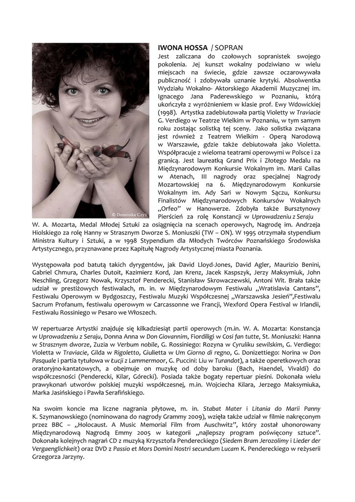 IWONA HOSSA / SOPRAN Jest zaliczana do czołowych sopranistek swojego pokolenia. Jej kunszt wokalny podziwiano w wielu miejscach na świecie, gdzie zawsze oczarowywała publiczność i zdobywała uznanie krytyki. Absolwentka Wydziału Wokalno- ktorskiego kademii uzycznej im. gnacego ana aderewskiego w oznaniu, kt r ukończyła z wyr żnieniem w klasie prof. Ewy Wdowickiej (1998). rtystka zadebiutowała parti ioletty w Traviacie G. Verdiego w Teatrze Wielkim w Poznaniu, w tym samym roku zostaj c solistk tej sceny. Jako solistka zwi zana jest r wnież z Teatrem Wielkim - per arodow w Warszawie, gdzie także debiutowała jako ioletta. Wsp łpracuje z wieloma teatrami operowymi w olsce i za granic . Jest laureatk rand ri i łotego edalu na i dzynarodowym onkursie Wokalnym im. arii allas w tenach, nagrody oraz specjalnej agrody ozartowskiej na . i dzynarodowym onkursie Wokalnym im. dy ari w owym czu, onkursu inalist w i dzynarodowych onkurs w Wokalnych r eo w anowerze. dobyła także ursztynowy ierścień za rol Konstancji w Uprowadzeniu z Seraju W. . ozarta, edal łodej ztuki za osi gni cia na scenach operowych, agrod im. ndrzeja iolskiego za rol anny w trasznym worze . oniuszki W – .W otrzymała stypendium inistra ultury i ztuki, a w typendium dla łodych w rc w oznańskiego rodowiska rtystycznego, przyznawane przez apituł agrody rtystycznej miasta oznania. Wyst powała pod batut takich dyrygent w, jak a id loyd-Jones, David Agler, Maurizio Benini, Gabriel Chmura, Charles Dutoit, Kazimierz Kord, Jan Krenz, Jacek Kaspszyk, Jerzy Maksymiuk, John eschling, rzegorz owak, rzyszto enderecki, tanisław krowaczewski, ntoni Wit. rała także udział w prestiżowych estiwalach, m. in. w i dzynarodowym estiwalu Wratisla ia antans , estiwalu perowym w ydgoszczy, estiwalu uzyki Wsp łczesnej Warszawska esień , estiwalu Sacrum Profanum, festiwalu operowym w Carcassonne we Francji, Wexford Opera Festival w Irlandii, estiwalu Rossiniego w esaro we Włoszech. W repertuarze rtystki znajduje si kilkadziesi t partii operowych m.in. W. . ozarta onstancja w Uprowadzeniu z Seraju, Donna Anna w Don Giovannim, Fiordiligi w Cosi fan tutte, St. Moniuszki: Hanna w Strasznym dworze, Zuzia w Verbum nobile, G. Rossiniego: Rozyna w Cyruliku sewilskim, G. Verdiego: Violetta w Traviacie, Gilda w Rigoletto, Giulietta w Um Giorno di regno, G. Donizettiego: Norina w Don Pasquale i partia tytułowa w Łucji z Lammermoor, G. Puccini: Liu w Turandot , a także operetkowych oraz oratoryjno-kantatowych, a obejmuje on muzyk od doby baroku ach, aendel, i aldi do wsp łczesności enderecki, ilar, recki . osiada także bogaty repertuar pieśni. okonała wielu prawykonań utwor w polskiej muzyki wsp łczesnej, m.in. Wojciecha ilara, erzego aksymiuka, arka asińskiego i awła era ińskiego. a swoim koncie ma liczne nagrania płytowe, m. in. Stabat Mater i Litania do Marii Panny . zymanowskiego nominowana do nagrody rammy , wzi ła także udział w filmie nakr conym przez BBC – Holocaust. A Music Memorial Film from Auschwitz , kt ry został uhonorowany i dzynarodow agrod mmy w kategorii najlepszy program poświ cony sztuce . Dokonała kolejnych nagrań z muzyk rzyszto a endereckiego Siedem Bram Jerozolimy i Lieder der Vergaenglichkeit) oraz DVD z Passio et Mors Domini Nostri secundum Lucam . endereckiego w reżyserii Grzegorza Jarzyny.