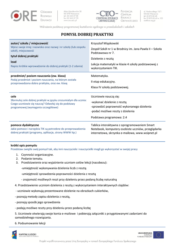 POMYSŁ DOBREJ PRAKTYKI autor/ szkoła / miejscowośd Wpisz swoje imię i nazwisko oraz nazwę i nr szkoły (lub zespołu szkół), miejscowośd tytuł dobrej praktyki lead Krzysztof Miąskowski Zespół Szkół nr 1 w Brodnicy im. Jana Pawła II – Szkoła Podstawowa nr 7. Dzielenie z resztą Napisz krótkie wprowadzenie do dobrej praktyki (1-2 zdania) Lekcja matematyki w klasie 4 szkoły podstawowej z wykorzystaniem TIK. przedmiot/ poziom nauczania (ew. klasa) Matematyka. Podaj przedmiot i poziom nauczania, na którym została przeprowadzona dobra praktyka, oraz ew. klasę II etap edukacyjny. Klasa IV szkoły podstawowej. cele Uczniowie nauczą się: Sformułuj cele dobrej praktyki w języku zrozumiałym dla ucznia: Czego uczniowie się nauczą? Odwołaj się do podstawy programowej (wymagania szczegółowe) -wykonad dzielenie z resztą -sprawdzid poprawnośd wykonanego dzielenia -podad możliwe reszty z dzielenia Podstawa programowa: 2.4 pomoce dydaktyczne Jakie pomoce i narzędzia TIK są potrzebne do przeprowadzenia dobrej praktyki (programy, aplikacje, strony WWW itp.) Tablica interaktywna z oprogramowaniem Smart Notebook, komputery osobiste uczniów, przeglądarka internetowa, skrzynka e-mailowa, www.wsipnet.pl krótki opis pomysłu Przedstaw zwięźle swój pomysł tak, aby inni nauczyciele i nauczycielki mogli go wykorzystad w swojej pracy 1. Czynności organizacyjne. 2. Podanie tematu. 3. Przedstawienie oraz wyjaśnienie uczniom celów lekcji (nacobezu): -umiejętnośd wykonywania dzielenia liczb z resztą -umiejętnośd sprawdzenia poprawności dzielenia z resztą - znajomośd możliwych reszt przy dzieleniu przez podaną liczbę naturalną 4. Przedstawienie uczniom dzielenia z resztą z wykorzystaniem interaktywnych slajdów: - uczniowie wykonują prezentowane dzielenie na obrazkach cukierków, - poznają metody zapisu dzielenia z resztą, - poznają sposób jego sprawdzenia - podają możliwe reszty przy dzieleniu przez podaną liczbę 5. Uczniowie otwierają swoje konta e-mailowe i pobierają załączniki z przygotowanymi zadaniami do samodzielnego rozwiązania. 6. Podsumowanie lekcji - uczniowie wypowiadają się, które z założonych na początku lekcji udało się im zrealizowad - zadanie pracy domowej- zestawu zadao znajdujących się na platformie WSIPnet. 7. Ocena aktywności uczniów. Nauczyciel dziękuje za wspólną pracę oraz nagradza „plusami” uczniów najbardziej aktywnych. efekty pracy Czego uczniowie się nauczyli? Co się sprawdziło? Dlaczego warto w tym przypadku zastosowad TIK? Uczniowie nauczyli się dzielid z resztą, sprawdzid poprawnośd takiego dzielenia, podad możliwe reszty z dzielenia przez daną liczbę. Brali aktywny udział w lekcji, chętnie wykonywali polecenia nauczyciela. uwagi Jakie działania planujesz w przyszłości? Czy zamierzasz zmienid lub rozwinąd swój pomysł? Przed czym chcesz przestrzec naśladowców dobrej praktyki? Planuję dalsze wykorzystanie środków jakie daje TIK w pracy nauczyciela, dopuszczam możliwośd pewnych modyfikacji tej dobrej praktyki, np. zmianę zadao przesłanych uczniom do samodzielnego rozwiązania. Pliki z zadaniami zostały stworzone w programie HotPotatoes. załączniki Materiały przygotowane przez nauczyciela (np. karty pracy, krzyżówki, quizy) oraz strona WWW, na której znajduje się dobra praktyka (prace uczniów stworzone w jej ramach) Materiały przygotowane do przeprowadzenia tej lekcji to prezentacja interaktywnych slajdów przygotowana przy użyciu oprogramowania tablicy interaktywnej SMART, pliki *.htm z zadaniami do rozwiązania w dowolnej przeglądarce internetowej.