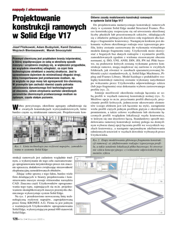 Projektowanie konstrukcji ramowych w Solid Edge V17 Józef Flizikowski, Adam Budzyński, Kamil Dziadosz, Wojciech Bieniaszewski, Marek Smoczyński Przemysł chemiczny jest przykładem branży inżynierskiej, w której współpracujące ze sobą w określony sposób maszyny i urządzenia znajdują się, w większości przypadków, we względnie niewielkiej odległości, co czyni linie technologiczne obiektami o zwartej strukturze. Jest to spowodowane dążeniem do minimalizacji długości drogi, którą transportowane jest przetwarzane medium, np. ze względu na jego masę lub agresywność bio-chemiczną. W przemyśle tym zachodzi również często potrzeba odizolowania dynamicznego linii technologicznych od otoczenia, celem utrzymania wartości określonych parametrów chemicznych przetwarzanego medium na żądanym, często stałym poziomie. W obec powyższego, określone agregaty zabudowuje się w zwartych konstrukcjach wytrzymałościowych, które bardzo często są strukturami ramowymi. Projektowanie kon- Główne zasady modelowania konstrukcji ramowych w systemie Solid Edge V17 Do projektowania numerycznego konstrukcji ramowych służy w systemie Solid Edge moduł Structural Frames. Proces konstrukcyjny rozpoczyna się od utworzenia określonej liczby płaskich lub przestrzennych szkiców, składających się z obiektów pełniących docelowo rolę trajektorii dla każdego z fragmentów kratownicy. Następnym krokiem jest dokonanie wyboru określonego rodzaju oraz typoszeregu profilu, który zostanie zastosowany do wykonania wirtualnego modelu danego fragmentu ramy. Użytkownik może skorzystać z bogatych baz danych rodzajów i wymiarów profili, zamodelowanych zgodnie z wieloma stosowanymi obecnie normami, tj. ISO, UNI, ANSI, DIN, JIS, PN itd. Pliki bazowe, na podstawie których zostaną wykonane gotowe konstrukcje ramowe, mogą znajdować się zarówno w zwykłych folderach, jak również w zasobach sparametryzowanej biblioteki części standardowych, tj. Solid Edge Machinery, Piping and Frames Library. Model każdego z podukładów rozległej konstrukcji ramowej zostanie wykonany natychmiast po wskazaniu przez Użytkownika odpowiedniego szkicu (lub jego fragmentu) oraz dokonaniu wyboru zastosowanego profilu (rys. 2). Istnieje możliwość określenia rodzaju łączenia ze sobą profili w węzłach ramowej konstrukcji nośnej (rys. 3). Możliwe opcje to m.in. przycinanie profili dłuższych, przycinanie profili krótszych, jednoczesne ukosowanie elementów (czego efektem jest ich łączenie na styk), zastąpienie wielu profili ciętych jednym profilem giętym z określonym promieniem, a także celowe wydłużenie lub skrócenie łączonych profili względem lokalizacji węzła kratownicy, w którym się one docelowo łączą. Standardowy sposób modelowania ramowej konstrukcji nośnej polega na domyślnym wyborze danej opcji łączenia profili we wszystkich węzłach kratownicy, a następnie opcjonalnym zdefiniowaniu odmiennych ustawień w węzłach dowolnie wybranych przez Użytkownika. Rys. 2. Etapy modelowania głównego fragmentu konstruk- Rys. 1. Linia technologiczna rozlewni napojów, zamodelo- wana w systemie Solid Edge strukcji ramowych jest zadaniem względnie trudnym, a wykorzystanie do tego celu zaawansowanego oprogramowania inżynierskiego proces ten znacznie upraszcza, dodatkowo zwiększając niezawodność eksploatacyjną zamodelowanych obiektów. Zdając sobie sprawę z tego faktu, bardzo wiele firm działających w branży projektowania i konstruowania maszyn stosuje różnorodne narzędzia CAD. Znaczna część Użytkowników oprogramowania tego typu, zajmujących się m.in. projektowaniem skomplikowanych maszyn przemysłu chemicznego wykorzystuje system Solid Edge. Na rys. 1 przedstawiono nowoczesną linię technologiczną rozlewni napojów, zaprojektowaną przez firmę KRONES A.G. Firma ta jest jednym z ważniejszych Użytkowników oprogramowania Solid Edge, wykorzystującym ponad 400 stanowisk Solid Edge. 126 NR 9 WRZESIEŃ 2005 R. cji ramowej: a) zdefiniowanie rodzaju i typoszeregu profilu, a także ustalenie lokalizacji pliku bazowego; b) stworzenie szkicu koncepcyjnego; c) wskazanie odpowiednich fragmentów szkicu kroju poprzecznego profili uzależnione jest od pozycji tzw. punktów wodzących. W przekroju poprzecznym profili, zarówno dostarczonych przez Producenta systemu, firmę UGS, jak też wykonanych przez Użytkownika, wyróżnia się sześć punktów wodzących, z których jeden uznaje się za główny. Istotny jest również kierunek wektora odniesienia punktu wodzącego. Według zasad domyślnych, przekrój poprzeczny modelowanego profilu zostaje tak umieszczony przestrzennie, aby wskazana trajektoria była do niego normalna w głównym punkcie wodzącym, a kierunek wektora wskazywał ortogonalne położenie środka pola powierzchni przekroju (rys. 4 a). Użytkownik może zmieniać orientację przestrzenną przekroju profilu poprzez jego translację pomiędzy punktami wodzącymi (rys. 4 b), jak również rotację o dany kąt Rys. 3. Możliwe sposoby łączenia profili sąsiednich: a) przycinanie profili dłuższych; b) przycinanie profili krótszych; c) łączenie na styk; d) zastąpienie wielu profili ciętych (rys. 4 c). Dokładniejszy wpływ na położejednym profilem giętym z określonym promieniem nie przestrzenne modeli profili można uzyskać poprzez zmianę wartości odpowiednich wymiarów ustanowionych pomiędzy poszczególnymi Pozycjonowanie przestrzenne profili względem elementów elementami szkicu koncepcyjnego. Lokalizację głównego szkiców koncepcyjnych punktu wodzącego wraz z wektorem odniesienia ustanaModele profili wchodzących w skład konstrukcji ramowej wia się podczas edycji profilu pierwotnej operacji bryłowej zostaną wygenerowane wzdłuż wybranych trajektorii, tj. ele- w bazowych plikach profili (rys. 4 d), przy czym jest to promentów szkiców koncepcyjnych. Położenie przestrzenne prze- ces opcjonalny. Rys. 4. D