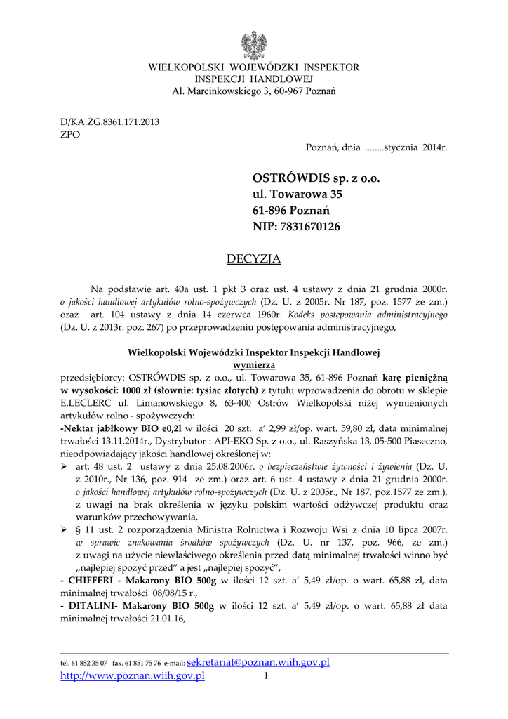 WIELKOPOLSKI WOJEWÓDZKI INSPEKTOR INSPEKCJI HANDLOWEJ Al. Marcinkowskiego 3, 60-967 Poznań D/KA.ŻG.8361.171.2013 ZPO Poznań, dnia ........stycznia 2014r. OSTRÓWDIS sp. z o.o. ul. Towarowa 35 61-896 Poznań NIP: 7831670126 DECYZJA Na podstawie art. 40a ust. 1 pkt 3 oraz ust. 4 ustawy z dnia 21 grudnia 2000r. o jakości handlowej artykułów rolno-spożywczych (Dz. U. z 2005r. Nr 187, poz. 1577 ze zm.) oraz art. 104 ustawy z dnia 14 czerwca 1960r. Kodeks postępowania administracyjnego (Dz. U. z 2013r. poz. 267) po przeprowadzeniu postępowania administracyjnego, Wielkopolski Wojewódzki Inspektor Inspekcji Handlowej wymierza przedsiębiorcy: OSTRÓWDIS sp. z o.o., ul. Towarowa 35, 61-896 Poznań karę pieniężną w wysokości: 1000 zł (słownie: tysiąc złotych) z tytułu wprowadzenia do obrotu w sklepie E.LECLERC ul. Limanowskiego 8, 63-400 Ostrów Wielkopolski niżej wymienionych artykułów rolno - spożywczych: -Nektar jabłkowy BIO e0,2l w ilości 20 szt. a’ 2,99 zł/op. wart. 59,80 zł, data minimalnej trwałości 13.11.2014r., Dystrybutor : API-EKO Sp. z o.o., ul. Raszyńska 13, 05-500 Piaseczno, nieodpowiadający jakości handlowej określonej w: art. 48 ust. 2 ustawy z dnia 25.08.2006r. o bezpieczeństwie żywności i żywienia (Dz. U. z 2010r., Nr 136, poz. 914 ze zm.) oraz art. 6 ust. 4 ustawy z dnia 21 grudnia 2000r. o jakości handlowej artykułów rolno-spożywczych (Dz. U. z 2005r., Nr 187, poz.1577 ze zm.), z uwagi na brak określenia w języku polskim wartości odżywczej produktu oraz warunków przechowywania, § 11 ust. 2 rozporządzenia Ministra Rolnictwa i Rozwoju Wsi z dnia 10 lipca 2007r. w sprawie znakowania środków spożywczych (Dz. U. nr 137, poz. 966, ze zm.) z uwagi na użycie niewłaściwego określenia przed datą minimalnej trwałości winno być „najlepiej spożyć przed” a jest „najlepiej spożyć”, - CHIFFERI - Makarony BIO 500g w ilości 12 szt. a‘ 5,49 zł/op. o wart. 65,88 zł, data minimalnej trwałości 08/08/15 r., - DITALINI- Makarony BIO 500g w ilości 12 szt. a’ 5,49 zł/op. o wart. 65,88 zł data minimalnej trwałości 21.01.16, tel. 61 852 35 07 fax. 61 851 75 76 e-mail: [email protected] http://www.poznan.wiih.gov.pl 1 - CASERECCE- Makarony BIO 500g w ilości 12 szt. a’ 5,49 zł/op. o wart. 65,88 zł data minimalnej trwałości 22.04.16, Wyprodukowano we Włoszech , Importer : Api Sp. z o.o., ul. Bema 31C, 63-400 Ostrów Wlkp., nieodpowiadające jakości handlowej określonej w : art. 48 ust. 2 ustawy z dnia 25.08.2006r. o bezpieczeństwie żywności i żywienia (Dz. U. z 2010r. , Nr 136, poz. 914 ze zm.) oraz art. 6 ust. 4 ustawy z dnia 21 grudnia 2000r. o jakości handlowej artykułów rolno-spożywczych (Dz. U. z 2005r., Nr 187, poz.1577 ze zm.), z uwagi na brak określenia w języku polskim wartości odżywczej produktu oraz sposobu przygotowania lub stosowania. Art. 40a ust. 1 pkt 3 w/w ustawy, każdy kto wprowadza do obrotu artykuły rolnospożywcze nieodpowiadające jakości handlowej określonej w przepisach o jakości handlowej lub deklarowanej przez producenta w oznakowaniu tych artykułów, podlega karze pieniężnej w wysokości do pięciokrotnej wartości korzyści majątkowej uzyskanej lub która mogłaby zostać uzyskana przez wprowadzenie tych artykułów rolno-spożywczych do obrotu, nie niższej jednak niż 500 zł. UZASADNIENIE W dniach od 17.10.2013r. do 22.10.2013r. na podstawie upoważnienia Wielkopolskiego Wojewódzkiego Inspektora Inspekcji Handlowej nr D/KA.ŻG.8361.171.2013 z dnia 17 października 2013r. inspektorzy Wojewódzkiego Inspektoratu Inspekcji Handlowej w Poznaniu Delegatura w Kaliszu przeprowadzili kontrolę w OSTRÓWDIS sp. z o.o., ul. Towarowa 35, 61-896 Poznań, E.LECLERC w Ostrowie Wlkp. ul. Limanowskiego 8 na podstawie przepisów art. 3 ust. 1-3 rozporządzenia Parlamentu Europejskiego i Rady (WE) Nr 882/2004 z dnia 29 kwietnia 2004r. w sprawie kontroli urzędowych przeprowadzanych w celu sprawdzenia zgodności z prawem paszowym i żywnościowym oraz regułami dotyczącymi zdrowia zwierząt i dobrostanu zwierząt (Dz. Urz. UE L 165 z 30.04.2004r. ze zm.), art. 17 ust. 3 ustawy z dnia 21 grudnia 2000r. o jakości handlowej artykułów rolno-spożywczych (Dz. U. z 2005r. nr 187, poz. 1577, ze zm.) w związku z art. 3 ust. 1 pkt 1, 2 i 6 ustawy z dnia 15 grudnia 2000r. o Inspekcji Handlowej (Dz. U. z 2009r. Nr 151, poz. 1219 ze zm.). W toku kontroli stwierdzono, że do sprzedaży oferowano: -Nektar jabłkowy BIO e0,2l w ilości 20 szt. a’ 2,99 zł/op. wart. 59,80 zł, data minimalnej trwałości 13.11.2014r., Dystrybutor: API-EKO Sp. z o.o., ul. Raszyńska 13, 05-500 Piaseczno, nieodpowiadający jakości handlowej określonej w : art. 48 ust. 2 ustawy z dnia 25.08.2006r. o bezpieczeństwie żywności i żywienia (Dz. U. z 2010r., Nr 136, poz. 914 ze zm.) oraz art. 6 ust. 4 ustawy z dnia 21 grudnia 2000r. o jakości handlowej artykułów rolno-spożywczych (Dz. U. z 2005r., Nr 187, poz.1577 ze zm.), z uwagi na brak określenia w języku polskim wartości odżywczej produktu oraz warunków przechowywania, § 11 ust. 2 rozporządzenia Ministra Rolnictwa i Rozwoju Wsi z dnia 10 lipca 2007r. w sprawie znakowania środków spożywczych (Dz. U. nr 137, poz. 966, ze zm.) z uwagi na użycie niewłaściwego określenia przed datą minimalnej trwałości winno być „najlepiej spożyć przed” a jest „najlepiej spożyć," tel. 61 852 35 07 fax. 61 851 75 76 e-mail: [email protected] http://www.poznan.wiih.gov.pl 2 - CHIFFERI - Makarony BIO 500g w ilości 12 szt. a‘ 5,49 zł/op. o wart. 65,88 zł, data minimalnej trwałości 08/08/15 r., Wyprodukowano we Włoszech, Importer: Api Sp. z o.o., ul. Bema 31C, 63-400 Ostrów Wlkp., nieodpowiadający jakości handlowej określonej w : art. 48 ust. 2 ustawy z dnia 25.08.2006r. o bezpieczeństwie żywności i żywienia (Dz. U. z 2010r., Nr 136, poz. 914 ze zm.) oraz art. 6 ust. 4 ustawy z dnia 21 grudnia 2000r. o jakości handlowej artykułó