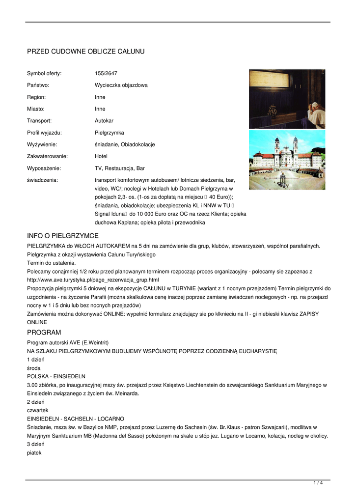 Propozycja pielgrzymki 5 dniowej na ekspozycje CAŁUNU w TURYNIE (wariant z 1 nocnym przejazdem) Termin pielgrzymki do