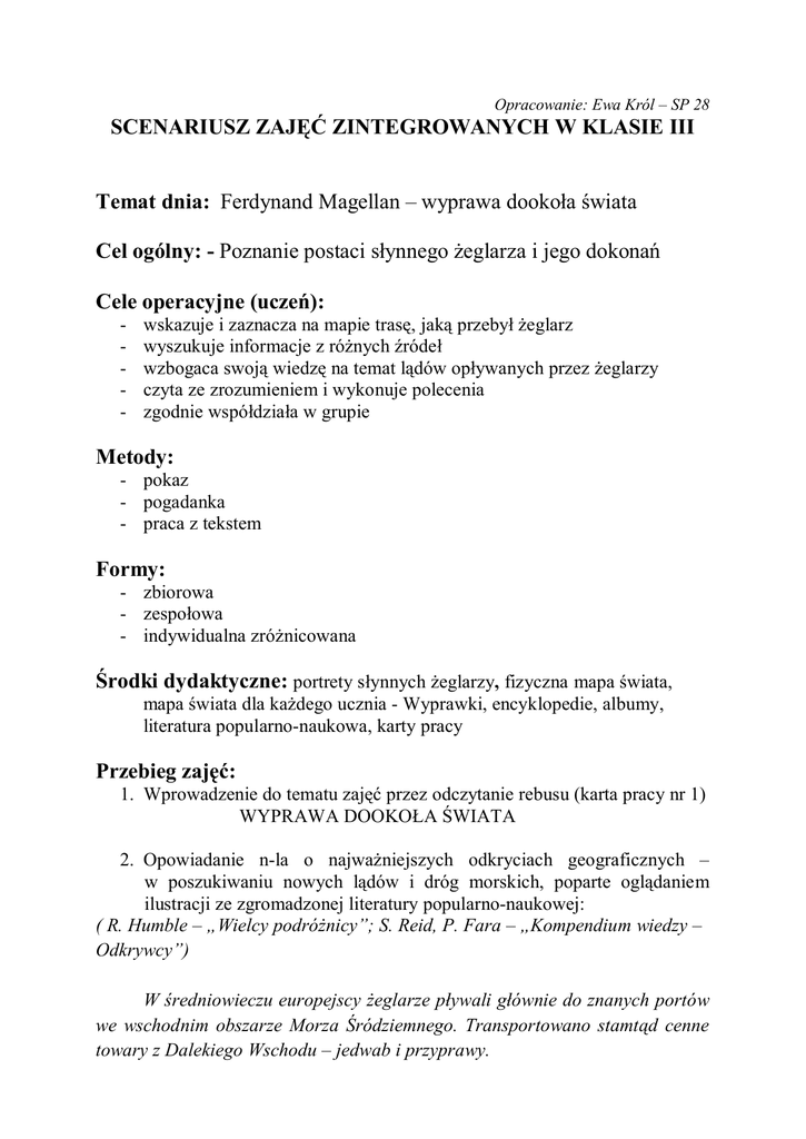 Opracowanie: Ewa Król – SP 28 SCENARIUSZ ZAJĘĆ ZINTEGROWANYCH W KLASIE III Temat dnia: Ferdynand Magellan – wyprawa dookoła świata Cel ogólny: - Poznanie postaci słynnego żeglarza i jego dokonań Cele operacyjne (uczeń): - wskazuje i zaznacza na mapie trasę, jaką przebył żeglarz wyszukuje informacje z różnych źródeł wzbogaca swoją wiedzę na temat lądów opływanych przez żeglarzy czyta ze zrozumieniem i wykonuje polecenia zgodnie współdziała w grupie Metody: - pokaz - pogadanka - praca z tekstem Formy: - zbiorowa - zespołowa - indywidualna zróżnicowana Środki dydaktyczne: portrety słynnych żeglarzy, fizyczna mapa świata, mapa świata dla każdego ucznia - Wyprawki, encyklopedie, albumy, literatura popularno-naukowa, karty pracy Przebieg zajęć: 1. Wprowadzenie do tematu zajęć przez odczytanie rebusu (karta pracy nr 1) WYPRAWA DOOKOŁA ŚWIATA 2. Opowiadanie n-la o najważniejszych odkryciach geograficznych – w poszukiwaniu nowych lądów i dróg morskich, poparte oglądaniem ilustracji ze zgromadzonej literatury popularno-naukowej: ( R. Humble – „Wielcy podróżnicy”; S. Reid, P. Fara – „Kompendium wiedzy – Odkrywcy”) W średniowieczu europejscy żeglarze pływali głównie do znanych portów we wschodnim obszarze Morza Śródziemnego. Transportowano stamtąd cenne towary z Dalekiego Wschodu – jedwab i przyprawy. Pierwszym kupcem, który dotarł do Chin (zwanych wtedy Kathaj) był Włoch Marco Polo. Opisał szczegółowo swój pobyt na dworze Wielkiego Chana Kubilaja i wszystkie cuda kathajskiej cywilizacji – papierowe pieniądze, węgiel, jako opał, piękne naczynia z ceramiki, proch –używany w czasie wojny i do wyrobu sztucznych ogni. Książka ta zainspirowała innego znanego żeglarza Krzysztofa Kolumba, jednego z najsłynniejszych odkrywców na świecie. Swego największego odkrycia – odkrycia kontynentu amerykańskiego – dokonał przez pomyłkę. Chciał dopłynąć do Chin, żeglując w kierunku zachodnim. Dopłynął do lądu (obecnie są to Wyspy Bahama) – sądził, że to Chiny. Do końca życia nie przyjął do wiadomości tej pomyłki. Dopiero włoski odkrywca Amerigo Vespucci ustalił, że ląd odkryty przez Kolumba to cały kontynent. Ten „Nowy Świat” nazwano na cześć Vespucciego Ameryką. Innym wielkim odkrywcą był Portugalczyk Vasco da Gama, który dopłynął do Indii, opływając Afrykę. Wschodnia Afryka dostarczała ziarno, kość słoniową i złoto, a z Indii pochodziły perły, rubiny i przyprawy. Żeglarzem, który jako pierwszy opłynął świat był Portugalczyk Ferdynand Magellan. Prześledzimy dzisiaj trasę jego wyprawy i dowiemy się, jakie przyniosła ona korzyści. · · · · Zapis na tablicy: Marco Polo – podróż na Wschód, do Chin Krzysztof Kolumb – droga na Zachód – odkrycie Ameryki Vasco da Gama – nowa droga do Indii Ferdynand Magellan – pierwsza wyprawa dookoła świata 3. Wskazywanie na mapie fizycznej świata trasy wyprawy Magellana prezentacja materiałów dotyczących kolejnych etapów podróży, przygotowanych przez zespoły: 1) Europa – Hiszpania 2) Ameryka Południowa 3) Ocean Spokojny 4) Filipiny - Wyspy Korzenne 5) Afryka (Uczniowie prezentują zgromadzone przez siebie materiały z dostępnych źródeł, n-l uzupełnia w miarę potrzeby przekazywane informacje) 4. Zaznaczanie na mapkach konturowych F. Magellana. (mapki z Wyprawek) świata trasy wyprawy 5. Podsumowanie wiadomości – próba odpowiedzi na pytanie: Jakie były najważniejsze dokonania Magellana i jego marynarzy? – praca zróżnicowana (karty pracy nr 2) § poziom I – próba samodzielnej odpowiedzi na pytania § poziom II – dokończenie zdań § poziom III – tekst z lukami 6. Podsumowanie dnia w kręgu: Dokończ zdanie: Dowiedziałam(łem) się dzisiaj, że ........................................................ Dzisiejsze zajęcia były ..............., ponieważ ......................................... 7. Ocena pracy uczniów na zajęciach. Zadanie pracy domowej – Namaluj farbami plakatowymi wybrany etap podróży Magellana. (Karta pracy nr 2) I. Napisz odpowiedzi na podane pytania: 1)Kim był Ferdynand Magellan? ................................................................................................................. ................................................................................................................. 2)Jakie były największe odkrycia Magellana? ................................................................................................................. ................................................................................................................. ................................................................................................................. II. Dokończ podane zdania: Ferdynand Magellan to ........................................................................... ................................................................................................................. Do jego największych odkryć należy ..................................................... ................................................................................................................. ................................................................................................................. ................................................................................................................. III.Uzupełnij brakujące wyrazy: Ferdynand Magellan to ............................................. żeglarz, który opłynął ............................................................. . W czasie podróży odkrył przejście na Morze Południowe, zwane obecnie ................................................ ................................................ . Wody, na które wypłynęli nazwał .............................................. .............................................. . Z da
