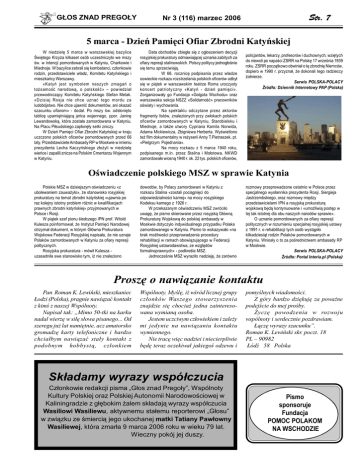 GŁOS ZNAD PREGOŁY Str. 7 Nr 3 (116) marzec 2006 5 marca - Dzień Pamięci Ofiar Zbrodni Katyńskiej W niedzielę 5 marca w warszawskiej bazylice Świętego Krzyża kilkaset osób uczestniczyło we mszy św. w intencji pomordowanych w Katyniu, Charkowie i Miednoje. W bazylice zebrali się kombatanci, członkowie rodzin, przedstawiciele władz, Komitetu Katyńskiego i mieszkańcy Warszawy. «Katyń jest symbolem naszych zmagań o tożsamość narodową, o polskość» – powiedział przewodniczący Komitetu Katyńskiego Stefan Melak. «Dzisiaj Rosja nie chce uznać tego mordu za ludobójstwo. Nie chce ujawnić dokumentów, ani okazać szacunku ofiarom» - dodał. Po mszy św. odsłonięto tablicę upamiętniającą jeńca wojennego, ppor. Janinę Lewandowską, która została zamordowana w Katyniu. Na Placu Piłsudskiego zapłonęły setki zniczy. W Dzień Pamięci Ofiar Zbrodni Katyńskiej w kraju uczczono polskich oficerów pomordowanych przed 66 laty. Przedstawiciele Ambasady RP w Moskwie w imieniu prezydenta Lecha Kaczyńskiego złożyli w niedzielę wieńce i zapalili znicze na Polskim Cmentarzu Wojennym w Katyniu. Data obchodów zbiegła się z ogłoszeniem decyzji rosyjskiej prokuratury odmawiającej uznania zabitych za ofiary represji stalinowskich. Polscy politycy jednogłośnie się temu sprzeciwiają. W 66. rocznicę podpisania przez władze sowieckie rozkazu rozstrzelania polskich oficerów odbył się w piątek w warszawskim teatrze Roma uroczysty koncert patriotyczny «Katyń - dzień pamięci». Zorganizowały go Fundacja «Golgota Wschodu» oraz warszawska sekcja NSZZ «Solidarność» pracowników oświaty i wychowania. Na spektaklu odczytane przez aktorów fragmenty listów, znalezionych przy zwłokach polskich oficerów zamordowanych w Katyniu, Starobielsku i Miednoje, a także utwory Cypriana Kamila Norwida, Adama Mickiewicza, Zbigniewa Herberta. Wyświetlono też film dokumentalny w reżyserii Anny T.Pietraszek, pt. «Pielgrzym Pojednania». Na mocy rozkazu z 5 marca 1940 roku, podpisanego m.in. przez Stalina i Mołotowa, NKWD zamordowało wiosną 1940 r. ok. 22 tys. polskich oficerów, policjantów, lekarzy, profesorów i duchownych, wziętych do niewoli po napaści ZSRR na Polskę 17 września 1939 roku. ZSRR początkowo obwiniał o tę zbrodnię Niemców, dopiero w 1990 r. przyznał, że dokonali tego radzieccy żołnierze. Serwis POLSKA-POLACY Żródło: Dziennik Internetowy PAP (Polska) Oświadczenie polskiego MSZ w sprawie Katynia Polskie MSZ w dzisiejszym oświadczeniu «z ubolewaniem zauważyło», że stanowisko rosyjskiej prokuratury na temat zbrodni katyńskiej «ujawnia po raz kolejny istotny problem różnic w kwalifikacjach prawnych zbrodni katyńskiej» przyjmowanych w Polsce i Rosji. W piątek szef pionu śledczego IPN prof. Witold Kulesza poinformował, że Instytut Pamięci Narodowej otrzymał dokument, w którym Główna Prokuratura Wojskowa Federacji Rosyjskiej napisała, że nie uznaje Polaków zamordowanych w Katyniu za ofiary represji politycznych. Rosyjska prokuratura - mówił Kulesza uzasadniła swe stanowisko tym, iż nie znaleziono dowodów, by Polacy zamordowani w Katyniu z rozkazu Stalina «zostali pociągnięci do odpowiedzialności karnej» na mocy rosyjskiego Kodeksu karnego z 1926 r. W przekazanym oświadczeniu MSZ zwróciło uwagę, że pismo skierowane przez rosyjską Główną Prokuraturę Wojskową do polskiej ambasady w Moskwie dotyczyło indywidualnego przypadku Polaka zamordowanego w Katyniu. Pismo to wskazywało «na brak możliwości przeprowadzenia procedury rehabilitacji w ramach obowiązującego w Federacji Rosyjskiej ustawodawstwa, ze względów formalnoprawnych» - podkreśla MSZ. Jednocześnie MSZ wyraziło nadzieję, że zarówno rozmowy przeprowadzone ostatnio w Polsce przez specjalnego wysłannika prezydenta Rosji, Siergieja Jastrzembskiego, oraz rozmowy między przedstawicielami IPN a rosyjską prokuraturą wojskową będą kontynuowane i «umożliwią postęp w tej tak istotnej dla obu naszych narodów sprawie». O uznanie pomordowanych za ofiary represji politycznych w rozumieniu specjalnej rosyjskiej ustawy z 1991 r. o rehabilitacji tych osób wystąpiło kilkadziesiąt rodzin Polaków pomordowanych w Katyniu. Wniosły o to za pośrednictwem ambasady RP w Moskwie. Serwis POLSKA-POLACY Żródło: Portal Interia.pl (Polska) Proszę o nawiązanie kontaktu Pan Roman K. Lewiński, mieszkaniec Łodzi (Polska), pragnie nawiązać kontakt z kimś z naszej Wspólnoty. Napisał tak: „Mimo 50-tki na karku nadal wierzę w siłę słowa pisanego... Od szeregu już lat namiętnie, acz amatorsko gromadzę karty telefoniczne i bardzo chciałbym nawiązać stały kontakt z podobnym hobbystą, członkiem Wspólnoty. Myślę, iż wśród licznej grupy członków Waszego stowarzyszenia znajdzie się chociaż jedna zainteresowana wymianą osoba. Jestem uczciwym człowiekiem i zależy mi jedynie na nawiązaniu kontaktu wymiennego. Nie tracę więc nadziei i niecierpliwie będę teraz oczekiwał jakiegoś odzewu i pomyślnych wiadomości. Z góry bardzo dziękuję za poważne podejście do mej prośby. Życzę powodzenia w rozwoju wspólnoty i serdecznie pozdrawiam. Łączę wyrazy szacunku”. Roman K. Lewiński skr. poczt. 18 PL – 90982 Łódź 58 Polska Składamy wyrazy współczucia Członkowie redakcji pisma „Głos znad Pregoły”, Wspólnoty Kultury Polskiej oraz Polskiej Autonomii Narodowościowej w Kaliningradzie z głębokim żalem składają wyrazy współczucia Wasiliowi Wasiliewu, aktywnemu stałemu reporterowi „Głosu” w związku ze śmiercią jego ukochanej matki Tatiany Pawłowny Wasiliewej, która zmarła 9 marca 2006 roku w wieku 79 lat. Wieczny pokój jej duszy. Pismo sponsoruje Fundacja POMOC POLAKOM NA WSCHODZIE