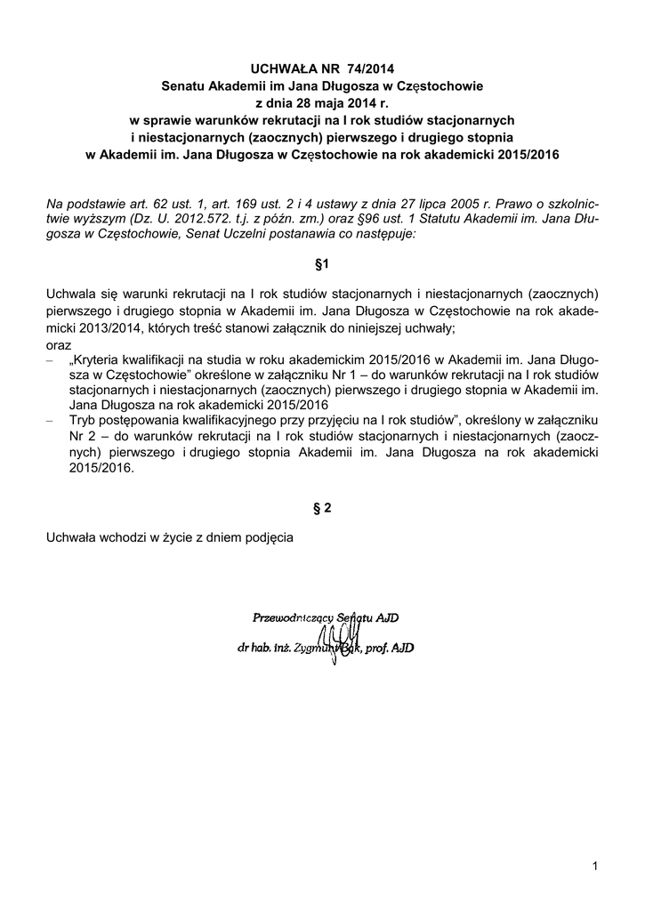 UCHWAŁA NR 74/2014 Senatu Akademii im Jana Długosza w Częstochowie z dnia 28 maja 2014 r. w sprawie warunków rekrutacji na I rok studiów stacjonarnych i niestacjonarnych (zaocznych) pierwszego i drugiego stopnia w Akademii im. Jana Długosza w Częstochowie na rok akademicki 2015/2016 Na podstawie art. 62 ust. 1, art. 169 ust. 2 i 4 ustawy z dnia 27 lipca 2005 r. Prawo o szkolnictwie wyższym (Dz. U. 2012.572. t.j. z późn. zm.) oraz §96 ust. 1 Statutu Akademii im. Jana Długosza w Częstochowie, Senat Uczelni postanawia co następuje: §1 Uchwala się warunki rekrutacji na I rok studiów stacjonarnych i niestacjonarnych (zaocznych) pierwszego i drugiego stopnia w Akademii im. Jana Długosza w Częstochowie na rok akademicki 2013/2014, których treść stanowi załącznik do niniejszej uchwały; oraz ‒ „Kryteria kwalifikacji na studia w roku akademickim 2015/2016 w Akademii im. Jana Długosza w Częstochowie” określone w załączniku Nr 1 – do warunków rekrutacji na I rok studiów stacjonarnych i niestacjonarnych (zaocznych) pierwszego i drugiego stopnia w Akademii im. Jana Długosza na rok akademicki 2015/2016 ‒ Tryb postępowania kwalifikacyjnego przy przyjęciu na I rok studiów”, określony w załączniku Nr 2 – do warunków rekrutacji na I rok studiów stacjonarnych i niestacjonarnych (zaocznych) pierwszego i drugiego stopnia Akademii im. Jana Długosza na rok akademicki 2015/2016. §2 Uchwała wchodzi w życie z dniem podjęcia 1 Załącznik Nr 1 Do Uchwały Senatu nr 74/2014 Akademii im. Jana Długosza w Częstochowie WARUNKI REKRUTACJI NA I ROK STUDIÓW STACJONARNYCH I NIESTACJONARNYCH (ZAOCZNYCH) PIERWSZEGO I DRUGIEGO STOPNIA W AKADEMII im. JANA DŁUGOSZA W CZĘSTOCHOWIE NA ROK AKADEMICKI 2015/2016 §1 1. Akademia im Jana Długosza w Częstochowie prowadzi nabór kandydatów na I rok studiów stacjonarnych i niestacjonarnych (zaocznych) pierwszego i drugiego stopnia, w ramach planowanej liczby miejsc dla poszczególnych kierunków na podstawie: konkursu świadectw, konkursu dyplomów studiów pierwszego stopnia, zdanego egzaminu praktycznego, średniej ocen ze studiów pierwszego stopnia lub rozmowy kwalifikacyjnej. 2. Kryteria kwalifikacji określa Załącznik Nr 1 do niniejszych warunków rekrutacji. 3. Tryb postępowania kwalifikacyjnego określa Załącznik nr 2 do niniejszych warunków rekrutacji. 4. Jeżeli liczba kandydatów będzie mniejsza od planowanej liczby miejsc na kierunku, na którym jest przewidziany konkurs świadectw decyzją Wydziałowej Komisji Rekrutacyjnej można odstąpić od postępowania rekrutacyjnego i przyjąć wszystkich zgłoszonych kandydatów na podstawie złożonych wymaganych dokumentów. §2 Postępowanie kwalifikacyjne ma charakter konkursowy. Oceny uzyskane w wyniku postępowania kwali Według potrzeb oceny są przeliczane na punkty a punkty na oceny, końcowy wynik egzaminów wstępnych jest wyrażony w punktach lub % pkt. § 3. Na studia drugiego stopnia na kierunkach: inżynieria bezpieczeństwa, malarstwo, matematyka prowadzona będzie również rekrutacja od semestru letniego zgodnie z kryteriami kwalifikacji i trybem postępowania kwalifikacyjnego określonymi w niniejszych warunkach rekrutacji. §4 1. Postępowanie kwalifikacyjne dla kandydatów z Maturą Międzynarodową (IB) odbywa się zgodnie z warunkami i trybem rekrutacji na studia w Akademii im. Jana Długosza w Częstochowie określonych w Załączniku Nr 2 do niniejszych warunków rekrutacji. 2. Kandydaci na studia stacjonarne i niestacjonarne zamiast świadectwa dojrzałości składają zaświadczenie o przystąpieniu do matury Międzynarodowej oraz świadectwo ukończenia szkoły średniej, świadectwo dojrzałości zobowiązani są dostarczyć zgodnie z terminarzem obowiązującym kandydatów na studia stacjonarne i niestacjonarne. §5 1. Szczegółowe zasady przyjmowania na studia laureatów oraz finalistów olimpiad określa uchwała nr …../14 Senatu Akademii im. Jana Długosza w Częstochowie z dnia 28 maja 2014 r. w sprawie „Zasad przyjmowania laureatów oraz finalistów olimpiad przedmiotowych obowiązujących w latach 2015-2017”. 2. Podstawą zwolnienia z postępowania kwalifikacyjnego jest oryginał dokumentu wydanego przez główny komitet organizacyjny danej olimpiady, opatrzony numerem porządkowym i stwierdzający miejsce zajęte w finale oraz tytuł. 2 3. Ogólna liczba ww. laureatów, finalistów nie może przekraczać 50% planowanej liczby miejsc na dany kierunek studiów. §6 1. Kandydaci z maturą dwujęzyczną z języka obcego nie przystępują do części podstawowej, zatem należy uznać to za zwolnienie z tego poziomu egzaminu, czyli przyznanie maksymalnej liczby 100% punktów. 2. Do przeliczenia wyniku egzaminu zdanego na poziomie rozszerzonym należy przyjąć, że 30% punktów z matury dwujęzycznej jest równoważne 40% punktów z matury na poziomie rozszerzonym. Wynik maksymalny nie powinien przekroczyć 100%. §7 1. Postępowanie kwalifikacyjne przeprowadzają Wydziałowe Komisje Rekrutacyjne powołane przez Dziekana i zatwierdzone przez Rady Wydziału. 2. Uczelnianą Komisję Rekrutacyjną powołuje Senat Uczelni. 3. Przewodniczącym Uczelnianej Komisji Rekrutacyjnej jest Rektor lub wyznaczony przez niego Prorektor. 4. Przewodniczącym Komisji Wydziałowej jest Dziekan lub wyznaczona przez niego osoba. W razie konieczności powołania kilku Wydziałowych Komisji Rekrutacyjnych Dziekan przyjmuje rolę koordynatora postępowania kwalifikacyjnego (rekrutacyjnego) na wydziale. 5. Do zadań Wydziałowej Komisji Rekrutacyjnej należy w szczególności: przestrzeganie terminów i zadań ustalonych w harmonogramie rekrutacji; pobieranie z systemu IRK (Internetowa Rekrutacja Kandydatów) i przetwarzanie pliku zawierającego listę oraz dane kandydatów; podejmowanie decyzji o dopuszczeniu kandydatów do postępowania rekrutacyjnego; zawiadomienie kandydatów o terminie i miejscu postępowania kwalifikacyjnego; przeprowadzenie 