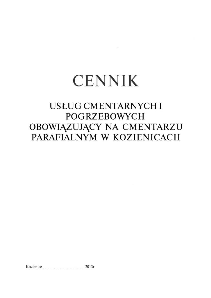 CENNIK USŁUG CMENTARNYCH I POGRZEBOWYCH OBOWIĄZUJĄCY NA CMENTARZU PARAFIALNYM W KOZIENICACH Kozienice 2013r 1. Ceny Grobów 1. Ceny grobów do pogrzebu Lp. 1.1 1 Grób murowany 1 -osobowy 2 1335,73 Stawka VAT 8% 3 106,86 1.2 Grób murowany 2-osobowy 2406,07 192,49 2598,56 1.3 Grób murowany 3-osobowy 3390,82 271,27 3662,09 1.4 Grób murowany 4-osobowy 3801,79 304,14 4105,93 1.5 Grób murowany 5-osobowy 4444,44 355,56 4800,00 1.6 Grób murowany 6-osobowy 5277,77 422,23 5700,00 1.7 Grób murowany urnowy 259,26 20,74 280,00 314,81 25,19 340,00 1037,03 82,97 1120,00 1.8 Cena netto Cena brutto 4 1442,59 Grób murowany dla dzieci do 6 lat 1-osobowy Grób murowany 1 -osobowy 1.9 na miejscu grobu ziemnego/rabaty po 20 latach (do ceny należy doliczyć ewentualne rozebranie rabaty lub nagrobka) 1.10 Grób murowany 2-osobowy na miejscu grobu ziemnego/rabaty po 20 latach (do ceny należy doliczyć ewentualne rozebranie rabaty lub nagrobka) 2 .Ceny grobów za życia 1861,11 148,89 2010,00 Cena netto Cena brutto 1 Lp 2.1 Grób murowany 1 -osobowy 2.2 Grób murowany 2-osobowy 2.3 Grób murowany 3-osobowy 2.4 Grób murowany 4-osobowy 2.5 Grób murowany 5-osobowy 2.6 Grób murowany 6-osobowy 2.7 Grób murowany urnowy 3.Prefabrykaty 2 1335,73 2406,07 3390,82 4259,87 4471,54 5284,55 260,16 Cena netto Stawka VAT 23% 3.1 3.2 Płyta mała Płyta duża 52,84 60,97 307,22 553,40 779,89 979,77 1028,46 1215,45 59,84 Stawka VAT 23% 12,16 14,03 4 1642,95 2959,47 4170,71 5239,64 5500,00 6500,00 320,00 Cena brutto 65,00 75,00 2. Ceny usług pogrzebowych 1. Pochowanie Lp. 1.1 Cena netto 1 Urny Sobota i święta dodatek 30% 1.2 Dziecka do 6 lat Soboty i święta dodatek 30% 1.3 Pierwsze pochowanie-w grobie murowanym 1,2,3,4,5,6osobowym- nowa piwnica ( przy pochowaniu do grobu należy doliczyć koszt demontażu i montażu płyty) W soboty i święta +30% 1.4 W grobie ziemnym 1 osobowym (poniżej -10°C , sobota i święta -dodatek 30%) W grobie ziemnym 21.5 osobowym (poniżej -10°C , sobota i święta -dodatek 30%) 2 .Dochowanie 2 74,07 97,22 74,07 97,22 Stawka VAT 8% 3 5,93 7,78 5,93 7,78 157,40 12,60 170,00 203,70 259,26 342,59 16,30 20,74 27,41 220,00 280,00 370,00 416,66 537,03 33,34 42,97 450,00 580,00 Cena netto Cena brutto Cena brutto 4 80,00 105,00 80,00 105,00 Lp 2.1 1 Urny do grobu murowanego w soboty i święta dodatek 30% 2 74,07 97,22 Stawka VAT 8% 3 5,93 7,78 2.2 Dziecka do 6 lat w soboty i święta dodatek 30% Do grobu murowanego na 1 poziom ( przy dochowaniu do grobu należy doliczyć koszt demontażu i montażu płyty) w soboty i święta dodatek 30% Do grobu murowanego na 2poziom ( przy dochowaniu do grobu należy doliczyć koszt demontażu i montażu płyty) w soboty i święta dodatek 30% Do grobu murowanego na 3poziom ( przy dochowaniu do grobu należy doliczyć koszt demontażu i montażu płyty) w soboty i święta dodatek 30% Do grobu ziemnego (poniżej 10°C , w soboty i święta dodatek 30%) Dochowanie do grobu rabata/ nagrobek (rozebranie, wykopanie grobu, pochowanie, montaż nagrobka) w soboty i święta dodatek 30% 74,07 97,22 111,11 5,93 7,78 8,89 80,00 105,00 120,00 138,88 11,12 150,00 166,66 13,34 180,00 222,22 17,78 240,00 231,48 18,52 250,00 296,29 23,71 320,00 222,22 287,03 17,78 22,97 240,00 310,00 1037,03 82,97 1120,00 1342,59 107,41 1450,00 2.3 2.4 2.5 2.6 2.7 4 80,00 105,00 2.8 Dochowanie do grobu- rabata w soboty i święta dodatek 30% 722,22 944,44 3 .Ekshumacja Lp 3.1 1 Z grobu murowanego Cena netto 2 814,81 3.2 Z grobu ziemnego ( poniżej 10°C dodatek 30%) 944,44 1222,22 4.Zebranie szczątków zwłok i pochowanie niżej w tym samym grobie Cena netto 57,78 75,56 Stawka VAT 8% 3 65,19 75,56 97,78 Stawka VAT 8% 780,00 1020,00 Stawka brutto 4 880,00 1020,00 1320,00 Stawka brutto 1 Z grobu ziemnego ( do usługi należy doliczyć koszt wykopania grobu ziemnego jeżeli nie na zmiany na grób murowany) 5.Demontaż i montaż płyt nagrobkowych 1 Lp. Płyta lastrykowa, betonowa 5.1 2 314,81 3 25,19 4 340,00 5.2 462,96 37,04 500,00 Lp. 4.1 Płyta kamienna, tworzywo 5.3 2 314,81 Cena netto Dodatkowe prace w grobie - do pochowania np. przemurowanie ścianki ó.Kopanie grobów ziemnych 1 Lp. 1-osobowego + dodatek 30% 6.1 poniżej -5°C Indywidualna wycena 6.2 574,07 740,74 620,37 805,55 125,00 166,66 129,63 166,66 6.3 6.4 6.5 2-osobowego + + dodatek 30% poniżej -5°C 3-osobowego + + dodatek 30% poniżej -5°C Dla dziecka do lat 6 + dodatek 30% poniżej -5°C Pod urnę + dodatek 30% poniżej -5°C Cena netto 2 472,22 601,85 3 25,19 Stawka VAT 8% Stawka VAT 8% 3 37,78 48,15 45,93 59,26 49,63 64,45 10,00 13,34 10,37 13,34 4 340,00 Stawka brutto Cena brutto 4 510,00 650,00 620,00 800,00 670,00 870,00 135,00 180,00 140,00 180,00 3. Stawki opłat cmentarnych 1. Oplata za korzystanie z urządzeń i infrastruktury Cmentarza Lp. 1 1.1 Oplata wjazdowa na czas wykonywania robót remontowych na grobach stawka od jednego grobu ( układanie kostki, układanie płytek, wysypanie kruszywa wokół grobu itp..) 1.2 Oplata wjazdowa na czas budowy grobu lub nagrobkastawka od jednego grobu lub nagrobka 1.3 Kaucja za czynności związane z wykonywaniem robót przy grobach , wykonywaniem pomników itp. Przez podmioty inne niż KGK Sp. z o.o. 1.4 Kaucja za czynności związane z wykonywaniem robót przy grobach : układanie kostki, układanie płytek, wysypanie kruszywa wkoło grobu ustawianie ławek itp. 1.5 Opłata za Im2 dodatkowo zajętego gruntu pod zagospodarowanie otoczenia skrajnego grobu, 1.6 Pozwolenie na ustawienie ławki 2. Oplata za prawo użytkowania grobu na 20 lat 1 Lp. Pod urny 2.1 Cena netto 2 Stawka VAT 23% 3 56,91 13,09 70,00 154,47 35,53 190,00 1000,00 VAT 0% 1000,00 500,00 VAT 0% 500,00 105,69 24,31 130,00 105,69 24,31 130,00 2 212,96 Stawka VAT 8% 3 17,04 Cena netto Cena brutto 4 Cena brutto 4 230,00 2.2 Pod grób dla dziecka do 6 lat 314,81 25,19 340,00 2.3 Pod grób murowanym 1,2,3osobowym Pod grób murowany 4,5,6osobowy Opłata pod grób ziemny , rabatę 1,2,3 - osobowe w pionie Op