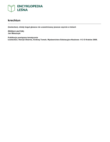 krechtun (łowiectwo), młody kogut głuszca nie uczestniczacy jeszcze czynnie w tokach ŹRÓDŁO (AUTOR) Jan Błaszczyk Publikacje powiązane tematycznie Łowiectwo; Henryk Okarma, Andrzej Tomek; Wydawnictwo Edukacyjno-Naukowe H 2 O Kraków 2008.