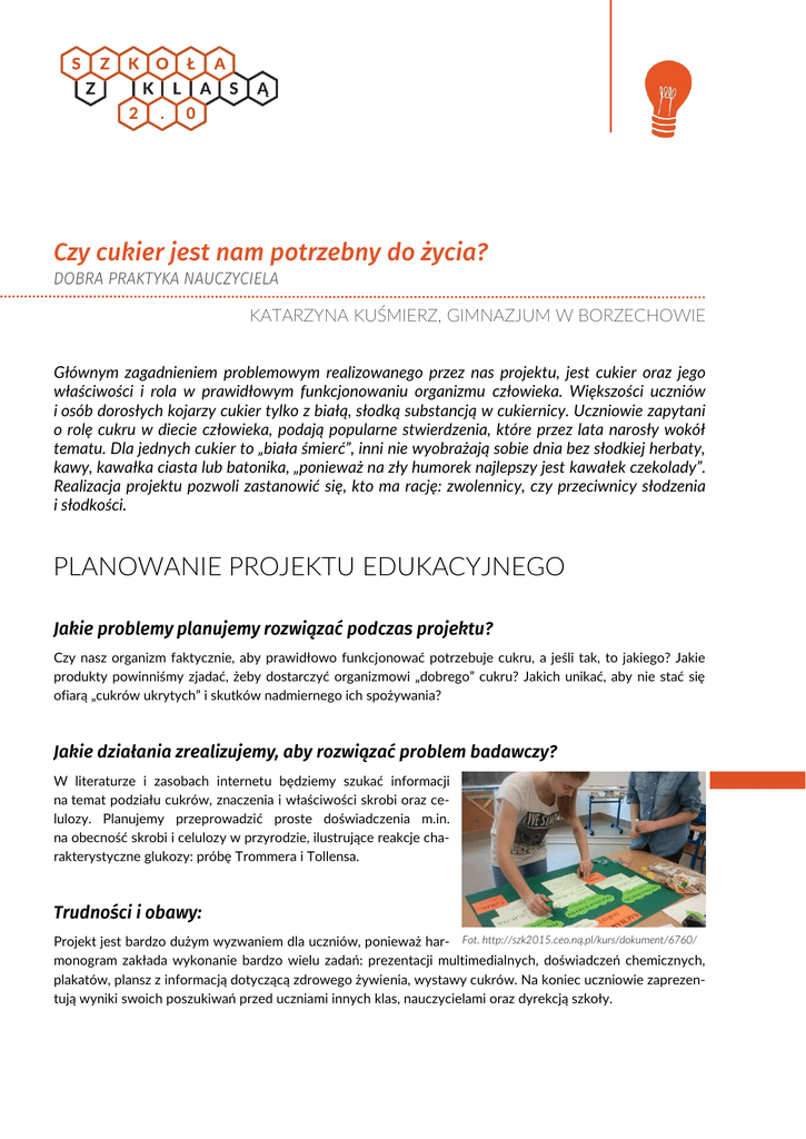 KATARZYNA KUŚMIERZ, GIMNAZJUM W BORZECHOWIE Głównym zagadnieniem problemowym realizowanego przez nas projektu, jest cukier oraz jego właściwości i rola w prawidłowym funkcjonowaniu organizmu człowieka. Większości uczniów i osób dorosłych kojarzy cukier tylko z białą, słodką substancją w cukiernicy. Uczniowie zapytani o rolę cukru w diecie człowieka, podają popularne stwierdzenia, które przez lata narosły wokół tematu. Dla jednych cukier to „biała śmierć”, inni nie wyobrażają sobie dnia bez słodkiej herbaty, kawy, kawałka ciasta lub batonika, „ponieważ na zły humorek najlepszy jest kawałek czekolady”. Realizacja projektu pozwoli zastanowić się, kto ma rację: zwolennicy, czy przeciwnicy słodzenia i słodkości. PLANOWANIE PROJEKTU EDUKACYJNEGO Czy nasz organizm faktycznie, aby prawidłowo funkcjonować potrzebuje cukru, a jeśli tak, to jakiego? Jakie produkty powinniśmy zjadać, żeby dostarczyć organizmowi „dobrego” cukru? Jakich unikać, aby nie stać się ofiarą „cukrów ukrytych” i skutków nadmiernego ich spożywania? W literaturze i zasobach internetu będziemy szukać informacji na temat podziału cukrów, znaczenia i właściwości skrobi oraz celulozy. Planujemy przeprowadzić proste doświadczenia m.in. na obecność skrobi i celulozy w przyrodzie, ilustrujące reakcje charakterystyczne glukozy: próbę Trommera i Tollensa. Projekt jest bardzo dużym wyzwaniem dla uczniów, ponieważ har- Fot. http://szk2015.ceo.nq.pl/kurs/dokument/6760/ monogram zakłada wykonanie bardzo wielu zadań: prezentacji multimedialnych, doświadczeń chemicznych, plakatów, plansz z informacją dotyczącą zdrowego żywienia, wystawy cukrów. Na koniec uczniowie zaprezentują wyniki swoich poszukiwań przed uczniami innych klas, nauczycielami oraz dyrekcją szkoły. Nauczycielka oddała inicjatywę w ręce uczniów, którzy czuli się odpowiedzialni za sukces projektu, ale jednocześnie monitorowała przygotowania uczniów i w razie potrzeby udzielał wsparcia. Więcej informacji o planowaniu tego projektu znajdziecie w jego opisie na platformie programu: http://szk2015.ceo.nq.pl/kurs/dokument/5141/ REALIZACJA I PREZENTACJA PROJEKTU Realizację projektu rozpoczęliśmy od podziału na zespoły. Ustaliliśmy, że będziemy spotykać się co jakiś czas, żeby dzielić się rezultatami naszej pracy. Na pierwszym spotkaniu zespoły zajmujące się zagadnieniami teoretycznymi przedstawiły wstępne rezultaty swoich poszukiwań. Grupa laboratoryjna zaproponowała listę doświadczeń. Ola i Patrycja przeprowadziły doświadczenia, opracowane na podstawie podręcznika do chemii oraz zasobów Internetu. Pracowały z dużym zaangażowaniem, skrupulatnie odmierzały odczynniki, cierpliwie z dużą dokładnością myły szkło laboratoryjne. Dokładnie czytały przepis i stosowały się do niego. Mimo, że doświadczenia były Fot. http://szk2015.ceo.nq.pl/kurs/dokument/6760/ proste, czynności organizacyjne i oczekiwanie na objawy reakcji zajęły uczennicom sporo czasu. Na ostatnim spotkaniu zespoły zaprezentowaliśmy ostateczne wersje wypracowanych przez siebie materiałów i zastanawialiśmy się nad najlepszym sposobem prezentacji naszego projektu. » » » » » Systematycznie pracować nad naszym projektem. Nauczyliśmy się dzielić pracą nad konkretnymi zadaniami i współpracować z kolegami. Wspieraliśmy się i pomagaliśmy sobie w razie trudności, wspólnie dochodziliśmy do rozwiązania problemu. Nauczyliśmy się dokumentować naszą pracę. Nowością dla nas było opisywanie źródeł internetowych, z których korzystaliśmy. Dowiedzieliśmy się niesamowitych rzeczy na temat cukru. Większość z nas uświadomiła sobie, że cukier to nie tyko białe kryształki w cukiernicy. Odkryliśmy, że cukier do słodzenia, o chemicznej nazwie „sacharoza”, jest tylko jednym z wielu związków o podobnej strukturze i właściwościach. Niektórzy byli zaskoczeni, że mąka ziemniaczana i celuloza mają taki sam skład chemiczny i należą do cukrów, a przecież nie są słodkie. Poznaliśmy skutki nadmiernego spożycia cukru i jego niekorzystny wpływ na zdrowie człowieka. Zrozumieliśmy, że codziennie spożywamy duże ilości cukrów ukrytych, np. w napojach gazowanych. Poznaliśmy naturalne substan- cje zastępujące cukier. Na podstawie zrealizowanych zadań doszliśmy do wniosku, że organizm ludzki nie potrzebuje cukru z cukiernicy, a do prawidłowego funkcjonowania wystarczają mu cukry proste dostarczane poprzez zjadanie np. owoców lub warzyw. „Prezentacja projektu to publiczne wystąpienie, które dla wielu uczniów jest bardzo stresujące. Aby zminimalizować stres, staram się odpowiednio wcześniej wraz z uczniami zaplanować wystąpienie, przećwiczyć ustawienie i teksty, tak by znali kolejność następujących po sobie kwestii, dzięki temu czują się pewnie w swoich rolach (…). Z moich obserwacji wynika, że najbardziej stresujące jest pierwsze wystąpienie, kolejne są już łatwiejsze. W ten sposób przygotowani uczniowie dobrze sobie radzą podczas festiwalu prezentując efekty swojej pracy przed całą szkołą. Z łatwością nawiązują kontakt z publicznością, angażując słuchaczy do aktywnego odbioru prezentowanych treści. Dzięki temu wystąpienie staje się atrakcyjne i nie powoduje znużenia słuchaczy”. Więcej informacji o realizacji i prezentacji tego projektu znajdziecie w opisach na platformie programu: http://szk2015.ceo.nq.pl/kurs/dokument/6760/ (realizacja) http://szk2015.ceo.nq.pl/kurs/dokument/8285/ (prezentacja)