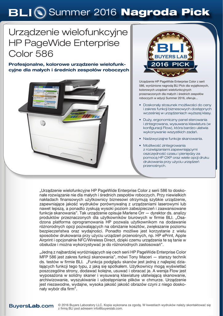 Summer 2016 Nagroda Pick BUYERS LAB BUYERS LAB Urządzenie wielofunkcyjne HP PageWide Enterprise Color 586 Profesjonalne, kolorowe urządzenie wielofunkcyjne dla małych i średnich zespołów roboczych Urządzenie HP PageWide Enterprise Color z serii 586, wyróżnione nagrodą BLI Pick dla wyjątkowych, kolorowych urządzeń wielofunkcyjnych przeznaczonych dla małych i średnich zespołów roboczych w edycji Summer 2016, oferuje... • Doskonały stosunek możliwości do ceny i zakres funkcji biznesowych dostępnych wcześniej w urządzeniach wyższej klasy. • Duży, ergonomiczny panel sterowania i zintegrowana, wysuwana klawiatura (w konfiguracji Flow), która bardzo ułatwia wykonywanie wszystkich zadań. • Nadzwyczajne funkcje skanowania. • Możliwość zintegrowania z rozwiązaniami zapewniającymi oszczędność czasu i pieniędzy za pomocą HP OXP oraz wiele opcji druku drukowania przy użyciu urządzeń przenośnych. „Urządzenie wielofunkcyjne HP PageWide Enterprise Color z serii 586 to doskonałe rozwiązanie nie dla małych i średnich zespołów roboczych. Przy niewielkich nakładach finansowych użytkownicy biznesowi otrzymują szybkie urządzenie, zapewniające jakość wydruków porównywalną z urządzeniami laserowymi lub nawet lepszą, a ponadto zyskują wysoki poziom zabezpieczeń i zaawansowane funkcje skanowania”. Tak urządzenie opisuje Marlene Orr — dyrektor ds. analizy produktów przeznaczonych dla użytkowników biurowych w firmie BLI. „Osadzona platforma oprogramowania HP pozwala użytkownikom na dodawanie różnorodnych opcji pozwalających na obniżanie kosztów, zwiększanie poziomu bezpieczeństwa oraz wydajności. Ponadto możliwe jest korzystanie z wielu sposobów drukowania przy użyciu urządzeń przenośnych, np. HP ePrint, Apple Airprint i opcjonalnie NFC/Wireless Direct, dzięki czemu urządzenia te są tanie w obsłudze i można wykorzystywać je do różnorodnych zastosowań”. „Jedną z najbardziej wyróżniających się cech serii HP PageWide Enterprise Color MFP 586 jest zakres funkcji skanowania”, mówi Tony Maceri — starszy technik ds. testów w firmie BLI. „Funkcja podglądu skanów jest jedną z najlepiej działających funkcji tego typu, z jaką się spotkałem. Użytkownicy mogą wyświetlać poszczególne strony, dodawać kolejne, usuwać i obracać je. A wersja Flow jest wyposażona w solidny skaner i wysuwaną klawiaturę ułatwiającą skanowanie, archiwizowanie, wyszukiwanie i udostępnianie plików w chmurze. Urządzenie jest niezawodne, wydajne, wysoka jakość jakość obrazów czyni z niego doskonały wybór dla firm”. BuyersLab.com © 2016 Buyers Laboratory LLC. Kopia wykonana za zgodą. W kwestiach wydruków należy skontaktować się z firmą BLI pod adresem [email protected]. 2016 Nagroda Pick BUYERS LAB BUYERS LAB Informacje o nagrodach „Pick” organizacji BLI Dwa razy do roku w dowód szczególnego uznania organizacja BLI przyznaje nagrody „Pick”. Nagradzane są produkty, które osiągnęły nadzwyczajne wyniki podczas wyczerpujących testów laboratoryjnych. Nagroda Wyjątkowe osiągnięcie jest przyznawana produktom lub funkcjom cechującym się innowacyjnością, użytecznością, wydajnością energetyczną lub doskonałą ceną. Nagrody BLI są przyznawane w oparciu o rygorystyczne testy laboratoryjne przeprowadzane przez około dwa miesiące. Proces oceniania obejmuje rozległy test wytrzymałościowy, podczas którego każde urządzenie pracuje w maksymalnym cyklu pracy podawanym przez producenta. Test wytrzymałościowy BLI jest wyjątkowy na tle wszystkich rankingów sprzętu biurowego, co powoduje, że rekomendacje BLI w zakresie niezawodności są szczególnie wartościowe dla nabywców oraz dyrektorów działów IT. Inne aspekty uwzględniane podczas testów to między innymi łatwość obsługi, wydajność, cena i obsługa nośników. Każdy produkt, który pomyślnie przejdzie testy laboratoryjne BLI, otrzymuje znak „Rekomendowane przez BLI” lub „Szczególnie rekomendowane przez BLI” oraz „Certyfikat niezawodności” a najlepsze produkty kwalifikują się do konkursu „Pick”. Jak widać nagrody „Pick” są bardzo zasłużonym wyróżnieniem, którym nabywcy i dyrektorzy IT mogą się kierować przy podejmowaniu decyzji o zakupie. Buyers Laboratory LLC • Ameryka Północna • Europa • Azja Gerry Stoia, CEO Deanna Flanick, CRO Brian O’Connor, CFO REDAKCJA Daria Hoffman, redaktor zarządzający [email protected] SPRZĘT Dr. Simon Plumtree, European Managing Editor [email protected] BuyersLab.com George Mikolay, Senior Product Editor, A3 MFPs [email protected] Marlene Orr, Senior Analyst, Printers and A4 MFPs [email protected] Lisa Reider, Senior Product Editor, Scanners and Environmental [email protected] Carl Schell, Senior Writer [email protected] Kaitlin Pendagast, Associate Editor [email protected] Priya Gohil, Senior Editor [email protected] Andrew Unsworth, Associate Editor [email protected] OPROGRAMOWANIE Jamie Bsales, Senior Product Editor, Solutions [email protected] Lee Davis, Research Editor [email protected] Robert Watts, Research Editor [email protected] © 2016 Buyers Laboratory LLC. Kopia wykonana za zgodą. LABORATORIUM Pete Emory, Director of U.S. Research and Lab Services David Sweetnam, Director of EMEA Research and Lab Services HANDEL Gerry O’Rourke, zarządzający, BLI International Mike Fergus, Vice President of Marketing T.R. Patrick, Art Director