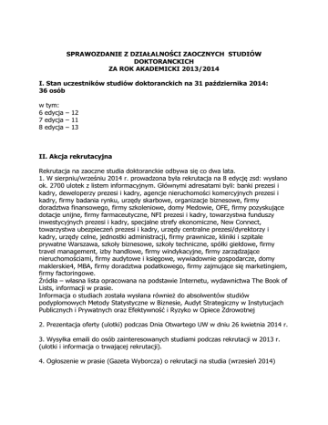 SPRAWOZDANIE Z DZIAŁALNOŚCI ZAOCZNYCH STUDIÓW DOKTORANCKICH ZA ROK AKADEMICKI 2013/2014 I. Stan uczestników studiów doktoranckich na 31 października 2014: 36 osób w tym: 6 edycja – 12 7 edycja – 11 8 edycja – 13 II. Akcja rekrutacyjna Rekrutacja na zaoczne studia doktoranckie odbywa się co dwa lata. 1. W sierpniu/wrześniu 2014 r. prowadzona była rekrutacja na 8 edycję zsd: wysłano ok. 2700 ulotek z listem informacyjnym. Głównymi adresatami byli: banki prezesi i kadry, deweloperzy prezesi i kadry, agencje nieruchomości komercyjnych prezesi i kadry, firmy badania rynku, urzędy skarbowe, organizacje biznesowe, firmy doradztwa finansowego, firmy szkoleniowe, domy Medowie, OFE, firmy pozyskujące dotacje unijne, firmy farmaceutyczne, NFI prezesi i kadry, towarzystwa funduszy inwestycyjnych prezesi i kadry, specjalne strefy ekonomiczne, New Connect, towarzystwa ubezpieczeń prezesi i kadry, urzędy centralne prezesi/dyrektorzy i kadry, urzędy celne, jednostki administracji, firmy prawnicze, kliniki i szpitale prywatne Warszawa, szkoły biznesowe, szkoły techniczne, spółki giełdowe, firmy travel management, izby handlowe, firmy windykacyjne, firmy zarządzające nieruchomościami, firmy audytowe i księgowe, wywiadownie gospodarcze, domy maklerskie4, MBA, firmy doradztwa podatkowego, firmy zajmujące się marketingiem, firmy factoringowe. Źródła – własna lista opracowana na podstawie Internetu, wydawnictwa The Book of Lists, informacji w prasie. Informacja o studiach została wysłana również do absolwentów studiów podyplomowych Metody Statystyczne w Biznesie, Audyt Strategiczny w Instytucjach Publicznych i Prywatnych oraz Efektywność i Ryzyko w Opiece Zdrowotnej 2. Prezentacja oferty (ulotki) podczas Dnia Otwartego UW w dniu 26 kwietnia 2014 r. 3. Wysyłka emaili do osób zainteresowanych studiami podczas rekrutacji w 2013 r. (ulotki i informacja o trwającej rekrutacji). 4. Ogłoszenie w prasie (Gazeta Wyborcza) o rekrutacji na studia (wrzesień 2014) III. Obronione doktoraty w okresie od 1 października 2013 do 31 października 2014: 1. Jacek Furga (2 edycja zsd); promotor prof. dr hab. W. Koziński 2. Kamil Kucharski (3 edycja zsd); promotor prof. dr hab. D. Dziuba 3. Joanna Zaliwska (2 edycja zsd); promotor prof. dr hab. J. Kudła IV. Otwarte przewody doktorskie w okresie od 1 października 2013 do 31 października 2014: 1. Joanna Hady (6 edycja); promotor prof. dr hab. K. Opolski 2. Ewa Stanisławska (7 edycja); promotor dr hab. R.Kokoszczyński, prof.UW V. Kursy, które odbyły się w roku akademickim 2013/2014 Wykładowcy na zaocznych studiach doktoranckich: 1. prof. M. Bednarski – metodyka zajęć dydaktycznych w ekonomii 2. dr M. Brzozowski – makroekonomia 3. prof. B. Górecki – metody badań ekonometrycznych 4. dr A. Górny - laboratorium metodologiczne 5. dr Ł. Hardt – historia myśli ekonomicznej 6. prof. R. Kokoszczyński/dr P. Boguszewski – rynki finansowe 7. prof. S. Kubielas/dr P. Boguszewski – finanse korporacji oraz polityka pieniężna 8. prof. J.J. Michałek – międzynarodowe stosunki finansowe 9. prof. W. Morawski – socjologia 10. prof. K. Opolski – strategie korporacji oraz seminaria doktorskie 11. prof. W. Otto – metody badań statystycznych 12. prof. W. Otto/dr A.Kulczycki – warsztaty zastosowań statystycznych 13. prof. P. Zapadka – prawo i finanse 14. prof. T. Żylicz/prof. M. Wiśniewski – mikroekonomia Kursy obowiązkowe Kurs Prowadzący Uczelnia/Firma Socjologia prof. W.Morawski Metody badań statystycznych prof. W.Otto Metody badań ekonometrycznych prof. B. Górecki Wyższa Szkoła Przedsiębiorczości i Zarządzania im. L.Koźmińskiego Wydział Nauk Ekonomicznych, Uniwersytet Warszawski Kursy dodatkowe Kurs Prowadzący Uczelnia/Firma Międzynarodowe stosunki finansowe prof. J.J.Michałek Metodyka zajęć dydaktycznych w ekonomii prof. M. Bednarski Prawo i finanse Zarządzanie strategiczne prof. P. Zapadka prof. K. Opolski Wydział Nauk Ekonomicznych, Uniwersytet Warszawski Wydział Nauk Ekonomicznych, Uniwersytet Warszawski Seminaria doktorskie prof. K. Opolski Wydział Nauk Ekonomicznych, Uniwersytet Warszawski Wydział Nauk Ekonomicznych, Uniwersytet Warszawski VI. Wywiązywanie się z obowiązków doktoranta 1. Egzaminy/zaliczenia: - mikroekonomia wyniki egzaminu: 1/4 – zaliczono 3/4 – nie zaliczono - ekonometria: Doktoranci mają do wyboru egzamin lub zaliczenie (na podstawie obecności na zajęciach) z ekonometrii/statystyki. 5/5 – zaliczono (egzamin) - statystyka - 9/11 – zaliczono (obecność na zajęciach) - 2/11 – nie zaliczono (obecność na zajęciach) 2. Otwarcie przewodu doktorskiego w okresie 1.10.2013 – 31.10.2014: 6 edycja: 1 os. na 12 7 edycja: 1 os. na 11 VIII. Udział w konferencjach 7 edycja 1. Mariola Węglińska, udział w tematycznych konferencjach: a) Warsaw International Banking Summit, 22 – 23 października 2013 b) VIII Kongres Ryzyka Bankowego, 7 listopada 2013 c) Konferencja Biura Informacji Kredytowej, 15- 16 maja 2014 2. Udział w seminariach i warsztatach: a) Centrum Debaty Publicznej „The Euro or not?” The European currency in CEE perspective, WNE, 5 marca 2014 IX. Seminaria doktoranckie Lp. Doktorant Promotor 1 prof. dr hab. Witold Koziński 2 3 mgr Jacek Furga 4 mgr Hubert Wiśniewski 5 mgr Joanna Zaliwska 6 Temat Oszczędzanie w kasach oszczędnościowo-budowlanych w gospodarkach wschodzących Europy Środkowej (lata 19922012) mgr Kamil Kucharski prof. dr hab. Dariusz Wpływ rozwiązań Dziuba technologicznych na efektywność gospodarowania zasobami nieruchomości w przedsiębiorstwach Uwarunkowania kulturowe mgr Piotr Szykowny dr hab., prof. UW Ryszard Kokoszczyński powstawania kryzysów mgr Małgorzata Leśniowska dr hab., prof. UW Wpływ wielkości Ryszard Kokoszczyński makroekonomicznych na zachowania indeksów giełdowych dr hab., prof. UW Ustalanie marży ryzyka Janusz Kudła kredytowego zgodnie z Nową Umową Kapitałową a dochodowo
