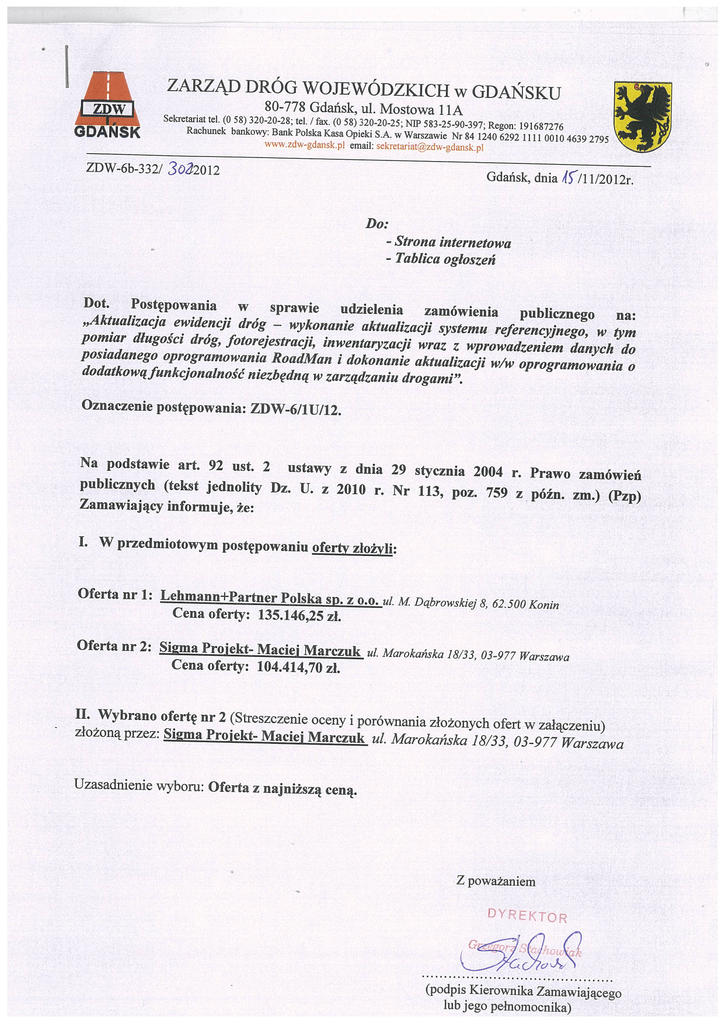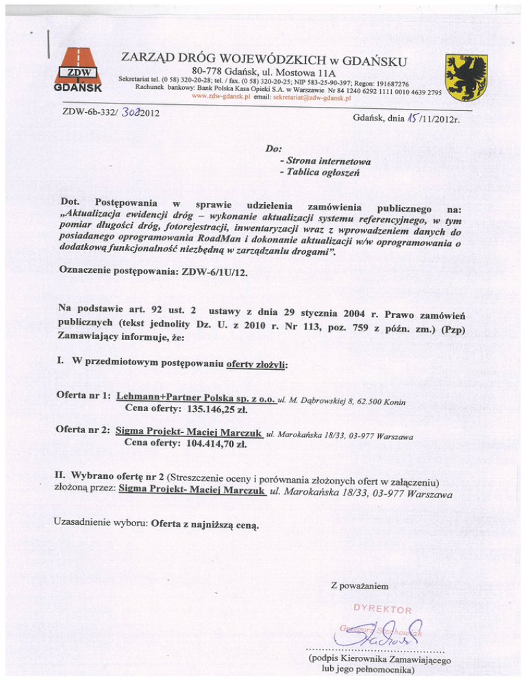 ZARZĄD DRÓG WOJEWÓDZMCH w GDAŃSKU w GDANSK . . :~. 80-778 Gdańsk, ul. Mostowa 1 1A :~ Sekretariat tel. (0 58) 320-20-28; tel. / fax. (0 58) 320-20-25; NIP 583-25-90-397; Regon: 191687276 .~ email: S.A. sekretariat®zdw~gdansk Rachunek bankowy:www Bankzdw-gdansk.pl Polska Kasa Opieki w Warszawie Nr 84 ~11240 6292 1111 0010 4639 2795~. .; . . „ „- . „. Gdańsk, dnia „f$”/i 1/2.0,.1~2f~.” :~ ZDW-6b-332/ 3032012 - - „< : -. ;:„. Strona internetowa Tablica ogłoszeń ~„ .. ;„ . ~„. „. . Dot. Postępówania w sprawie udzielenia zamówienia publicznego ~ng: „Aktualizacja ewidencji dróg wykonanie aktualizacji systemu referencyjnego,. w tym pomiar długości drog, fotorejestracji, inwentaryzacji wraz z wprowadzeniem danych do posiadanego oprogramowania RoadMan i dokonanie aktualizacji w/w•oprogramowania o dodatkowąfunkcjonalnosć niezbędną w zarządzaniu drogami” . „S” : .„ Do: „. . . . — :. .. - „ Oznaczenie postępowania ZDW-6/1 U/12 Na podstawie art 92 ust 2 ustawy z dnia 29 stycznia 2004 r Prawo zamÓw~ien publicznych (tekst jednolity Dz U z 2010 r Nr 113, poz 759 z pózn zm) (P~p)% Zamawiający informuje, że: . ~.„ I. W przedmiotowym postępowaniu oferty zlożvli: „.. Oferta nr 1: Lehmann-i-partner Polska sp. z o.o.ul. M Dąbrowskiej 8, 62.500 Konin Cena oferty: 135.146,25 zi. . „tt Oferta nr 2: Si2ma Projekt- Maciej Marczuk ul. Marokańska 18/33, 03-977 Warszawa Cena oferty: 104.414,70 zł. „ . ~„ ~. „ . „;~ „ „ ~•. : ;. .:~ .~„ . „„ . . ~. . .: . .. II. Wybrano ofertę nr 2 (Streszczenie oceny i porównania złożonych ofert w załączeniu) „ złożoną przez: ~ma Projekt- Maciej Marczuk ul. Marokańska 18/33, 03-977 Warszawa .„ ~. „ ~.„ Uzasadnienie wyboru: Oferta z najniższą ceną. .„ ~ Z pOWazanlem „ ~ .„ .„. ~ „ DYR E”króR ~ „:„:„~„~ (podpis Kierownika ~ąinaw1aJąc~go lub jego pelnomocnika)” ~ „ „ „ . ~ „~ :