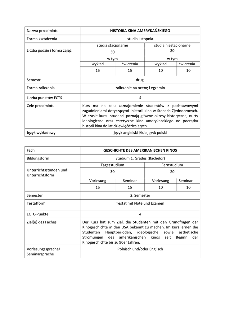 Nazwa przedmiotu HISTORIA KINA AMERYKAOSKIEGO Forma kształcenia studia I stopnia studia stacjonarne Liczba godzin i forma zajęd 30 studia niestacjonarne 20 w tym w tym wykład dwiczenia wykład 15 15 10 Semestr dwiczenia 10 drugi Forma zaliczenia zaliczenie na ocenę i egzamin Liczba punktów ECTS 4 Cele przedmiotu Kurs ma na celu zaznajomienie studentów z podstawowymi zagadnieniami dotyczącymi historii kina w Stanach Zjednoczonych. W czasie kursu studenci poznają główne okresy historyczne, nurty ideologiczne oraz estetyczne kina amerykaoskiego od początku historii kina do lat dziewięddziesiątych. Język wykładowy język angielski i/lub język polski Fach GESCHICHTE DES AMERIKANISCHEN KINOS Bildungsform Studium 1. Grades (Bachelor) Tagesstudium Fernstudium 30 20 Unterrichtsstunden und Unterrichtsform Semester Testatform ECTC-Punkte Ziel(e) des Faches Vorlesungssprache/ Seminarsprache Vorlesung Seminar Vorlesung 15 15 10 Seminar 10 2. Semester Testat mit Note und Examen 4 Der Kurs hat zum Ziel, die Studenten mit den Grundfragen der Kinogeschichte in den USA bekannt zu machen. Im Kurs lernen die Studenten Hauptperioden, ideologische sowie ästhetische Strömungen des amerikanischen Kinos seit Beginn der Kinogeschichte bis zu 90er Jahren. Polnisch und/oder Englisch