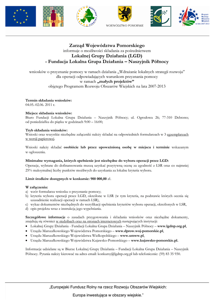 Zarząd Województwa Pomorskiego informuje o możliwości składania za pośrednictwem Lokalnej Grupy Działania (LGD) - Fundacja Lokalna Grupa Działania – Naszyjnik Północy wniosków o przyznanie pomocy w ramach działania „Wdrażanie lokalnych strategii rozwoju” dla operacji odpowiadających warunkom przyznania pomocy w ramach „małych projektów” objętego Programem Rozwoju Obszarów Wiejskich na lata 2007-2013 Termin składania wniosków: 04.05.-02.06. 2011 r. Miejsce składania wniosków: Biuro Fundacji Lokalna Grupa Działania – Naszyjnik Północy; ul. Ogrodowa 26; 77-310 Debrzno; od poniedziałku do piątku w godzinach 9:00 – 16:00; Tryb składania wniosków: Wnioski oraz wszystkie niezbędne załączniki należy składać na odpowiednich formularzach w 3 egzemplarzach w wersji papierowej. Wnioski należy składać osobiście lub przez upoważnioną osobę w miejscu i terminie wskazanym w ogłoszeniu. Minimalne wymagania, których spełnienie jest niezbędne do wyboru operacji przez LGD: Operacje, wybrane do dofinansowania muszą uzyskać pozytywną ocenę za zgodność z LSR oraz co najmniej 25% maksymalnej liczby punktów możliwych do uzyskania za lokalne kryteria wyboru. Limit środków dostępnych w konkursie: 900 000,00 zł. W załączeniu: a) wzór formularza wniosku o przyznanie pomocy; b) kryteria wyboru operacji przez LGD, określone w LSR (w tym kryteria, na podstawie których ocenia się uzasadnienie realizacji operacji w ramach LSR), c) wykaz dokumentów niezbędnych do weryfikacji spełnienia kryteriów wyboru operacji, określonych w LSR, d) opis projektu wraz z instrukcją jego wypełniania. Szczegółowe informacje o zasadach przygotowania i składania wniosków oraz niezbędne dokumenty, znajdują się również w siedzibach oraz na stronach internetowych następujących instytucji: Lokalnej Grupy Działania - Fundacji Lokalna Grupa Działania – Naszyjnik Północy – www.lgdnp.org.pl, Urzędu Marszałkowskiego Województwa Pomorskiego – www.dprow.woj-pomorskie.pl, Urzędu Marszałkowskiego Województwa Wielkopolskiego – www.umww.pl, Urzędu Marszałkowskiego Województwa Kujawsko-Pomorskiego – www.kujawsko-pomorskie.pl. Informacje udzielane są w Biurze Lokalnej Grupy Działania – Fundacji Lokalna Grupa Działania – Naszyjnik Północy. Pytania należy kierować na adres email: [email protected] lub telefonicznie: (59) 83 35 930. „Europejski Fundusz Rolny na rzecz Rozwoju Obszarów Wiejskich: Europa inwestująca w obszary wiejskie.”