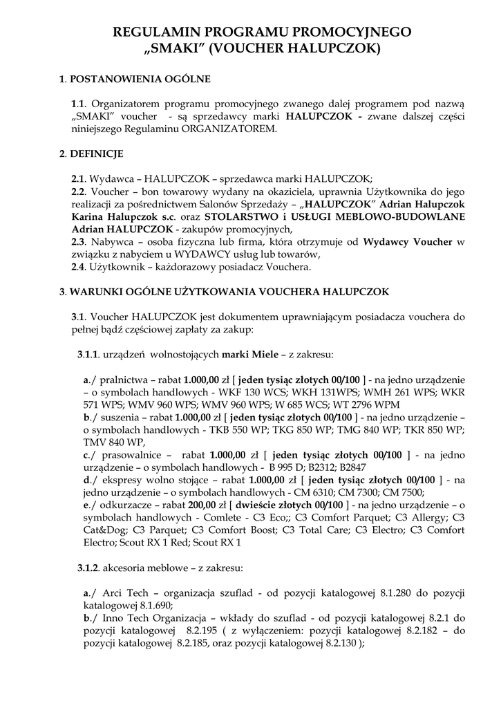 REGULAMIN PROGRAMU PROMOCYJNEGO „SMAKI” (VOUCHER HALUPCZOK) 1. POSTANOWIENIA OGÓLNE 1.1. Organizatorem programu promocyjnego zwanego dalej programem pod nazwą „SMAKI” voucher - są sprzedawcy marki HALUPCZOK - zwane dalszej części niniejszego Regulaminu ORGANIZATOREM. 2. DEFINICJE 2.1. Wydawca – HALUPCZOK – sprzedawca marki HALUPCZOK; 2.2. Voucher – bon towarowy wydany na okaziciela, uprawnia Użytkownika do jego realizacji za pośrednictwem Salonów Sprzedaży – „HALUPCZOK” Adrian Halupczok Karina Halupczok s.c. oraz STOLARSTWO i USŁUGI MEBLOWO-BUDOWLANE Adrian HALUPCZOK - zakupów promocyjnych, 2.3. Nabywca – osoba fizyczna lub firma, która otrzymuje od Wydawcy Voucher w związku z nabyciem u WYDAWCY usług lub towarów, 2.4. Użytkownik – każdorazowy posiadacz Vouchera. 3. WARUNKI OGÓLNE UŻYTKOWANIA VOUCHERA HALUPCZOK 3.1. Voucher HALUPCZOK jest dokumentem uprawniającym posiadacza vouchera do pełnej bądź częściowej zapłaty za zakup: 3.1.1. urządzeń wolnostojących marki Miele – z zakresu: a./ pralnictwa – rabat 1.000,00 zł [ jeden tysiąc złotych 00/100 ] - na jedno urządzenie – o symbolach handlowych - WKF 130 WCS; WKH 131WPS; WMH 261 WPS; WKR 571 WPS; WMV 960 WPS; WMV 960 WPS; W 685 WCS; WT 2796 WPM b./ suszenia – rabat 1.000,00 zł [ jeden tysiąc złotych 00/100 ] - na jedno urządzenie – o symbolach handlowych - TKB 550 WP; TKG 850 WP; TMG 840 WP; TKR 850 WP; TMV 840 WP, c./ prasowalnice – rabat 1.000,00 zł [ jeden tysiąc złotych 00/100 ] - na jedno urządzenie – o symbolach handlowych - B 995 D; B2312; B2847 d./ ekspresy wolno stojące – rabat 1.000,00 zł [ jeden tysiąc złotych 00/100 ] - na jedno urządzenie – o symbolach handlowych - CM 6310; CM 7300; CM 7500; e./ odkurzacze – rabat 200,00 zł [ dwieście złotych 00/100 ] - na jedno urządzenie – o symbolach handlowych - Comlete - C3 Eco;; C3 Comfort Parquet; C3 Allergy; C3 Cat&Dog; C3 Parquet; C3 Comfort Boost; C3 Total Care; C3 Electro; C3 Comfort Electro; Scout RX 1 Red; Scout RX 1 3.1.2. akcesoria meblowe – z zakresu: a./ Arci Tech – organizacja szuflad - od pozycji katalogowej 8.1.280 do pozycji katalogowej 8.1.690; b./ Inno Tech Organizacja – wkłady do szuflad - od pozycji katalogowej 8.2.1 do pozycji katalogowej 8.2.195 ( z wyłączeniem: pozycji katalogowej 8.2.182 – do pozycji katalogowej 8.2.185, oraz pozycji katalogowej 8.2.130 ); c./ Systemy segregacji śmieci – pozycje katalogowe: 10.9, 10.10, 10.11,10.28 oraz pozycja 10.29; d./ Krajalnica, chlebak, toster, czajnik - pozycje katalogowe: 11.1.60, 11.1.61, 11.62, 11.1.65, 11.1.66 oraz pozycja 11.1.67 - na które ORGANIZATOR udziela 25 % ( dwadzieścia pięć procent ) rabatu od wartości „katalogowej; 3.1.3. mebli nietypowych – realizowanych przez HALUPCZOK na indywidualne zamówienie - na które ORGANIZATOR udziela 10 % ( dziesięć procent ) rabatu od wartości wyceny. 3.2. Jeżeli wartość urządzeń i/lub akcesoria, i / lub mebli nietypowych przekracza wartość VOUCHERA, użytkownik VOUCHERA ma prawo do wykorzystania VOUCHERA jako częściowej zapłaty za urządzeń i/lub akcesoria, i / lub mebli nietypowych, przy czym VOUCHER stanowi jedynie uzupełnienie zapłaty do wartości nominalnej na jaką opiewa. VOUCHERÓW nie można łączyć celem zapłaty za jedno urządzeń i/lub akcesoria, i / lub mebli nietypowych. 3.3. Jeżeli wartość VOUCHERA przekracza wartość urządzeń i/lub akcesoria, i / lub mebli nietypowych, pozostałe po zakupie urządzeń i/lub akcesoria, i / lub mebli nietypowych środki nie mogą zostać wykorzystane do następnej pełnej bądź częściowej zapłaty za towary i usługi dostępne w Salonach Sprzedaży HALUPCZOK, a VOUCHER i prawa z niego wynikające wygasają. 3.4. Posiadaczem VOUCHERA jest osoba wskazana przez podmiot nabywający VOUCHER i posługująca się nim w procesie zakupu urządzeń i/lub akcesoria, i / lub mebli nietypowych. 3.5. VOUCHER nie może być zamieniony ani w całości ani w części na gotówkę. 3.6. HALUPCZOK ma prawo odmówić realizacji vouchera w następujących przypadkach: 3.6.1. upływu terminu ważności VOUCHERA 3.6.2. uszkodzenia VOUCHERA w stopniu uniemożliwiającym identyfikacji danych zawartych na VOUCHERZE; 3.7. W przypadku wyczerpania urządzeń i/lub akcesoria, i / lub mebli nietypowych, na które opiewa VOUCHER, HALUPCZOK zobowiązuje się do zapewnienia urządzeń i/lub akcesoria, i / lub mebli nietypowych o cechach i jakości co najmniej podobnych. 4. WARUNKI UCZESTNICTWA W PROGRAMIE HALUPCZOK nie ponosi odpowiedzialności za: 1./ brak możliwości skorzystania przez HALUPCZOK z programu z przyczyn nieleżących po stronie HALUPCZOK, 2./ szkody powstałe w skutek podania nieprawdziwych danych przez UCZESTNIKA programu. 5. GWARANCJA Gwarancja na zakupione urządzeń i/lub akcesoria, i / lub mebli nietypowych udzielana jest na zasadach ogólnych – zgodnie z odrębnie zawartą umową. 6. REKLAMACJE DOTYCZĄCE PROGRAMU 6.1. Reklamacje związane z Programem mogą być zgłaszane wyłącznie listem poleconym przesyłanym na adres: STOLARSTWO i USŁUGI MEBLOWOBUDOWLANE Adrian HALUPCZOK - z siedzibą w Krzyżowej Dolinie przy ul. Poprzecznej 17A. 6.2. Pisemne reklamacje powinny zawierać pełne dane reklamującego i dokładny adres korespondencyjny, jak również dokładny opis i wskazanie przyczyny reklamacji. 6.3. Reklamacje rozpatrywane będą przez HALUPCZOK w terminie 14 dni od dnia ich otrzymania. UCZESTNIK zostanie powiadomiony o decyzji listem poleconym, wysłanym na adres podany w reklamacji, w terminie 14 dni od daty rozpatrzenia reklamacji. 7. PRZETWARZANIE DANYCH OSOBOWYCH 7.1. Dane osobowe uczestników Promocji przetwarzane będą przy zachowaniu zasad określonych w Ustawie o ochronie danych osobowych (Dz. U. z 1997 r. Nr 133, poz. 883). Administratorem danych osobowych udostępnionych przez UCZESTNIKÓW Programu będzie STOLARSTWO i USŁUGI MEBLOWO-BUDOWLANE Adrian HALUPCZOK, z siedzibą w 