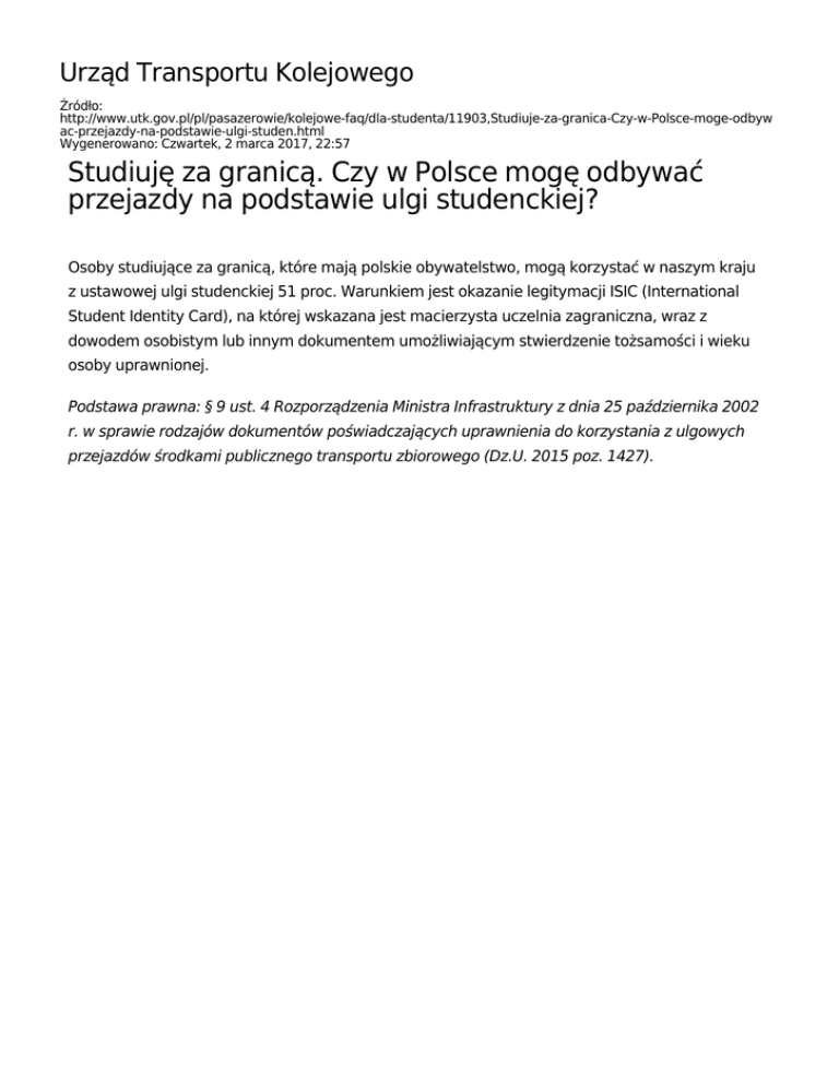 Urząd Transportu Kolejowego Źródło: http://www.utk.gov.pl/pl/pasazerowie/kolejowe-faq/dla-studenta/11903,Studiuje-za-granica-Czy-w-Polsce-moge-odbyw ac-przejazdy-na-podstawie-ulgi-studen.html Wygenerowano: Czwartek, 2 marca 2017, 22:57 Studiuję za granicą. Czy w Polsce mogę odbywać przejazdy na podstawie ulgi studenckiej? Osoby studiujące za granicą, które mają polskie obywatelstwo, mogą korzystać w naszym kraju z ustawowej ulgi studenckiej 51 proc. Warunkiem jest okazanie legitymacji ISIC (International Student Identity Card), na której wskazana jest macierzysta uczelnia zagraniczna, wraz z dowodem osobistym lub innym dokumentem umożliwiającym stwierdzenie tożsamości i wieku osoby uprawnionej. Podstawa prawna: § 9 ust. 4 Rozporządzenia Ministra Infrastruktury z dnia 25 października 2002 r. w sprawie rodzajów dokumentów poświadczających uprawnienia do korzystania z ulgowych przejazdów środkami publicznego transportu zbiorowego (Dz.U. 2015 poz. 1427).