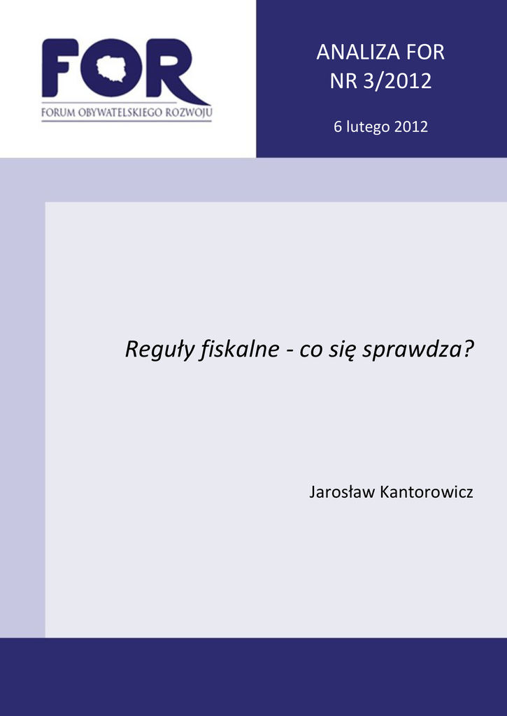 ANALIZA FOR NR 3/2012 6 lutego 2012 Reguły fiskalne - co się sprawdza? Jarosław Kantorowicz Reguły fiskalne – co się sprawdza?1 Synteza Kryzys finansów publicznych, panujący obecnie w Unii Europejskiej, wywołany został między innymi przez ekspansywną politykę fiskalną, prowadzoną we wcześniejszych okresach, w tym zwłaszcza w czasach koniunktury. Wysoki dług publiczny podważył wiarygodnośd kredytową krajów UE. Zaufanie rynków można jednak odzyskad przez głębokie reformy finansów publicznych. Trwałośd tych reform w dużym stopniu zależy od efektywności krajowych ram fiskalnych, których podstawowym elementem są reguły fiskalne. Reguły fiskalne są skutecznym narzędziem temperującym skłonnośd rządzących do generowania nadmiernych deficytów. By spełniały swoją korygującą funkcję, nie wystarczy jednak samo ich wprowadzenie. Skuteczne reguły fiskalne muszą byd wiarygodne. Powinny obejmowad cały sektor finansów publicznych, byd relatywnie proste i elastyczne, a także zawierad klauzule wyjścia, mechanizmy monitoringu oraz procedury egzekucyjne. Efektywnośd reguł zwiększa się, gdy są one sformalizowane, czyli zapisane w prawie. Na świecie stosuje się cztery typy reguł fiskalnych: zrównoważonego budżetu, wydatkowe, dochodowe oraz długu. Według Międzynarodowego Funduszu Walutowego najskuteczniejsze są reguły zrównoważonego budżetu oparte na saldzie strukturalnym i w cyklu oraz reguły wydatkowe. Reguły zrównoważonego budżetu są efektywne w ograniczaniu długu oraz stabilizacji gospodarczej. Zaletą reguły wydatkowej jest ograniczanie roli paostwa w gospodarce. Aż 20 proc. krajów, które przeprowadziły istotną konsolidację fiskalną w ostatnich latach, miały obie te reguły. Skutecznośd reguł zrównoważonego budżetu oraz reguł wydatkowych potwierdzają badania naukowe oraz przykłady takich krajów jak Chile i Estonia (utrzymujących niski poziom zadłużenia od kilkunastu lat) oraz Szwajcaria i Szwecja (skutecznie ograniczających zadłużenie). 1 Za uwagi do tekstu autor pragnie podziękowad Andrzejowi Krajewskiemu, Aleksandrowi Łaszkowi oraz Andrzejowi Rzoocy. W 2010 r. deficyt sektora finansów publicznych w Polsce osiągnął poziom 7,8 proc. PKB, najwyższy od 1991 r. To oznacza, że obowiązujące w naszym kraju ramy fiskalne są mało skuteczne w ograniczaniu skłonności rządzących do generowania nadmiernych deficytów. Jako dopełnienie krajowych ram fiskalnych, pilnie zaleca się zatem wprowadzenie w Polsce reguły zrównoważonego budżetu oraz reguły wydatkowej, które okazały się skuteczne w innych krajach. Należy także wprowadzid silne mechanizmy monitorowania pozycji fiskalnej kraju oraz zwiększyd zainteresowanie opinii publicznej polityką budżetową. Ten cel może byd zrealizowany przez wprowadzenie w Polsce Rady Fiskalnej. 1. Obecny kryzys finansów publicznych jest efektem ekspansywnej polityki fiskalnej prowadzonej we wcześniejszych okresach,… Wprowadzenie Kryzys finansów publicznych (FP), panujący obecnie w Unii Europejskiej (UE), wywołany został przede wszystkim przez ekspansywną politykę fiskalną, prowadzoną we wcześniejszych okresach, w tym zwłaszcza w czasach koniunktury. W okresach spowolnienia gospodarczego rządy zaciągały długi, których nie spłacano w czasach prosperity, wciągając kraje w spiralę zadłużenia. Obecny kryzys w dużym …stymulacji fiskalnej lat 2008-2009 oraz… stopniu jest także efektem krótkowzrocznej polityki stymulacji fiskalnej lat 2008- …zbyt dużej swobody działania automatycznych stabilizatorów. działania automatycznych stabilizatorów koniunktury2 bez pewności, że spadek Wysoki dług publiczny podważył wiarygodnośd kredytową krajów UE. Głębokie reformy finansów publicznych mogą przywrócid zaufanie rynków. 2009. Wpływ na eskalację zadłużenia miało również pozostawienie swobody produktu był przejściowy. Jedną z konsekwencji eksplozji długu publicznego w latach 2010-2011 (w krajach starej UE średnio do 85 proc. PKB), jest większa podatnośd gospodarek krajów strefy euro na kryzys zaufania ze strony rynków finansowych. Wysoki dług publiczny podważył wiarygodnośd kredytową paostw UE. Głębokie reformy finansów publicznych, zwłaszcza ograniczenie wydatków publicznych, mogą jednak przywrócid zaufanie rynków. Skutecznośd i trwałośd tych reform jest w dużym stopniu zależna od efektywności krajowych ram fiskalnych, których podstawowym elementem są Trwałośd tych reform w dużym stopniu zależy od efektywności reguł fiskalnych. 2. Reguły fiskalne ograniczają uznaniowośd polityczną w odniesieniu do polityki budżetowej i… 2 wiarygodne reguły fiskalne. Jakie reguły fiskalne stosuje się na świecie? Reguły fiskalne polegają na trwałym ograniczeniu uznaniowości politycznej w prowadzeniu polityki fiskalnej. Wyrażone są przy pomocy numerycznych limitów nałożonych na agregaty fiskalne (zob. Kopits i Symansky, 1998). Opracowania naukowe3 wskazują, że wiarygodne reguły fiskalne przyczyniają się do ograniczenia Automatyczne stabilizatory koniunktury to mechanizmy polityki fiskalnej stymulujące zagregowany popyt, gdy gospodarka znajduje się w fazie spowolnienia lub recesji. Stymulowanie popytu za pomocą automatycznych stabilizatorów nie wymaga żadnych decyzji politycznych. Najważniejszym automatycznym stabilizatorem koniunktury jest system podatkowy i wydatki publiczne. Wskutek spadku aktywności gospodarczej wpływy podatkowe zmniejszają się, gdyż są one pozytywnie skorelowane z fazami cyklu koniunkturalnego. Inaczej jest w przypadku wydatków publicznych zwiększających się w okresach gorszej koniunktury. W okresach spowolnienia zwiększa się przecież liczba osób ubiegających się o zasiłki dla bezrobotnych i inne formy pomocy społecznej (zob. np. Mankiw, 2009). 3 Zob. np. Kiewet i Szakaly (1996), Feld i Kirchgässner (2006), Primo (2007), Debrun 