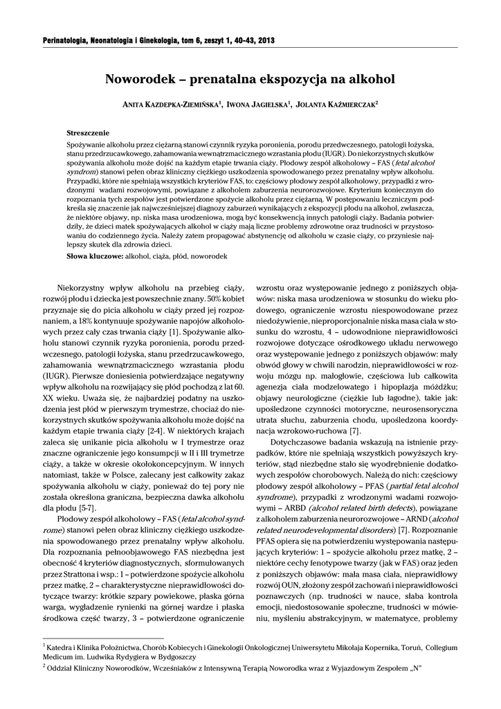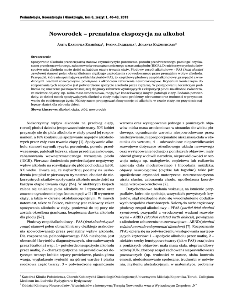 Perinatologia, Neonatologia i Ginekologia, tom 6, zeszyt 1, 40-43, 2013 Noworodek – prenatalna ekspozycja na alkohol ANITA KAZDEPKA-ZIEMIŃSKA1, IWONA JAGIELSKA1, JOLANTA KAŹMIERCZAK2 Streszczenie Spożywanie alkoholu przez ciężarną stanowi czynnik ryzyka poronienia, porodu przedwczesnego, patologii łożyska, stanu przedrzucawkowego, zahamowania wewnątrzmacicznego wzrastania płodu (IUGR). Do niekorzystnych skutków spożywania alkoholu może dojść na każdym etapie trwania ciąży. Płodowy zespół alkoholowy – FAS (fetal alcohol syndrom) stanowi pełen obraz kliniczny ciężkiego uszkodzenia spowodowanego przez prenatalny wpływ alkoholu. Przypadki, które nie spełniają wszystkich kryteriów FAS, to: częściowy płodowy zespół alkoholowy, przypadki z wrodzonymi wadami rozwojowymi, powiązane z alkoholem zaburzenia neurorozwojowe. Kryterium koniecznym do rozpoznania tych zespołów jest potwierdzone spożycie alkoholu przez ciężarną. W postępowaniu leczniczym podkreśla się znaczenie jak najwcześniejszej diagnozy zaburzeń wynikających z ekspozycji płodu na alkohol, zwłaszcza, że niektóre objawy, np. niska masa urodzeniowa, mogą być konsekwencją innych patologii ciąży. Badania potwierdziły, że dzieci matek spożywających alkohol w ciąży mają liczne problemy zdrowotne oraz trudności w przystosowaniu do codziennego życia. Należy zatem propagować abstynencję od alkoholu w czasie ciąży, co przyniesie najlepszy skutek dla zdrowia dzieci. Słowa kluczowe: alkohol, ciąża, płód, noworodek Niekorzystny wpływ alkoholu na przebieg ciąży, rozwój płodu i dziecka jest powszechnie znany. 50% kobiet przyznaje się do picia alkoholu w ciąży przed jej rozpoznaniem, a 18% kontynuuje spożywanie napojów alkoholowych przez cały czas trwania ciąży [1]. Spożywanie alkoholu stanowi czynnik ryzyka poronienia, porodu przedwczesnego, patologii łożyska, stanu przedrzucawkowego, zahamowania wewnątrzmacicznego wzrastania płodu (IUGR). Pierwsze doniesienia potwierdzające negatywny wpływ alkoholu na rozwijający się płód pochodzą z lat 60. XX wieku. Uważa się, że najbardziej podatny na uszkodzenia jest płód w pierwszym trymestrze, chociaż do niekorzystnych skutków spożywania alkoholu może dojść na każdym etapie trwania ciąży [2-4]. W niektórych krajach zaleca się unikanie picia alkoholu w I trymestrze oraz znaczne ograniczenie jego konsumpcji w II i III trymetrze ciąży, a także w okresie okołokoncepcyjnym. W innych natomiast, także w Polsce, zalecany jest całkowity zakaz spożywania alkoholu w ciąży, ponieważ do tej pory nie została określona graniczna, bezpieczna dawka alkoholu dla płodu [5-7]. Płodowy zespół alkoholowy – FAS (fetal alcohol syndrome) stanowi pełen obraz kliniczny ciężkiego uszkodzenia spowodowanego przez prenatalny wpływ alkoholu. Dla rozpoznania pełnoobjawowego FAS niezbędna jest obecność 4 kryteriów diagnostycznych, sformułowanych przez Strattona i wsp.: 1 – potwierdzone spożycie alkoholu przez matkę, 2 – charakterystyczne nieprawidłowości dotyczące twarzy: krótkie szpary powiekowe, płaska górna warga, wygładzenie rynienki na górnej wardze i płaska środkowa część twarzy, 3 – potwierdzone ograniczenie wzrostu oraz występowanie jednego z poniższych objawów: niska masa urodzeniowa w stosunku do wieku płodowego, ograniczenie wzrostu niespowodowane przez niedożywienie, nieproporcjonalnie niska masa ciała w stosunku do wzrostu, 4 – udowodnione nieprawidłowości rozwojowe dotyczące ośrodkowego układu nerwowego oraz występowanie jednego z poniższych objawów: mały obwód głowy w chwili narodzin, nieprawidłowości w rozwoju mózgu np. małogłowie, częściowa lub całkowita agenezja ciała modzelowatego i hipoplazja móżdżku; objawy neurologiczne (ciężkie lub łagodne), takie jak: upośledzone czynności motoryczne, neurosensoryczna utrata słuchu, zaburzenia chodu, upośledzona koordynacja wzrokowo-ruchowa [7]. Dotychczasowe badania wskazują na istnienie przypadków, które nie spełniają wszystkich powyższych kryteriów, stąd niezbędne stało się wyodrębnienie dodatkowych zespołów chorobowych. Należą do nich: częściowy płodowy zespół alkoholowy – PFAS (partial fetal alcohol syndrome), przypadki z wrodzonymi wadami rozwojowymi – ARBD (alcohol related birth defects), powiązane z alkoholem zaburzenia neurorozwojowe – ARND (alcohol related neurodevelopmental disorders) [7]. Rozpoznanie PFAS opiera się na potwierdzeniu występowania następujących kryteriów: 1 – spożycie alkoholu przez matkę, 2 – niektóre cechy fenotypowe twarzy (jak w FAS) oraz jeden z poniższych objawów: mała masa ciała, nieprawidłowy rozwój OUN, złożony zespół zachowań i nieprawidłowości poznawczych (np. trudności w nauce, słaba kontrola emocji, niedostosowanie społeczne, trudności w mówieniu, myśleniu abstrakcyjnym, w matematyce, problemy 1 Katedra i Klinika Położnictwa, Chorób Kobiecych i Ginekologii Onkologicznej Uniwersytetu Mikołaja Kopernika, Toruń, Collegium Medicum im. Ludwika Rydygiera w Bydgoszczy 2 Oddział Kliniczny Noworodków, Wcześniaków z Intensywną Terapią Noworodka wraz z Wyjazdowym Zespołem „N” Noworodek – prenatalna ekspozycja na alkohol z pamięcią, skupieniem uwagi, osądem sytuacji), nie dający się wytłumaczyć podłożem genetycznym lub warunkami środowiskowymi [8]. Do rozpoznania ARBD muszą być spełnione następujące warunki: 1 – potwierdzone spożycie alkoholu przez matkę; 2 – jedna lub więcej wad wrodzonych, np. serca, kości, nerek, wzroku lub narządu słuchu. ARND obejmuje przypadki spełniające poniższe kryteria diagnostyczne: 1 – potwierdzone spożycie alkoholu przez matkę, 2 – nieprawidłowości neurorozwojowe , takie jakie występują w FAS lub/i 3 – złożony zespół zaburzeń zachowania lub poznawczych (jak w PFAS). Riley i wsp. zwrócili uwagę na istnienie