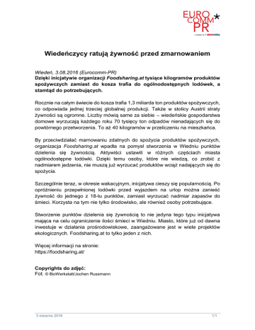 Wiedeńczycy ratują żywność przed zmarnowaniem Wiedeń, 3.08.2016 (Eurocomm-PR) Dzięki inicjatywie organizacji Foodsharing.at tysiące kilogramów produktów spożywczych zamiast do kosza trafia do ogólnodostępnych lodówek, a stamtąd do potrzebujących. Rocznie na całym świecie do kosza trafia 1,3 miliarda ton produktów spożywczych, co odpowiada jednej trzeciej globalnej produkcji. Także w stolicy Austrii straty żywności są ogromne. Liczby mówią same za siebie — wiedeńskie gospodarstwa domowe wyrzucają każdego roku 70 tysięcy ton odpadów nienadających się do powtórnego przetworzenia. To aż 40 kilogramów w przeliczeniu na mieszkańca. By przeciwdziałać marnowaniu zdatnych do spożycia produktów spożywczych, organizacja Foodsharing.at wpadła na pomysł stworzenia w Wiedniu punktów dzielenia się żywnością. Aktywiści ustawili w różnych częściach miasta ogólnodostępne lodówki. Dzięki temu osoby, które nie wiedzą, co zrobić z nadmiarem jedzenia, nie muszą już wyrzucać produktów wciąż nadających się do spożycia. Szczególnie teraz, w okresie wakacyjnym, inicjatywa cieszy się popularnością. Po opróżnieniu przepełnionej lodówki przed wyjazdem na urlop można zanieść żywność do jednego z 18-tu punktów, zamiast wyrzucać nadmiar zapasów do śmieci. Korzysta na tym nie tylko środowisko, ale również osoby potrzebujące. Stworzenie punktów dzielenia się żywnością to nie jedyna tego typu inicjatywa mająca na celu ograniczenie ilości śmieci w Wiedniu. Miasto, które już od dawna inwestuje w działania prośrodowiskowe, zaangażowane jest w wiele projektów ekologicznych. Foodsharing.at to tylko jeden z nich. Więcej informacji na stronie: https://foodsharing.at/ Copyrights do zdjęć: Fot. © BioWerkstatt/Jochen Russmann 3 sierpnia 2016 1/1