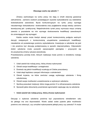 Dlaczego warto się szkolić ? Zmiany zachodzące na rynku pracy nie dają w chwili obecnej gwarancji zatrudnienia , zarówno osobom posiadającym wysokie wykształcenie czy wieloletnie doświadczenie zawodowe. Bycie konkurencyjnym na rynku pracy wymaga nieustannego dokształcania i doskonalenia oraz pogłębiania swojej wiedzy zarówno teoretycznej jak i praktycznej. Niejednokrotnie rynek pracy wymusza wręcz zmianę zawodu a pozostanie na nim wymaga dostosowania kwalifikacji zawodowych do zmieniających się wymagań. KaŜda osoba moŜe kiedyś stanąć przed koniecznością podjęcia waŜnych decyzji związanych z koniecznością uzupełnienia posiadanych kwalifikacji, niezaleŜnie od posiadanego poziomu wykształcenia. Inwestycja w szkolenie nie jest i nie powinna być decyzją podejmowaną w sposób nieprzemyślany. Odpowiedni dobór szkolenia moŜe pozwolić zaoszczędzić pieniądze i przyczynić się do pozytywnej zmiany sytuacji zawodowej. Przedstawiamy poniŜej kroki, których realizacja moŜe pomóc w określeniu rodzaju szkolenia. 1. Ustal zawód lub rodzaj pracy, którą chcesz wykonywać 2. Określ swoje kwalifikacje i umiejętności 3. Dowiedz się jakich kwalifikacji oczekują od Ciebie pracodawcy 4. Ustal skąd będziesz czerpać informacje o szkoleniach 5. Określ kryteria, na które zwrócisz uwagę wybierając szkolenie i firmę szkoleniową 6. Określ swoje moŜliwości uczestniczenia w wybranym szkoleniu 7. Spróbuj poszukać instytucji, które mogą pomóc Ci w sfinansowaniu szkolenia 8. Sprawdź jakie dokumenty powinieneś zgromadzić zapisując się na szkolenie 1. Ustal zawód lub rodzaj pracy, którą chcesz wykonywać Decyzja o wyborze szkolenia powinna być poprzedzona określeniem celu do jakiego ma ono doprowadzić. Warto zadać sobie pytanie jakie moŜliwości powinno ono stworzyć, czy umoŜliwi wykonywanie jakiejś pracy czy zawodu? A moŜe przyczyni się do zwiększenia zakresu moŜliwości w ramach zawodu juŜ posiadanego? Jeśli tak to w jakim zakresie? Kształcenie jest inwestowaniem w przyszłość, musi zatem opierać się na jakiejś strategii, długookresowych planach. WaŜne jest określenie co moŜna dzięki szkoleniu uzyskać, jakie korzyści osiągnąć, jakie moŜliwości pojawią się po jego ukończeniu. Samo szkolenie stanie się wtedy narzędziem prowadzącym do realizacji celu. Cele wskazują jakie zmiany powinny być wynikiem szkolenia. W przypadku trudności z określeniem celów czy preferencji zawodowych moŜna skorzystać z pomocy doradców zawodowych. Pracują oni np. w Centrach Informacji i Planowania Kariery Zawodowej Wojewódzkich Urzędów Pracy. Jeśli na tym etapie potrzebne są informacje o zawodach (np. jakie zadania wykonuje osoba pracująca w tym zawodzie, jakich kwalifikacji wymaga dany zawód itp.) warto skorzystać z Klasyfikacji Zawodów i Specjalności, zawierającej krótkie opisy zawodów. MoŜna ją znaleźć np. na stronie internetowej www.psz.praca.gov.pl. W Centrach Informacji i Planowania Kariery Zawodowej doradcy zawodowi udostępniają takŜe Przewodniki po Zawodach oraz inne opracowania opisujące zawody. 2. Określ swoje kwalifikacje i umiejętności Dokonanie bilansu własnych kompetencji pomaga poznać aktualne moŜliwości zawodowe, oraz ocenić w jakim miejscu znajdujemy się na chwilę obecną: co juŜ wiemy, potrafimy a czego nam brakuje aby osiągnąć cel określony w kroku 1. PoniŜsze pytania powinny pomóc dokonać takiej analizy: • jakie wykształcenie posiadasz? • Jakie umiejętności zawodowe juŜ zdobyłeś/aś ? • czy posiadasz doświadczenie zawodowe? • czy twoje doświadczenie jest zgodne z kierunkiem kształcenia jaki ukończyłeś/aś? • czy posiadasz dodatkowe kwalifikacje, kursy lub szkolenia? • jakie są twoje oczekiwania w stosunku do pracy zawodowej? • jaki jest stan Twojego zdrowia ? • jakie jest twoje hobby, zainteresowania? Z tego mogą płynąć kolejne wnioski, np.: • dlaczego szkolenie jest potrzebne? • jaki problem powinno rozwiązać? • jak długo występuje ten problem i co jest jego przyczyną? • jak szkolenie moŜe pomóc w rozwiązaniu danego problemu? MoŜe się okazać Ŝe szkolenie nie będzie lekiem na wszystkie bolączki a rozwiązanie problemu wymaga szeregu dodatkowych działań. Po zapoznaniu się ze swoimi mocnymi stronami, zainteresowaniami i słabościami, powinniśmy wziąć pod uwagę otoczenie zewnętrzne, a konkretnie takie jego składniki jak: sytuacja gospodarcza, sytuacja na rynku pracy, zapotrzebowanie na pracowników, zapotrzebowanie na określone kwalifikacje, umiejętności itd. Największa gdy bowiem środowisko szansa zewnętrzne na osiągnięcie sprzyja dobrych naszemu wyników rozwojowi. jest Warto wtedy, śledzić technologiczne nowości, zmiany społeczne oraz polityczne i na tej podstawie wyciągać wnioski o tworzeniu się nowych stanowisk pracy oraz nowych zawodów. Rynek pracy ewoluuje bowiem ostatnimi czasy wyjątkowo szybko. Wiele zawodów się rozwija a wiele znika. NaleŜy więc uwaŜnie śledzić kierunki rozwoju branŜy, która nas interesuje, bądź w której juŜ pracujemy. 3. Dowiedz się jakich kwalifikacji oczekują od Ciebie pracodawcy Pracodawcy oceniają kwalifikacje kandydatów do pracy przede wszystkim pod względem ich uŜyteczności. Dlatego powinno się nabywać i udoskonalać praktyczne umiejętności, które zwiększą naszą atrakcyjność na rynku pracy. Aby dowiedzieć się jakich umiejętności oczekują obecnie pracodawcy, moŜna: • rozmawiać z pracodawcami, • brać udział w rozmowach kwalifikacyjnych które pomoga zweryfikować posiadane kwalifikacje • rozmawiać z ludźmi pracującymi w danym zawodzie • czytać prasę poświęconą tematyce pracy i rozwoju zawodowego Aby kwalifikacje, które zamierza się uzyskać w wyniku szkolenia były atrakcyjne dla pracodawców naleŜy pamiętać aby były one • zgodne z wymogami rynku pracy i oczekiwaniami pracodawców • zgodne ze st