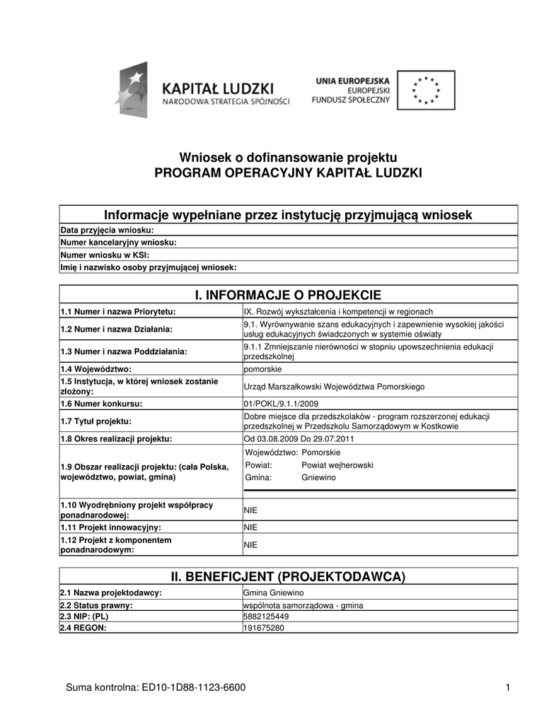 Wniosek o dofinansowanie projektu PROGRAM OPERACYJNY KAPITAŁ LUDZKI Informacje wypełniane przez instytucję przyjmującą wniosek Data przyjęcia wniosku: Numer kancelaryjny wniosku: Numer wniosku w KSI: Imię i nazwisko osoby przyjmującej wniosek: I. INFORMACJE O PROJEKCIE 1.1 Numer i nazwa Priorytetu: IX. Rozwój wykształcenia i kompetencji w regionach 1.2 Numer i nazwa Działania: 9.1. Wyrównywanie szans edukacyjnych i zapewnienie wysokiej jakości usług edukacyjnych świadczonych w systemie oświaty 1.3 Numer i nazwa Poddziałania: 9.1.1 Zmniejszanie nierówności w stopniu upowszechnienia edukacji przedszkolnej 1.4 Województwo: pomorskie 1.5 Instytucja, w której wniosek zostanie złożony: Urząd Marszałkowski Województwa Pomorskiego 1.6 Numer konkursu: 01/POKL/9.1.1/2009 1.7 Tytuł projektu: Dobre miejsce dla przedszkolaków - program rozszerzonej edukacji przedszkolnej w Przedszkolu Samorządowym w Kostkowie 1.8 Okres realizacji projektu: Od 03.08.2009 Do 29.07.2011 Województwo: Pomorskie 1.9 Obszar realizacji projektu: (cała Polska, województwo, powiat, gmina) Powiat: Powiat wejherowski Gmina: Gniewino 1.10 Wyodrębniony projekt współpracy ponadnarodowej: NIE 1.11 Projekt innowacyjny: NIE 1.12 Projekt z komponentem ponadnarodowym: NIE II. BENEFICJENT (PROJEKTODAWCA) 2.1 Nazwa projektodawcy: Gmina Gniewino 2.2 Status prawny: 2.3 NIP: (PL) 2.4 REGON: wspólnota samorządowa - gmina 5882125449 191675280 Suma kontrolna: ED10-1D88-1123-6600 1 2.5 Adres siedziby: 2.6 Osoba/y uprawniona do podejmowania decyzji wiążących w imieniu projektodawcy: 2.7 Osoba do kontaktów roboczych: 2.7.1 Numer telefonu: 2.7.2 Adres poczty elektronicznej: 2.7.3 Numer faksu: 2.7.4 Adres: 2.8 Partnerzy: Ulica: Pomorska Nr domu: 8 Nr lokalu: - Miejscowość: Gniewino Kod pocztowy: 84-250 Telefon: (0-58) 676-7677 Fax: (0-58) 676-7226 Zbigniew Walczak - Wójt Mikołaj Orzeł (0-58) 670 66 30 [email protected] (0-58) 676 72 26 ul. Pomorska 8, 84-250 Gniewino NIE III. CHARAKTERYSTYKA PROJEKTU (maksymalnie 20 000 znaków) 3.1 Cel projektu 1. Uzasadnij potrzebę realizacji projektu (wskaż problem/y który/e chcesz rozwiązać) 2. Wskaż cel ogólny oraz cele szczegółowe projektu. 3. Uzasadnij zgodność celów z PO KL, Planem Działań (i innymi dokumentami strategicznymi) Gmina Gniewino jest popegeerowską gminą wiejską o przemysłowo–rolniczym charakterze. W latach 70-tych i 80-tych w wyniku wielkiej skali budowy Elektrowni Jądrowej „Żarnowiec” nastąpił dynamiczny wzrost liczby mieszkańców – pracowników budowy. Większość osób, która osiedliła się w gminie posiadała jednak niskie wykształcenie, podobnie jak mieszkający tu pracownicy PGR. Po dziś dzień struktura wykształcenia na tle innych gmin (zarówno wiejskich jak i miejskich) kształtuje się wyjątkowo niekorzystnie (jedno z ostatnich miejsc w województwie pomorskim). Wśród mieszkańców dominują osoby z wykształceniem podstawowym (40%) i zawodowym (30%) zaś jedynie niewielki odsetek posiada wykształcenie średnie (27%) i wyższe (3%). 20% gosp. domowych wymaga wsparcia różnymi świadczeniami z pomocy społecznej. Bezpośrednim skutkiem tych uwarunkowań jest ograniczenie szans edukacyjnych dzieci wywodzących się z rodzin, w których brak wzorców zdobywania wykształcenia oraz brak umiejętności jak zapewnić prawidłowy rozwój dziecku. Zapóźnienia te są bardzo trudne do nadrobienia w szkole (wyniki egzaminów zewnętrznych w szkołach gminy Gniewino należą do najniższych w województwie), jednak wielu z nich udałoby się uniknąć poprzez odpowiedni program edukacji przedszkolnej. Na terenie gminy działa obecnie przedszkole w ramach Samorządowego Zespołu Szkół w Kostkowie, w którym z wychowania przedszkolnego korzysta 50 dzieci, jednak oferta zajęć jest uboższa niż w miastach, gdyż koszty przedszkola i tak są wysokie zwłaszcza dla tutejszych rodzin. Szansą na przezwyciężenie tych barier jest dostarczenie w ramach projektu bezpłatnej, rozszerzonej oferty edukacji przedszkolnej. Wśród dzieci uczęszczających do przedszkola powszechne są różne wady wymowy, problemy rozwojowe lub wady postawy. Jeżeli rodzice nie sfinansują dodatkowych zajęć z logopedą, psychologiem lub instrukturem gimnastyki, dziecko takie może mieć ogromne problemy w późniejszej nauce szkolnej. Jednak wielu rodziców nie stać na dodatkowe opłaty, więc projekt dostarczy możliwość bezpłatnych zajęć logopedycznych dla wymagających tego dzieci. Dodatkowym wsparciem będzie dostarczenie oferty bezpłatnych zajęć z psychologiem, dzięki którym możliwe będzie szybkie zdiagnozowanie problemów rozwojowych dzieci i powzięcie działań korygujących. Dzieci z wadami postawy zostaną objęte bezpłatnym programem gimnastyki korekcyjnej (w tym wyjazdy na basen). Kolejnym komponentem rozszerzonego programu edukacji przedszkolnej będzie wprowadzenie elementów edukacji regionalnej i kulturalnej. W jej ramach dzieci będą brały bezpłatny udział w zajęciach muzycznych (rytmika, tańce kaszubskie, zabawa prostymi instrumentami muzycznymi itp.) i plastycznych (rysowanie, malowanie - różne techniki, masa plastyczna, inne materiały). Ponadto uczestnicy będą brać udział w wyjazdach edukacyjnych po regionie (kina, teatry, ciekawe miejsca itp.). Ostatnim blokiem tematycznym w ramach projektu będą zajęcia z j. angielskiego dla najmłodszych. Projekt pozwoli więc na dostarczenie dzieciom wiejskim zajęć, które często były dla nich niedostępne, w odróżnieniu od przedszkolaków z miast - co jest jedną z przyczyn mniejszych szans edukacyjnych dzieci z terenów wiejskich. Realizacja projektu pozwoli na znaczące rozszerzenie oferty edukacyjnej dla 50 dzieci co stanowi 20% dzieci w wieku przedszkolnym z terenu gminy Gniewino. Celem projektu jest stworzenie warunków równych szans edukacyjnych mieszkańcom gminy poprzez udzielenie wsparcia osobom napotykającym na bariery o charakt
