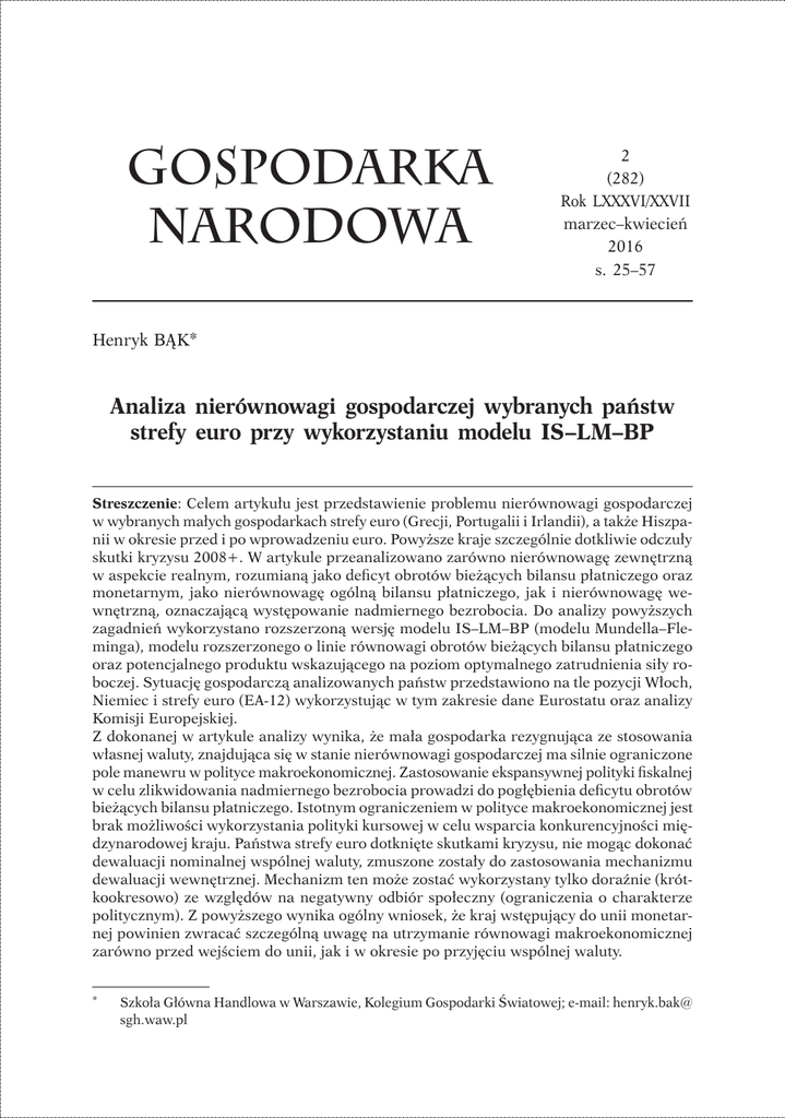 Henryk Bąk, Analiza nierównowagi gospodarczej wybranych państw strefy euro... Gospodarka narodowa 25 2 (282) Rok LXXXVI/XXVII marzec–kwiecień 2016 s. 25–57 Henryk BĄK* Analiza nierównowagi gospodarczej wybranych państw strefy euro przy wykorzystaniu modelu IS–LM–BP Streszczenie: Celem artykułu jest przedstawienie problemu nierównowagi gospodarczej w wybranych małych gospodarkach strefy euro (Grecji, Portugalii i Irlandii), a także Hiszpanii w okresie przed i po wprowadzeniu euro. Powyższe kraje szczególnie dotkliwie odczuły skutki kryzysu 2008+. W artykule przeanalizowano zarówno nierównowagę zewnętrzną w aspekcie realnym, rozumianą jako deficyt obrotów bieżących bilansu płatniczego oraz monetarnym, jako nierównowagę ogólną bilansu płatniczego, jak i nierównowagę wewnętrzną, oznaczającą występowanie nadmiernego bezrobocia. Do analizy powyższych zagadnień wykorzystano rozszerzoną wersję modelu IS–LM–BP (modelu Mundella–Fleminga), modelu rozszerzonego o linie równowagi obrotów bieżących bilansu płatniczego oraz potencjalnego produktu wskazującego na poziom optymalnego zatrudnienia siły roboczej. Sytuację gospodarczą analizowanych państw przedstawiono na tle pozycji Włoch, Niemiec i strefy euro (EA-12) wykorzystując w tym zakresie dane Eurostatu oraz analizy Komisji Europejskiej. Z dokonanej w artykule analizy wynika, że mała gospodarka rezygnująca ze stosowania własnej waluty, znajdująca się w stanie nierównowagi gospodarczej ma silnie ograniczone pole manewru w polityce makroekonomicznej. Zastosowanie ekspansywnej polityki fiskalnej w celu zlikwidowania nadmiernego bezrobocia prowadzi do pogłębienia deficytu obrotów bieżących bilansu płatniczego. Istotnym ograniczeniem w polityce makroekonomicznej jest brak możliwości wykorzystania polityki kursowej w celu wsparcia konkurencyjności międzynarodowej kraju. Państwa strefy euro dotknięte skutkami kryzysu, nie mogąc dokonać dewaluacji nominalnej wspólnej waluty, zmuszone zostały do zastosowania mechanizmu dewaluacji wewnętrznej. Mechanizm ten może zostać wykorzystany tylko doraźnie (krótkookresowo) ze względów na negatywny odbiór społeczny (ograniczenia o charakterze politycznym). Z powyższego wynika ogólny wniosek, że kraj wstępujący do unii monetarnej powinien zwracać szczególną uwagę na utrzymanie równowagi makroekonomicznej zarówno przed wejściem do unii, jak i w okresie po przyjęciu wspólnej waluty. * Szkoła Główna Handlowa w Warszawie, Kolegium Gospodarki Światowej; e-mail: henryk.bak@ sgh.waw.pl 26 GOSPODARKA NARODOWA nr 2/2016 Słowa kluczowe: unia walutowa, strefa euro, polityka makroekonomiczna, równowaga zewnętrzna, finanse publiczne w unii monetarnej Kody klasyfikacji JEL: E32, E63, F33, F45 Artykuł nadesłany 1 sierpnia 2015 r., zaakceptowany 2 marca 2016 r. Wprowadzenie Gospodarka jest systemem otwartym, który podlega dynamicznym zmianom. Normalnym zjawiskiem jest więc występowanie nierównowagi w poszczególnych obszarach jej funkcjonowania. Ważne jest w tym przypadku, czy procesy zachodzące w gospodarce (w tym prowadzona polityka gospodarcza) sprzyjają ograniczaniu skali nierównowagi, czy też dochodzi do pogłębienia tej nierównowagi w poszczególnych obszarach, co zagraża długofalowemu rozwojowi kraju. W artykule przeprowadzono analizę z punktu widzenia małej gospodarki otwartej1 funkcjonującej w ramach unii (integracji) walutowej. Gospodarka mała oznacza, że jej potencjał gospodarczy jest na tyle niewielki, że nie ma wpływu na kształt wspólnej polityki pieniężnej i walutowej. W części praktycznej przeanalizowano nierównowagę małych gospodarek na przykładzie Grecji, Portugalii i Irlandii, a częściowo także i Hiszpanii, czyli państw strefy euro, które szczególnie silnie zostały dotknięte kryzysem 2008+ i zmuszone zostały do skorzystania z pomocy finansowej2 Unii Europejskiej i ewentualnie MFW. Jako punkt odniesienia dla małych gospodarek przyjęto sytuację nierównowagi w gospodarce hiszpańskiej, która jest gospodarką znacznie większą od pozostałych trzech poddanych analizie małych gospodarek, a także gospodarki włoskiej i kluczowej dla funkcjonowania strefy euro gospodarki niemieckiej. Punktem wyjściowym analizy jest różny zakres nierównowagi wewnętrznej oraz nierównowagi zewnętrznej. Brak równowagi wewnętrznej oznacza, że w gospodarce występuje bezrobocie i nie znajduje się ona na linii produktu potencjalnego. Z kolei nierównowaga zewnętrzna ujmowana jest w dwojaki sposób, tj. jako nierównowaga realna, czyli brak równowagi rachunku obrotów bieżących bilansu płatniczego oraz nierównowaga w sensie dewizowym (monetarnym), oznaczająca głównie zmniejszanie się oficjalnych aktywów rezerwowych (rezerw dewizowych) w przypadku deficytu bilansu płatniczego. Poddano zatem analizie różnorodne przypadki małej gospodarki otwartej, w której występuje nierównowaga wewnętrzna i/lub nierównowaga zewnętrzna, przy czym władza krajowa nie ma wpływu na politykę pieniężną 1 2 Gospodarki otwartej zarówno na swobodny przepływ towarów i usług, jak i otwartej na swobodny przepływ kapitału. Pominięte zostaną problemy przywracania równowagi gospodarczej przy braku swobody w zakresie przepływów kapitału w skali międzynarodowej. Te cztery gospodarki będą w artykule określane też terminem kraje peryferyjne w przeciwieństwie do państw stanowiących trzon Unii Europejskiej. Henryk Bąk, Analiza nierównowagi gospodarczej wybranych państw strefy euro... 27 i kursową, gdyż na kształt tej polityki wpływa w decydującej mierze sytuacja gospodarcza dużych państw tworzących trzon unii walutowej. W tej sytuacji zachodzi konieczność odpowiedniego skoordynowania polityki pieniężnej (monetarnej) z polityką fiskalną w celu osiągnięcia w gospodarce równowagi wewnętrznej oraz równowagi zewnętrznej. Problem odpowiedniego skoor