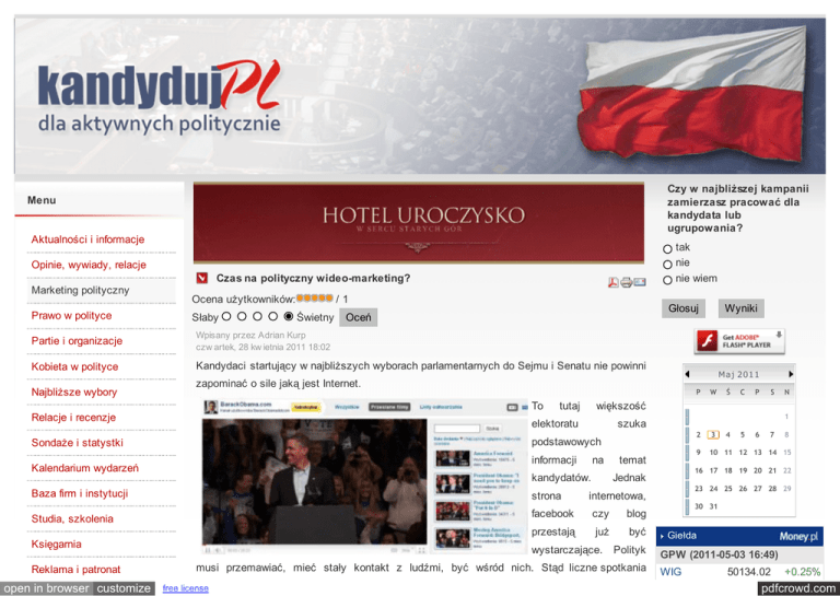 Czy w najbliższej kampanii zamierzasz pracować dla kandydata lub ugrupowania? Menu Aktualności i informacje tak nie nie wiem Opinie, wywiady, relacje Czas na polityczny wideo-marketing? Marketing polityczny Prawo w polityce Ocena użytkowników: Słaby / 1 Głosuj Wyniki Świetny Oceń Partie i organizacje Wpisany przez Adrian Kurp czw artek, 28 kw ietnia 2011 18:02 Kobieta w polityce Kandydaci startujący w najbliższych wyborach parlamentarnych do Sejmu i Senatu nie powinni Najbliższe wybory P To Relacje i recenzje tutaj większość elektoratu szuka informacji Kalendarium wydarzeń na kandydatów. temat strona Studia, szkolenia facebook czy blog przestają już być Księgarnia open in browser customize musi przemawiać, mieć stały kontakt z ludźmi, być wśród nich. Stąd liczne spotkania free license C P S N 2 3 4 5 6 7 8 9 10 11 12 13 14 15 23 24 25 26 27 28 29 internetowa, wystarczające. Polityk Ś 16 17 18 19 20 21 22 Jednak Baza firm i instytucji W 1 podstawowych Sondaże i statystki Reklama i patronat Maj 2011 zapominać o sile jaką jest Internet. 30 31 Giełda GPW (2011-05-03 16:49) WIG 50134.02 +0.25% pdfcrowd.com Zostań redaktorem Redakcja wyborcze oraz publiczne debaty. By jednak mieć szanse na kontakt i interakcję z szerszym WIG20 2919.81 +0.23% gronem wyborców, niż to zgromadzone podczas spotkań, warto postawić na własny kanał mWIG40 2956.15 +0.55% wideo w Internecie. sWIG80 12932.00 +0.30% Kursy walut Dialog za pomocą obrazu Menu użytkownika Zaloguj się Internet umożliwia wszystkim wyborcom kontakt z kandydatem. Każdy może zadać mu NBP pytanie i uzyskać na nie odpowiedź, każdy też może zaproponować rozwiązanie i wyrazić USD 2.6541 +0.15% EUR 3.9322 0.14% CHF 3.0546 +0.04% GBP 4.4237 +0.05% swoją opinię na temat programu. W ten sposób Internauci stają się częścią kampanii wyborczej, czują się docenieni. Zarejestruj się Do wyborców skuteczniej przemawiają fakty, działania, które mogą zobaczyć, stąd przekaz Szukaj na stronie wideo wydaje się najodpowiedniejszą formą kontaktu kandydata z otoczeniem. Newsletter 2011-05-02 Pogoda 3 maja 2011 Przedstaw się! Źródło: MeteoGroup Własny kanał wideo w Internecie umożliwia przybliżenie sylwetki kandydata, ale także zapoznanie wyborców ze jego dotychczasową działalnością. To często ona jest najważniejsza w kampanii, to ona wnosi najwięcej do strategii wyborczej. - Potwierdziło się to podczas ostatnich wyborów prezydenck ich w USA, gdzie k andydat demok ratów Barack Obama miał najwięcej materiałów wideo w swoim k anale YouTube ze wszystk ich k andydatów. Jesienią 2008 rok u byłem ak urat w Nowym Jork u oraz k ilk a dni w Washingtonie. Obserwowałem na wiecach wyborczych sztabowców Obamy, k tórzy często pracowali równocześnie na 10 k amerach, plus dwie cały czas w powietrzu na platformach helicam, tylk o po to, aby jeszcze tego samego wieczora pojawiła się dwuminutowa relacja w k anale YouTube Barack a Obamy ze spotk ania z wyborcami – mówi Wik tor W. Kammer, producent w CBC Film Productions, firmy k tóra promuje polityk ów z Krak owa. Szacuje się, że ok. 70% ludzi głosuje na kandydata, którego zna i któremu ufa (bez względu na przynależność do ugrupowania politycznego). Co więcej, prawie 50% ludzi mających pozytywny stosunek do osoby którą zna, namawia znajomych na głosowanie na tego kandydata. Z powyższych statystyk jasno wynika jak ważną rolę ma do spełnienia właściwe przedstawienie sylwetki kandydata. Do życiorysu kandydata odwołują rywale, open in browser customize free license się ale jego także pdfcrowd.com rywale, ale także wyborcy, którzy na tej podstawie najczęściej wyrabiają sobie opinię. Atrakcyjny i ciekawy przekaz informacji na swój temat staje się kluczem do przybliżenia swojej osoby i tym samym przekonania wyborców do siebie. Specjaliści od wizerunku zalecają podzielenie materiału filmowego na temat życiorysu i osiągnięć kandydata na kilka odcinków. Każdy odcinek powinien być poświęcony innemu okresowi życia kandydata (dzieciństwo, młodość, edukacja, czasy obecne) lub aspektowi (życie prywatne i zawodowe). Modułowość odcinków pozwoli odbiorcom usystematyzować informacje i wybrać te, które wydają im się najistotniejsze. Poza tym, dwutrzy minutowe reportaże filmowe w Internecie sprawdzają się najlepiej. Nie są zbyt długie, Internauci nie wyłączają ich przed zakończeniem – co więcej, jeśli dany klip się spodoba, polecają go dalej przez swojego facebooka, maila, gg, skype, bloga itp. - Poza zaprezentowaniem własnej sylwetk i należy poinformować wyborców o swoich planach oraz przedstawić swoje dotychczasowe działania, k tóre potwierdzają nasze poglądy i obrany program. Z relacji z wydarzeń, k onferencji prasowych, briefingów , zadań wynik ających z pełnionej obecnie funk cji, powinien wyłonić się spójny obraz, k tóry chcemy zaprezentować wyborcom – k omentuje Wik tor W. Kammer. Jak to technicznie zrobić ? Niestety, nie wszystko co chcemy pokazać, da się przedstawić „domowymi sposobami”. Czasem lepiej tego nie robić, aby nie zaszkodzić kandydatowi amatorskim nagraniem udającym profesjonalne. - Dostępność ofertowa małych, ręcznych k amer wideo, często nagrywających już w HD jest ogromna. Ceny zaczynają się od 700-800 złotych a foldery rek lamowe k rzyczą do nas „professional”. Tego typu k amery nadają się wyłącznie (o ile w ogóle) do plenerowych planów totalnych lub ogólnych, bez dźwięk u i obowiązk owo z dobrego statywu z olejową głowicą. Małe, open in browser customize free license pdfcrowd.com turystyczne k amery HD pozbawione są tzw. optyk i, mają słabe przetwornik i obrazu, ciemne obiek tywy oraz nie dają możliwości podłączenia zewnętrznych mik rofonów k tóre są k luczowe dla ak ceptowalnej jak ości dźwięk u w nagraniu. Bardzo ważna jest również stabilizacja obrazu k tóra