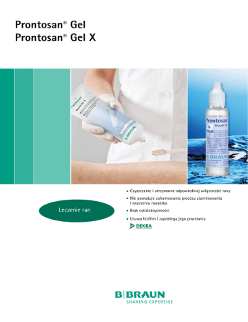 Prontosan® Gel Prontosan® Gel X n n Leczenie ran Czyszczenie i utrzymanie odpowiedniej wilgotności rany Nie powoduje zahamowania procesu ziarninowania i tworzenia naskórka n Brak cytotoksyczności n Usuwa biofilm i zapobiega jego powstaniu Prontosan® Gel Prontosan® Gel X Właściwości: nietoksyczny dla tkanek niedrażniący, nieuczulający n bezbolesny n przyspiesza proces powstawania ziarniny oraz nabłonka n produkt jałowy n zapewnia skuteczną barierę bakteriologiczną n skuteczny przez 8 tygodni od otwarcia opakowania n skutecznie nawilża ranę n brak systematycznej resorpcji poliheksanidyny z ran n usuwa nekrotyczne martwicze zmiany w ranie n usuwa nieprzyjemny zapach z rany n możliwość pozostawienia opatrunku z Prontosan Gel / Gel X do kilku dni n może być stosowany w czasie ciąży i laktacji n zastosowanie we wszystkich rodzajach ran m.in. ostrych, przewlekłych, stopy cukrzycowej, oparzeniach, odleżynach n skutecznie usuwa biofilm i zapobiega jego powstaniu n certyfikat DEKRA – potwierdza skuteczność preparatu wobec biofilmu n zapobiega wtórnej infekcji n n Zatosowanie: W ten sposób powierzchnia rany jest stale nawilżona, co zapewnia jej właściwe oczyszczanie. Warstwy pokrywające ranę są delikatnie uwalniane i usuwane w czasie kolejnej zmiany opatrunku. Żele należy stosować tak często, aby wszystkie warstwy oraz zmiany martwicze mogły być łatwo usunięte. Stwarza to dobre warunki do prawidłowego gojenia rany i umożliwia chirurgiczne oczyszczanie rany, zapewniając optymalną widoczność . Oczyszczanie rany: Aby zmniejszyć ryzyko przeniesienia drobnoustrojów do wnętrza rany, do oczyszczania dużych powierzchni wokół rany zaleca się stosowanie roztworu do płukania ran Prontosan®. Jeżeli jest to konieczne, należy odkazić części ciała lub nawet całą powierzchnię z zastosowaniem odpowiednich produktów np. Braunol lub Braunovidon. Czym jest biofilm? Biofilm - to trójwymiarowa kolonia bakterii zawartych w macierzy zewnątrzkomórkowych polimerów. Tworzona jest przez wiele drobnoustrojów chorobotwórczych w celu zwiększenia ochrony przed działaniem czynników zewnętrznych. Biofilm ma udział w patogenezie chorób przewlekłych, zwłaszcza zakażeń towarzyszących stosowaniu cewników, drenów, zakładaniu implantów. Stanowi poważny problem w zakażeniach wewnątrzszpitalnych. Złożona struktura biofilmu i odmienne cechy fizjologiczne drobnoustrojów go tworzących, tłumaczą ich wysoką oporność na działanie różnych czynników bakteriobójczych, w tym oporność na antybiotyki. Zwarta struktura biofilmu jest bardzo trudna do zlikwidowania . Specjalistyczna linia produktów Prontosan została stworzona w celu usuwania oraz zapobiegania akumulacji materii mikrobiologicznej na powierzchni rany. n Ranę przepłukać i oczyścić roztworem do płukania ran Prontosan®. n Powoduje to rozluźnienie istniejących warstw rany i ich usunięcie przed wdrożeniem leczenia z zastosowaniem preparatu Prontosan® Gel lub Prontosan® Gel X. n Jeśli istnieje podejrzenie, że rana jest zainfekowana należy przemyć ranę antyseptykiem Braunol Prontosan Gel Prontosan Gel X n Powierzchnie rany należy zawsze pokryć żelem o grubości co najmniej 3-5 mm. 30 ml 250 ml n Prontosan® Gel lub Prontosan® Gel X należy rozsmarować na powierzchni rany albo wypełnić nim istniejące jamy lub zagłębienia rany. mała gęstość duża gęstość n Opatrunki, gazy, okłady i inne materiały chłonne lub środki wypełniające ranę można również nawilżyć, a następnie przykryć nimi ranę lub ją wypełnić przed założeniem właściwego opatrunku. na rany mniejsze, do których jest trudniejszy dostęp (stopa cukrzycowa) na rany większe (owrzodzenie podudzi, odleżyny, stopa cukrzycowa) n Prontosan® Gel i Prontosan® Gel X może pozostać w ranie do momentu kolejnej zmiany opatrunku. W zależności od tego, kiedy zaplanowana jest kolejna zmiana, codziennie lub co kilka dni. rany oparzeniowe I i II stopnia rany oparzeniowe od I do IV stopnia jeśli potrzebujemy mniejszej ilości jeśli potrzebujemy większej ilości Dostępne opakowania Prontosan® Gel 30ml Prontosan® Gel X 250 ml Porównanie produktów Numer katalogowy 400516 400508 Prontosan® Gel / Prontosan® Gel X– składniki Woda do wstrzyknięć, Glicerol, Hydroksyetyloceluloza, 0,1% Undecylenamidopropyl Betainy, 0,1% Biguanid Poliaminopropylu (Poliheksanidyna). Aesculap Chifa Sp. z o.o. | 64-300 Nowy Tomyśl | ul. Tysiąclecia 14 Tel. 61 44 20 100 | Fax 61 44 23 936 | www.chifa.com.pl Aesculap Chifa - firma grupy B. Braun OPM-IC-035 09/2012