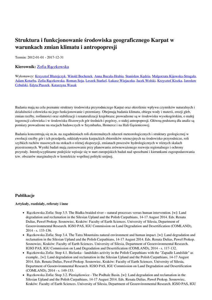 Struktura i funkcjonowanie środowiska geograficznego Karpat w warunkach zmian klimatu i antropopresji Termin: 2012-01-01 - 2017-12-31 Kierownik: Zofia Rączkowska Wykonawcy: Krzysztof Błażejczyk, Witold Bochenek, Anna Bucała-Hrabia, Stanisław Kędzia, Małgorzata Kijowska-Strugała, Adam Kotarba, Zofia Rączkowska, Roman Soja, Leszek Starkel, Łukasz Wiejaczka, Jacek Wolski, Krzysztof Kiszka, Jarosław Cebulski, Edyta Ptaszek, Katarzyna Wasak Badania mają na celu poznanie struktury środowiska przyrodniczego Karpat oraz określenie wpływu czynników naturalnych i działalności człowieka na jego funkcjonowanie i przemiany. Obejmują badania klimatu, obiegu wody i materii, erozji gleb, zmian rzeźby, roślinności oraz stabilizacji i renaturalizacji krajobrazu; prowadzone są w środowisku wysokogórskim, o małej ingerencji człowieka i w środowisku fliszowych gór średnich i pogórzy, o stałej antropopresji. Główną podstawą dla analiz są pomiary prowadzone na stacjach badawczych w Szymbarku, Homerce i na Hali Gąsienicowej. Badania koncentrują się m.in. na zagadnieniach roli ekstremalnych zdarzeń meteorologicznych i struktury geologicznej w ewolucji rzeźby gór i ich przedpola, oddziaływaniu karpackich zbiorników retencyjnych na środowisko przyrodnicze, roli szybkich ruchów masowych na stokach o różnej ekspozycji, zmianach procesów hydrologicznych w różnych skalach przestrzennych. Wyniki badań mają zastosowanie przy planowaniu zrównoważonego rozwoju regionalnego i ochrony przyrody. Interdyscyplinarne podejście wpisuje się w nurt europejskich badań nad sposobami i kierunkami zagospodarowania tzw. obszarów marginalnych w kontekście wspólnej polityki unijnej. Publikacje Artykuły, rozdziały, referaty i inne Rączkowska Zofia: Stop 3.5. The Białka braided river – natural processes versus human intervention. [w]: Land degradation and reclamation in the Silesian Upland and the Polish Carpathians, 14-17 August 2014. Eds. Renata Dulias, Paweł Prokop. Sosnowiec, Kraków: Faculty of Earth Sciences. University of Silesia, Department of Geoenvironmental Research. IGSO PAS, IGU Commission on Land Degradation and Desertification (COMLAND), 2014 - s. 133-136. Rączkowska Zofia: Stop 3.4. The Tatra Mountains natural environment and human impact. [w]: Land degradation and reclamation in the Silesian Upland and the Polish Carpathians, 14-17 August 2014. Eds. Renata Dulias, Paweł Prokop. Sosnowiec, Kraków: Faculty of Earth Sciences. University of Silesia, Department of Geoenvironmental Research. IGSO PAS, IGU Commission on Land Degradation and Desertification (COMLAND), 2014 - s. 117-132. Rączkowska Zofia: Stop 4.1. Bielanka - landslides activity in the Polish Carpathians with the "Zapadle Landslide" as example.. [w]: Land degradation and reclamation in the Silesian Upland and the Polish Carpathians, 14-17 August 2014. Eds. Renata Dulias, Paweł Prokop. Sosnowiec, Kraków: Faculty of Earth Sciences. University of Silesia, Department of Geoenvironmental Research. IGSO PAS, IGU Commission on Land Degradation and Desertification (COMLAND), 2014 - s. 149-153. Rączkowska Zofia: Stop 3.2. Pieniążkowice - The Podhale Basin. [w]: Land degradation and reclamation in the Silesian Upland and the Polish Carpathians, 14-17 August 2014. Eds. Renata Dulias, Paweł Prokop. Sosnowiec, Kraków: Faculty of Earth Sciences. University of Silesia, Department of Geoenvironmental Research. IGSO PAS, IGU Commission on Land Degradation and Desertification (COMLAND), 2014 - s. 113-116. Rączkowska Zofia: Stop 3.1. Dominikowice - Introduction to the Polish Carpathians. [w]: Land degradation and reclamation in the Silesian Upland and the Polish Carpathians, 14-17 August 2014. Eds. Renata Dulias, Paweł Prokop. Sosnowiec, Kraków: Faculty of Earth Sciences. University of Silesia, Department of Geoenvironmental Research. IGSO PAS, IGU Commission on Land Degradation and Desertification (COMLAND), 2014 - s. 106-112. Rączkowska Zofia, Długosz Michał, Fidelus Joanna, Kłapyta Piotr, Kotarba Adam, Płaczkowska Eliza: The Tatra Mts. high-mountain system. - Geomorphologia Slovaca et Bohemica 2013, 13, 1 - s. 99-130. Bochenek Witold: Ocena zmian warunków opadowych na Stacji Naukowo-Badawczej IGiPZ PAN w Szymbarku w okresie 40 lat obserwacji (1971–2010) i ich wpływ na zmienność odpływu wody ze zlewni Bystrzanki. - WodaŚrodowisko-Obszary Wiejskie 2012, 12, 2 - s. 29-44. Bucała Anna: Współczesne zmiany środowiska przyrodniczego pod wpływem działalności człowieka w dolinach potoków Jaszcze i Jamne (Gorce). - Landform Analysis, 2012, 19 - s. 5-15. Bucała Anna, Wiejaczka Łukasz: Współczesne zmiany krajobrazu kulturowego doliny Ropy na podstawie analizy materiałów kartograficznych. [w]: Źródła kartograficzne w badaniach krajobrazu kulturowego. Red. Joanna Plit, Jerzy Nita. Sosnowiec: Komisja Krajobrazu Kulturowego PTG, 2012 - s. 208-218 (Prace Komisji Krajobrazu Kulturowego; 16) Długosz Michał: Digital terrain model (DTM) as a tool for landslide investigation in the Polish Carpathians. - Studia Geomorphologica Carpatho-Balcanica 2012, 46 - s. 5-23. Kijowska-Strugała Małgorzata: Impact of downpours on fluvial processes in the Polish Carpathians as exemplified by the Bystrzanka stream. - Studia Geomorphologica Carphato-Balcanica 2012, 46 - s. 25-40. Kijowska-Strugała Małgorzata: Impact of downpours on fluvial processes in the Polish Carpathians as exemplified by the Bystrzanka stream. - Studia Geomorphologica Carphato-Balcanica 2012, 46, 1 - s. 25-40. Kijowska-Strugała Małgorzta: Impact of downpours on fluvial processes in the Polish Carpathians as exemplified by Bystrzanka stream. - Studia Geomorphologica Carpatho-Balcanica 2012, 46 - s. 25-40. Kozłowski Rafał, Jóźwiak Marek, Jóźwiak Małgorzata Anna, Bochenek Witold: Ocena wielkości wymywania jonów K+, Ca2+ i Mg2+ w wybranych drzewostanach w warunkach kwaśnej depozycji. - Sylwan 2012, 156, 8 - s. 607-615. 