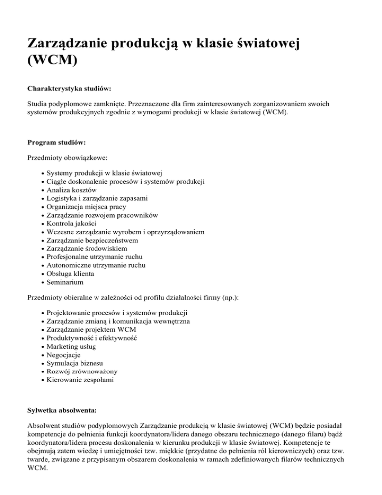 Zarządzanie produkcją w klasie światowej (WCM) Charakterystyka studiów: Studia podyplomowe zamknięte. Przeznaczone dla firm zainteresowanych zorganizowaniem swoich systemów produkcyjnych zgodnie z wymogami produkcji w klasie światowej (WCM). Program studiów: Przedmioty obowiązkowe: Systemy produkcji w klasie światowej Ciągłe doskonalenie procesów i systemów produkcji Analiza kosztów Logistyka i zarządzanie zapasami Organizacja miejsca pracy Zarządzanie rozwojem pracowników Kontrola jakości Wczesne zarządzanie wyrobem i oprzyrządowaniem Zarządzanie bezpieczeństwem Zarządzanie środowiskiem Profesjonalne utrzymanie ruchu Autonomiczne utrzymanie ruchu Obsługa klienta Seminarium Przedmioty obieralne w zależności od profilu działalności firmy (np.): Projektowanie procesów i systemów produkcji Zarządzanie zmianą i komunikacja wewnętrzna Zarządzanie projektem WCM Produktywność i efektywność Marketing usług Negocjacje Symulacja biznesu Rozwój zrównoważony Kierowanie zespołami Sylwetka absolwenta: Absolwent studiów podyplomowych Zarządzanie produkcją w klasie światowej (WCM) będzie posiadał kompetencje do pełnienia funkcji koordynatora/lidera danego obszaru technicznego (danego filaru) bądź koordynatora/lidera procesu doskonalenia w kierunku produkcji w klasie światowej. Kompetencje te obejmują zatem wiedzę i umiejętności tzw. miękkie (przydatne do pełnienia ról kierowniczych) oraz tzw. twarde, związane z przypisanym obszarem doskonalenia w ramach zdefiniowanych filarów technicznych WCM. Czas trwania: 2 semestry Termin zgłoszeń: - Wymagane dokumenty: odpis dyplomu ukończenia studiów wyższych kwestionariusz osobowy Tryb zgłoszeń: Rekrutacja zamknięta – zgłoszenie firmy z dołączoną listą uczestników. Liczba miejsc: 20–35 Miejsce zgłoszeń: AGH, Wydział Zarządzania ul. Gramatyka 10 pok. 6, pawilon D-14 30-067 Kraków Osoba przyjmująca zgłoszenia: Agnieszka Kuszlik Opłaty: negocjowane Organizator studiów podyplomowych: Wydział Zarządzania Adres organizatora: Wydział Zarządzania ul. Gramatyka 10 pawilon D-14, pokój 6 Kierownik: dr inż. Marek Dudek Osoba do kontaktu: Agnieszka Kuszlik tel.: 12 617 43 07, 536 408 037 [email protected]