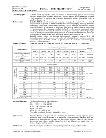 Peril Production s.r.o Svitavská 500 678 01 Blansko, Czech Republic Charakterystyka: Zastosowanie: Wykaz wyrobów: Karta produktu PERIL 01/2008 PERIL – OPIS PRODUKTÓW Kształtki PERIL są niepalne, izolujace cieplnie, o bardzo niskiej gęstości objętościowej. Posiadają bardzo dobre własności termiczne i łatwość obróbki. Skład chemiczny wyrobów PERIL powoduje, iŜ spełniają one wszystkie wymagania ochrony środowiska i nie są szkodliwe dla zdrowia. Kształtki PERIL są stosowane do budowy izolacyjnych wymurówek w blokach energetycznych, w piecach w przemyśle materiałów ceramicznych,przy produkcji porcelany, w przemyśle chemicznym i petrochemicznym, jako izolacja wanien w przemyśle szklarskim, instalacji cieplnych w energetyce, w hutnictwie jako izolacja wielkich pieców, nagrzewnic powietrza, urzadzeń do wyŜarzania, instalacji cieplnych w koksowniach, w metalurgii metali nieŜelaznych, hartowniach i innych zakładach związanych z metalurgią, jako izolacja cieplna pieców w przemyśle cementowym i wapienniczym, w spalarniach i krematoriach, moŜe być uŜywany takŜe w budownictwie jako materiał do budowy kominków i pieców. Kształtki naleŜy wiązać za pomocą odpowiednich cementów ogniotrwałych lub drobnoziarnistych szczeliw cementowych, moŜna teŜ układać je luŜno w warstwie izolacyjnej wymurówki pieca. Kształtki PERIL są przeznaczone do tworzenia niekonstrukcyjnej, izolującej części wymurówek. PERIL 25, PERIL 35, PERIL 45, PERIL 55, PERIL 65, PERIL 75, PERIL 105 Gwarantowane parametry Badania według: Właściwościi: Dopuszczalna temperatura (°C) CięŜar objętościowy (kg/m3) Wytrzymałość na sciskanie (MPa) Peril 25 Peril 35 Peril 45 Peril 55 Peril 65 Peril 75 Peril 105 750 750 750 750 900 1100 1250 EN 1402-6 max. 250 max. 350 max. 450 max. 550 max. 650 max. 750 max. 1050 EN 1094-4 min. 0,6 min. 1,0 min. 1,8 min. 2,2 min. 3,0 min. 3,0 min. 4,0 EN ISO 8895 0,190 0,217 0,233 0,260 0,273 0,317 - 0,217 0,251 0,294 0,342 0,357 0,427 0,497 0,249 0,321 0,434 0,557 0,595 0,811 0,990 EN 993-14 49,0 18,0 0,6 2,5 16,0 1,0 3,0 1,0 7,5 44,3 22,5 0,4 2,1 17,9 0,4 2,1 0,9 8,1 34,0 33,0 0,1 2,5 15,0 1,0 3,5 1,5 9,0 ENV 955-4 Dane liczbowe Skład chemiczny (obsah v %) Przewodność cieplna (W/mK) 50°C 300°C 600°C 750°C 800°C 900°C 1000°C 1100°C 0,072 0,095 0,130 0,160 - SiO2 Al2O3 TiO2 Fe2O3 CaO MgO K2O Na2O Straty po praŜeniu Wilgotność (%) 0,082 0,105 0,140 0,170 - 0,100 0,130 0,160 0,190 - 52,8 9,2 0,2 2,2 21,2 0,6 3,2 1,5 7,6 0,155 0,185 0,205 0,240 50,0 16,0 0,1 2,9 15,0 1,0 3,5 1,5 9,0 7 9 EN 1402-3 Rozmiary i kształty: Według podstawowego zakresu kształtu. NF1 230 x 114 x 10–100 mm NF2 250 x 124 x 10–100 mm C 22 220 x 110 x 10–100 mm klíny K6 (2H6) płyty 604 x 410 x 20–60 mm Wszystkie wymiary wykonane z tolerancją ± 1mm. Opakowania: Wyroby złoŜone są na paletach (co 4 warstwa jest przełoŜona tekturą), opasana opaską i owinięta folią. Palety są opasane 2x na długości i 2x na szerokości. NaroŜniki palet pod opaskami są zabezpieczone tekturowymi naroŜnikami, grubości 5mm, na całej długości i szerokości palety. Przewodni list (identyfikacyjny) jest dołączony do kaŜdej palety pod folią na długiej i krótkiej ścianie. Składowanie: Wyroby muszą być składowane w suchych i ogrzewanych magazynach (min.+5°C). Zatwierdził; Ing. Tomášek, dyrektor spółki. Obowiązuje od: 11. 01. 2011
