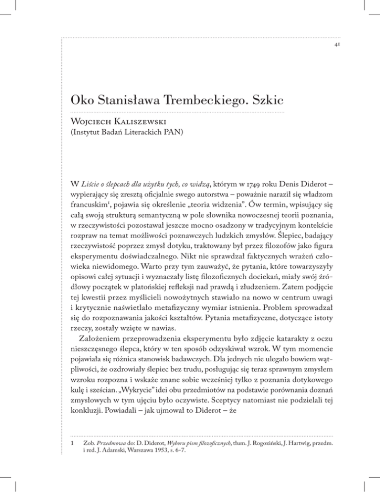 41 Oko Stanisława Trembeckiego. Szkic Wojciech Kaliszewski (Instytut Badań Literackich PAN) W Liście o ślepcach dla użytku tych, co widzą, którym w 1749 roku Denis Diderot – wypierający się zresztą oficjalnie swego autorstwa – poważnie naraził się władzom francuskim1, pojawia się określenie „teoria widzenia”. Ów termin, wpisujący się całą swoją strukturą semantyczną w pole słownika nowoczesnej teorii poznania, w rzeczywistości pozostawał jeszcze mocno osadzony w tradycyjnym kontekście rozpraw na temat możliwości poznawczych ludzkich zmysłów. Ślepiec, badający rzeczywistość poprzez zmysł dotyku, traktowany był przez filozofów jako figura eksperymentu doświadczalnego. Nikt nie sprawdzał faktycznych wrażeń człowieka niewidomego. Warto przy tym zauważyć, że pytania, które towarzyszyły opisowi całej sytuacji i wyznaczały listę filozoficznych dociekań, miały swój źródłowy początek w platońskiej refleksji nad prawdą i złudzeniem. Zatem podjęcie tej kwestii przez myślicieli nowożytnych stawiało na nowo w centrum uwagi i krytycznie naświetlało metafizyczny wymiar istnienia. Problem sprowadzał się do rozpoznawania jakości kształtów. Pytania metafizyczne, dotyczące istoty rzeczy, zostały wzięte w nawias. Założeniem przeprowadzenia eksperymentu było zdjęcie katarakty z oczu nieszczęsnego ślepca, który w ten sposób odzyskiwał wzrok. W tym momencie pojawiała się różnica stanowisk badawczych. Dla jednych nie ulegało bowiem wątpliwości, że ozdrowiały ślepiec bez trudu, posługując się teraz sprawnym zmysłem wzroku rozpozna i wskaże znane sobie wcześniej tylko z poznania dotykowego kulę i sześcian. „Wykrycie” idei obu przedmiotów na podstawie porównania doznań zmysłowych w tym ujęciu było oczywiste. Sceptycy natomiast nie podzielali tej konkluzji. Powiadali – jak ujmował to Diderot – że 1Zob. Przedmowa do: D. Diderot, Wyboru pism filozoficznych, tłum. J. Rogoziński, J. Hartwig, przedm. i red. J. Adamski, Warszawa 1953, s. 6-7. I • Rozprawy i materiały 42 » Tylko doświadczenie może mnie pouczyć, czy wzrok i dotyk odpowiadają sobie; te dwa zmysły mogłyby być w sprzeczności z sobą, a ja mógłbym o tym nie wiedzieć. Sądziłbym wówczas, że to, co ukazuje się obecnie memu wzrokowi, jest tylko czystym pozorem, gdyby mnie nie powiadomiono, że są to te same ciała, których dotykałem2. Sam Diderot traktował zmysłowe rejestratory poznania rzeczywistości bardzo poważnie, widząc przede wszystkim w dotyku, słuchu i wzroku równorzędne co do znaczenia kanały kontaktu człowieka ze światem. Przyznawał im zarazem pierwszoplanową rolę epistemologiczną, podważając obecność „idei wrodzonych” w naszych umysłach. To niewątpliwie krytyczne wobec wyłącznie rozumowych analiz poznawczych stanowisko, traktowało umysł jako centrum zbierające i rozpoznające odbierane za pomocą zmysłów wrażenia3. W ten sposób Diderot dokonywał syntezy obu stanowisk nowożytnej epistemologii, podkreślając zarazem prymat wrażeń sensualnych nad dociekaniem istotowym. Te zmysłowe ścieżki szczególnie upodobał sobie Stanisław Trembecki, znakomicie wykorzystując możliwość zmysłowego rejestrowania rzeczywistości do budowania obrazów poetyckich. Za pomocą wrażeń sensualnych uruchamiał całe sekwencje pojęć, które następnie układały się w poruszające wyobraźnię wizerunkowe przedstawienia. Trembecki był prawdziwym mistrzem ujęć małych, mikroperspektyw wywołanych zaledwie błyskiem, muśnięciem lub szelestem. Ale ten sam bodziec mógł stać się u niego także początkiem znacznie bardziej rozbudowanych i złożonych przedstawień. Zmysł wzroku był w jednym i drugim przypadku jego najważniejszym zmysłem, pozwalającym odbierać rzeczywistość. Oko poety skupiało w swojej źrenicy kształty, kolory, odcienie i wszystkie te cechy obserwowanego fragmentu świata, które pozwalały go nie tylko zidentyfikować i opisać, ale także na tej podstawie przedstawić kształt idei. Tak więc obserwacja stanowiła dla Trembeckiego źródło wielorakich wrażeń. Od opisu wywołanego wzrokowym bodźcem rozpoczyna się poemat Sofijówka. Wersy inwokacyjne, otwierające poemat, nawiązujące do Wergiliuszowych Georgik, są wyrażeniem złożonym z dwóch wyrazów: „miła oku”. Dalsze słowa stanowią wyliczenie zalet i przymiotów owej „krainy, mlekiem płynącej i miodem”. Ale jako pierwszy w kolejności wymieniony jest narząd wzroku. Oko jest początkiem poematu i początkiem całego wywodu poznawczego, który Trembecki rozwinął w Sofijówce. To, co widzi bohater Trembeckiego, układa się w pejzaż bogaty 2 3 D. Diderot, List o ślepcach dla użytku tych, co widzą, w: idem, op. cit., s. 223-224. O subtelnościach epistemologicznych Diderota pisze Marian Skrzypek (idem, Diderot, Warszawa 1982, s. 102-131). Wojciech Kaliszewski Oko Stanisława Trembeckiego. Szkic 43 kształtami i barwami, poprzez które dokonuje się rozpoznanie przeszłych dziejów tych ziem: » Czernią się żyzne role, lecz bryły tej ziemi Krwią przemokły, stłuszczone ciały podartemi4. Podążamy za bohaterem Trembeckiego od tego, co bezpośrednio rejestruje wzrok, ku temu, co stanowi obraz ukryty dla zmysłów. Poznanie nie zatrzymuje się tylko na tym, co widzialne, ale dotyka sfery głębszej, rozpoznaje kształt wewnętrzny, ukryty pod tym, co widzialne, co jawne dla oka. Tym samym widzenie jest tylko jednym z elementów składających się na całość istnienia bohatera. Bo całość wymaga spostrzegania – niebezpośrednio – także tego, co niewidzialne. Tymczasem Etienne Condillac, poświęcający procesowi spostrzegania i poznawania zmysłowego wiele miejsca w swoich badaniach, w Traktacie o wrażeniach sądził coś zupełnie innego: „Czuję się więc upoważniony do stwierdzenia, że posąg nasz widzi tylko światło i barwy i nie może sądzić