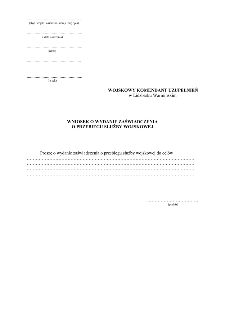 ................................................. (stop. wojsk., nazwisko, imię i imię ojca) ................................................. ( data urodzenia) ................................................. (adres) ................................................ ................................................. (nr tel.) WOJSKOWY KOMENDANT UZUPEŁNIEŃ w Lidzbarku Warmińskim WNIOSEK O WYDANIE ZAŚWIADCZENIA O PRZEBIEGU SŁUŻBY WOJSKOWEJ Proszę o wydanie zaświadczenia o przebiegu służby wojskowej do celów ………………………………………………………………………………………………… ………………………………………………………………………………………………… ………………………………………………………………………………………………… ………………………………………………………………………………………………… ……………………………. (podpis)