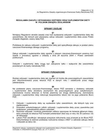 Załącznik nr 14 do Regulaminu Zasady organizacyjno-finansowe Kadry Narodowej PZŻ REGULAMIN ZAKUPU I WYDAWANIA ODŻYWEK ORAZ SUPLEMENTÓW DIETY W POLSKIM ZWIĄZKU ŻEGLARSKIM SPRAWY OGÓLNE §1 Niniejszy Regulamin określa zasady oraz tryb wydawania odżywek i suplementów diety dla zawodników, dla których jest planowany zakup odżywek i suplementów diety przez Polski Związek Żeglarski, zwany dalej PZŻ. §2 Podstawą do zakupu odżywek i suplementów diety jest specyfikacja zakupu w postaci planu rzeczowo-finansowego danego programu. §3 Zakup odżywek i suplementów diety zgodne z planem rzeczowo-finansowym powinny być oparte o procedury zgodne z Ustawą z dnia 29 stycznia 2004 r. Prawo zamówień publicznych. §4 Odżywki i suplementy diety mogą być zakupione tylko i wyłącznie dla zawodników powołanych do kadry narodowej PZŻ. SPRAWY PORZĄDKOWE §5 Rodzaj odżywek i suplementów diety jak również ich liczba dla poszczególnych zawodników jest rekomendowana przez lekarza PZŻ w danym roku i ostatecznie przez niego zatwierdzana. §6 Na podstawie planu rzeczowo-finansowego, lekarz PZŻ zamawia u dostawcy odżywek i suplementów diety określony asortyment dla poszczególnych grup szkoleniowych. Zamówienia można dokonać w formie pisemnej lub drogą elektroniczną. Zamówienia odżywek i suplementów diety dokonuje bezpośrednio lekarz lub na jego polecenie Biuro PZŻ. 1. 2. 3. 4. §7 Odżywki i suplementy diety są wydawane tylko zawodnikom, dla których były one zaplanowane. Dowodem potwierdzającym odbiór odżywek i suplementów diety przez zawodnika jest podpisanie „pokwitowania odbioru odżywek”. Rozchód odżywek i kontrola pokwitowań odbioru spoczywa na trenerze głównym klasy, który przesyła do lekarza PZŻ komplet potwierdzeń dwa razy w roku /do 30 czerwca i do 30 listopada/. Lekarz PZŻ weryfikuje i akceptuje powyższe dokumenty oraz przesyła je do Biura PZŻ. Dokumentacja ta stanowi podstawę rozliczenia dotacji z MSiT w zakresie zakupu leków i odżywek za dany rok. Regulamin zakupu i wydawania odżywek oraz suplementów diety w Polskim Związku Żeglarskim /Uchwała nr 276/Z/XXXVII Zarządu PZŻ z dn. 21.11.2015 r./ 1 §8 Odżywki i suplementy diety są zakupywane w ramach potrzeb. SPRAWY KOŃCOWE §9 PZŻ nie gwarantuje zakupu odżywek i suplementów diety w danym roku. Liczba oraz asortyment odżywek dla poszczególnych zawodników jest uzależniony od posiadanych przez PZŻ w danym roku środków finansowych. Regulamin zakupu i wydawania odżywek oraz suplementów diety w Polskim Związku Żeglarskim /Uchwała nr 276/Z/XXXVII Zarządu PZŻ z dn. 21.11.2015 r./ 2