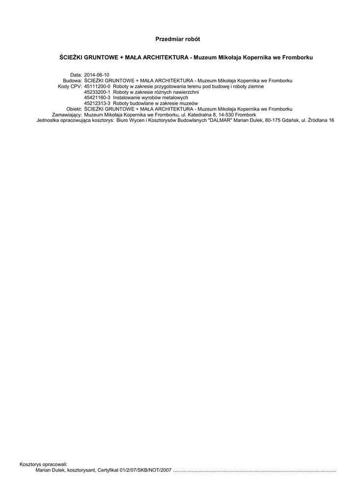 Przedmiar robót ŚCIEŻKI GRUNTOWE + MAŁA ARCHITEKTURA - Muzeum Mikołaja Kopernika we Fromborku Data: 2014-06-10 Budowa: ŚCIEŻKI GRUNTOWE + MAŁA ARCHITEKTURA - Muzeum Mikołaja Kopernika we Fromborku Kody CPV: 45111200-0 Roboty w zakresie przygotowania terenu pod budowę i roboty ziemne 45233200-1 Roboty w zakresie różnych nawierzchni 45421160-3 Instalowanie wyrobów metalowych 45212313-3 Roboty budowlane w zakresie muzeów Obiekt: ŚCIEŻKI GRUNTOWE + MAŁA ARCHITEKTURA - Muzeum Mikołaja Kopernika we Fromborku Zamawiający: Muzeum Mikołaja Kopernika we Fromborku, ul. Katedralna 8, 14-530 Frombork Jednostka opracowująca kosztorys: Biuro Wycen i Kosztorysów Budowlanych "DALMAR" Marian Dulek, 80-175 Gdańsk, ul. Źródlana 16 Kosztorys opracowali: Marian Dulek, kosztorysant, Certyfikat 01/2/07/SKB/NOT/2007 ....................................................................................................................................... Przedmiar robót Podstawa nakładu, opis pozycji, wyliczenie ilości robót Ilosć Krot. Jedn. 1 Nr STWiOR: ST 01.01 Kody CPV: 45111200-0 Roboty w zakresie przygotowania terenu pod budowę i roboty ziemne Roboty przygotowawcze, ziemne i korytowanie 1 KNR 201/122/1 Pomiary przy robotach ziemnych 786,24 2 KNR 231/101/1 Koryta wykonywane na całej szerokości jezdni i chodników, mechanicznie, grunt kategorii I-IV, na głębokości 20 cm ścieżki 2620,80 = 2 620,800000 2 620,80 2 620,80 3 KNR 231/101/2 Koryta wykonywane na całej szerokości jezdni i chodników, mechanicznie, grunt kategorii I-IV, dodatek za każde dalsze 5 cm głębokości - ścieżki 30 cm - 20 cm = 10 cm 2620,80 = 2 620,800000 10/5=2 = 0,000000 2 620,80 2 620,80 4 KNR 231/103/4 Profilowanie i zagęszczanie podłoża pod warstwy konstrukcyjne nawierzchni, mechanicznie, grunt kategorii I-IV 2 620,80 5 KNR 201/212/3 Roboty ziemne koparkami podsiębiernymi z transportem urobku samochodami samowyładowczymi do 1 km, w ziemi uprzednio zmagazynowanej w hałdach, koparka 0,25 m3, grunt kategorii I-III, spycharka 55 kW R= 0,955 M= 1,000 S= 1,000 2620,80*0,30 = 786,240000 786,24 786,24 6 KNR 201/214/4 Nakłady uzupełniające do tablic 0201-0213 za każde dalsze rozpoczęte 0,5 km odległości transportu, ponad 1 km samochodami samowyładowczymi, po drogach utwardzonych, grunt kategorii III-IV, samochód 5-10 t R= 0,955 M= 1,000 S= 1,000 786,24 7 Koszt stałego odkładu gruntu 786,24*1,60 = 1 257,984000 1 257,984 1 257,984 m3 m2 2 m2 m2 m3 18 m3 t 2 Nr STWiOR: ST 01.16 Kody CPV: 45233200-1 Roboty w zakresie różnych nawierzchni Wykonanie nawierzchni ścieżek żwirowych 8 KNR 231/104/1 Warstwy odsączające, w korycie i na poszerzeniach, zagęszczenie ręczne, grubość warstwy po zagęszczeniu 10 cm 9 KNR 231/104/2 Warstwy odsączające, w korycie i na poszerzeniach, zagęszczenie ręczne, dodatek za każdy 1 cm zagęszczenia 10 KNR 231/202/3 Nawierzchnie piaskowo- żwirowe, warstwa jezdni górna, rozścielane ręcznie, grubość warstwy po zagęszczeniu 8 cm 11 KNR 231/202/4 Nawierzchnie piaskowo - żwirowe, warstwa jezdni górna, rozścielane ręcznie, dodatek za każdy dalszy 1 cm grubości warstwy 12 Krawędziaki modrzewiowe 10x10 cm - jako obrzeża ścieżki - zakup i montaż (kalkulacja uproszczona) 2 620,80 m2 2 620,80 5 m2 2 620,80 m2 2 620,80 2 600,00 7 m2 m 64,50 m2 64,50 m2 9,675 m3 64,50 m2 64,50 m2 64,50 m2 64,50 m2 3 Nr STWiOR: ST 01.16 Kody CPV: 45233200-1 Roboty w zakresie różnych nawierzchni Schodki terenowe 13 KNR 231/102/5 Koryta wykonywane na poszerzeniach, na chodnikach, grunt kategorii II-IV, głębokość 10 cm 14 KNR 231/102/6 Koryta wykonywane na poszerzeniach, na chodnikach, grunt kategorii II-IV, dodatek każde dalsze 5 cm głębokości 15 KNR 201/415/2 Rozplantowanie ręczne ziemi wydobytej z wykopów, leżącej na długości 1 m wzdłuż krawędzi, kategoria gruntu III R= 0,955 M= 1,000 S= 1,000 64,50*0,15 = 9,675000 9,675 16 KNR 231/103/2 Profilowanie i zagęszczanie podłoża pod warstwy konstrukcyjne nawierzchni, ręcznie, grunt kategorii III-IV 17 KNR 231/202/1 Nawierzchnie żwirowe, warstwa jezdni dolna, rozścielane ręcznie, grubość warstwy po zagęszczeniu 10 cm 0,50*1,50*86,00 = 64,500000 64,50 18 KNR 231/202/3 Nawierzchnie żwirowe, warstwa jezdni górna, rozścielane ręcznie, grubość warstwy po zagęszczeniu 3 cm 19 KNR 231/103/2 Profilowanie i zagęszczanie - warstwy konstrukcyjne nawierzchni, ręcznie strona nr: 2 Podstawa nakładu, opis pozycji, wyliczenie ilości robót 20 KNR 401/201/1 Deskowanie elementów schodów - deski z kołkami modrzewiowymi 86,00*1,50*0,30 21 KNR 401/201/1 Krawędziaki elementów schodów - krawędziaki modrzewiowe 10x10 cm 86,00*1,50*0,10 Ilosć = = Krot. Jedn. 38,700000 38,70 38,70 m2 12,900000 12,90 12,90 m2 4 Kody CPV: 45421160-3 Instalowanie wyrobów metalowych Mała architektura - urządzenia terenowe 22 Kalkulacja indywidualna Zakup i montaż - Ławki zgodnie z opisem na rysunkach - porównywalne wyglądem jak ZanoFlash 02.025 23 Kalkulacja indywidualna Zakup i montaż - Ławki zgodnie z opisem na rysunkach - porównywalne wyglądem jak ZanoFlash 02.425 24 Kalkulacja indywidualna Zakup i montaż - Ławki zgodnie z opisem na rysunkach - porównywalne wyglądem jak ZanoFlash 02.325 25 Kalkulacja indywidualna Zakup i montaż - Kosze na śmieci 26 Kalkulacja indywidualna Zakup i montaż - Stojaki na rowery 1,00 całość 1,00 całość 1,00 całość 1,00 całość 1,00 całość strona nr: 3 Spis działów Lp. 1 2 3 4 Nr CPV 45111200-0 45233200-1 45233200-1 45421160-3 Opis Roboty przygotowawcze, ziemne i korytowanie Wykonanie nawierzchni ścieżek żwirowych Schodki terenowe Mała architektura - urządzenia terenowe strona nr: 4