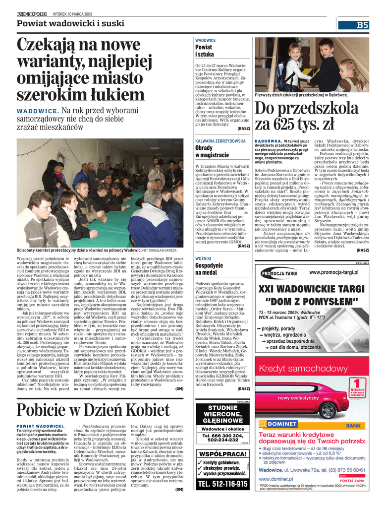 WTOREK, 10 MARCA 2009 Powiat wadowicki i suski B5 Czekają na nowe warianty, najlepiej omijające miasto szerokim łukiem Na rok przed wyborami samorządowcy nie chcą do siebie zrażać mieszkańców WA D O W I C E . WADOWICE Powiat i sztuka Od 25 do 27 marca Wadowickie Centrum Kultury organizuje Powiatowy Przegląd Zespołów Artystycznych. Zaprezentują się w nim grupy dziecięce i młodzieżowe działające w szkołach i placówkach kultury powiatu, w kategoriach: zespoły taneczne, instrumentalne, instrumentalno – wokalne, wokalne, chóry oraz zespoły teatralne. W tym roku przegląd obchodzi jubileusz. WCK organizuje go po raz dziesiąty. (RASZ) KALWARIA ZEBRZYDOWSKA Obrady w magistracie W Urzędzie Miasta w Kalwarii Zebrzydowskiej odbyło się spotkanie z przedstawicielami Agencji Restrukturyzacji i Modernizacji Rolnictwa w Wado wicach oraz Doradztwa Rolniczego w Wadowicach. W spotkaniu uczestniczyli sołtysi oraz rolnicy z terenu Gminy Kalwaria Zebrzydowska. Oma wiano zasady pomocy finanwej ze środków Unii so Europejskiej udzielanej poprzez ARiMR dla mieszkańców z obszarów wiejskich w roku ubiegłym i w tym roku. Przedstawiono również informacje o żywności modyfiko wanej genetycznie (GMO). (RASZ) Od soboty komitet protestacyjny działa również na północy Wadowic. FOT. MIROSŁAW GAWĘDA Wczoraj przed południem w wadowickim magistracie doszło do spotkania przedstawicieli komitetu protestacyjnego z północy Wadowic z władzami miasta. Po spotkaniu wydano oświadczenie, z którego można wnioskować, że Wadowice czekają na jakieś nowe warianty przebiegu BDI. Najlepiej, oczywiście, aby były to warianty omijające miasto szerokim łukiem. Jak już informowaliśmy we wczorajszym „DP”, w sobotę na północy Wadowic zawiązał się komitet protestacyjny, który sprzeciwia się budowie BDI w tym rejonie miasta. W sobotnim zebraniu uczestniczyło ok. 300 osób. Protestujący nie ukrywają, że oczekują poparcia ze strony władz miasta. Takiego samego poparcia, jakiego wcześniej samorząd udzielił komitetowi protestacyjnemu z południa Wadowic, który oprotestował wszystkie południowe warianty BDI. Czy takie poparcie zostanie udzielone? Nieoficjalnie wiadomo, że tak. Na rok przed wyborami samorządowcy nie chcą bowiem zrażać do siebie ludzi, a czymś takim byłaby zgoda na wytyczenie BDI na północy miasta. Jeśli tak właśnie by się stało, oznaczałoby to, że Wadowice sprzeciwiają się wszystkim sześciu wariantom BDI, jakie przedstawili dotychczas projektanci. A to z kolei oznacza, że jedynym akceptowanym przez Wadowice rozwiązaniem jest wytyczeniem BDI na północ od Wadowic, czyli przez sąsiednią gminę Tomice. Problem w tym, że tomickie rozwiązanie – przynajmniej na razie – nie spotyka się z uznaniem mieszkańców i samorządowców Tomic. Po wczorajszym spotkaniu ani samorządowcy ani przedstawiciele komitetu protestacyjnego nie byli zbyt rozmowni. Burmistrz Ewa Filipiak wydała natomiast krótkie oświadczenie, które popiera także komitet. W oświadczeniu Ewy Filipiak czytamy: „W związku z toczącą się dyskusją społeczną na temat różnych wersji ro- boczych przebiegu BDI przez teren gminy Wadowice informuję, że w najbliższym czasie Generalna Dyrekcja Dróg Krajowych i Autostrad w Krakowie planuje prezentację najnowszych wariantów przebiegu trasy. Dokładny termin i miejsce prezentacji zostanie podany do publicznej wiadomości jeszcze w tym tygodniu”. Najistotniejsza jest druga część oświadczenia. Ewa Filipiak dodaje, że „wobec tego wszystkie dotychczasowe warianty robocze stają się bezprzedmiotowe i nie powinny być brane pod uwagę w żadnych oficjalnych materiałach.” Oświadczenie tej treści może oznaczać, że Wadowice grają na zwłokę i czekają, aż GDDKiA - wiedząc już o protestach w Wadowicach – zaproponuje jakieś inne rozwiązania i podda je konsultacjom. Najlepiej, aby nowy wariant omijał Wadowice szerokim łukiem. Wtedy problem z protestami w Wadowicach zostałby rozwiązany. (GM) P O W I AT WA D O W I C K I . To nie był miły weekend dla dwóch pań z powiatu wadowickiego. Jedna z pań w Dzień Kobiet została brutalnie pobita na ulicy i trafiła do szpitala, a drugiej skradziono torebkę. Kiedy w minioną niedzielę większość panów kupowało kwiaty dla kobiet, jeden z mieszkańców Andrychów brutalnie pobił, okładając pięściami 16-latkę. Sprawa jest bulwersująca tym bardziej, że do pobicia doszło na ulicy. - Poszkodowaną przewieziono do szpitala rejonowego w Wadowicach z podejrzeniem pęknięcia przegrody nosowej. Pozostała w szpitalu na obserwacji – informuje Elżbieta Goleniowska-Warchał, rzecznik Komendy Powiatowej policji w Wadowicach. Sprawca został zatrzymany. Okazał się nim 24-letni mężczyzna. W chwili zatrzymania był pijany, więc został przewieziony na izbę wytrzeźwień. Po wytrzeźwieniu został przesłuchany przez policjan- tów. Dalszy ciąg tej sprawy nastąpi już prawdopodobnie w sądzie. Z kolei w sobotni wieczór w nieelegancki sposób potraktowano również pewną mieszkankę Kalwarii, chociaż w tym przypadku o takim dramacie, jak w Andrychowie, nie ma mowy. Podczas pobytu w pizzerii złodziej ukradł kalwariance telefon komórkowy i torebkę. W tym przypadku sprawca nie został na razie zatrzymany. (GM) Do przedszkola za 625 tys. zł D Ą B R Ó W K A . W tej wsi grupa dwudziestu przedszkolaków po raz pierwszy przekroczyła progi nowego oddziału przedszkolnego, zorganizowanego za unijne pieniądze. Szkoła Podstawowa z Dąbrówki im. Janusza Korczaka w gminie Stryszów uzyskała z Unii Europejskiej ponad poł miliona dotacji w ramach projektu „Przedszkolaki na start”. Resztę pieniędzy dołożył samorząd gminy. Projekt służy wyrównywaniu szans edukacyjnych wśród najmłodszych obywateli. Teraz dzieci wiejskie mogą rozwijać swe umiejętności, pogłębiać wiedzę sprawność manualną i mowę w takim samym stopniu jak