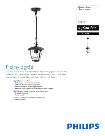 Philips myGarden Oprawa wisząca Creek czarna myGarden 15386/30/16 Piękny ogród Wykreuj urokliwy punkt na patio lub tarasie dzięki czarnej oprawie wiszącej Philips myGarden. Jest ona wykonana z wysokiej jakości aluminium i rzuca ciepłe, białe energooszczędne światło. Tobie pozostaje podziwiać swój ogród. Ogród pełen światła • Dekoracyjne oświetlenie zewnętrzne • Wybierz, aby uzyskać tradycyjny efekt • Wybierz jako zewnętrzne lampy sufitowe • Wysokiej jakości aluminium i doskonałe tworzywa sztuczne Ogród rozświetlony wysokiej jakości światłem • Oszczędność energii • Mocne światło Łatwe w obsłudze oświetlenie zewnętrzne • Wodoodporność 153863016 Oprawa wisząca Creek czarna Zalety Dane techniczne Dekoracyjne oświetlenie zewnętrzne Oświetlenie zewnętrzne może poprawić wygląd ogrodu lub przestrzeni wokół domu poprzez podświetlenie przyciągających uwagę elementów, rozświetlenie ścieżek lub stworzenie doskonałej atmosfery podczas niezapomnianych wieczorów z rodziną i przyjaciółmi. Właśnie dla takich zastosowań firma Philips stworzyła myGarden, czyli serię pięknych, dekoracyjnych, zewnętrznych opraw oświetleniowych charakteryzujących się klasą i funkcjonalnością. Wszystko po to, aby można było w pełni wykorzystać przestrzeń zewnętrzną i nadać jej własny styl. rachunki za prąd i przyczynia się do ochrony środowiska. Mocne światło Dodatkowe funkcje/akcesoria w zestawie Wodoodporność Wymiary i waga produktu • • • • • • • • Wybierz jako lampy sufitowe Dzięki tej zewnętrznej lampie sufitowej maksymalnie wykorzystasz przestrzeń. Jest idealna do oświetlania wejść lub tarasów. Oszczędność energii • Pełna odporność na warunki pogodowe Wysokość: 82 cm Długość: 17,5 cm Szerokość: 17,5 cm Waga netto: 0,720 kg Dane techniczne Ta zaprojektowana w Europie lampa o unikatowym wzorze pozwala osiągnąć tradycyjny efekt na zewnątrz. Ta lampa Philips została zaprojektowana specjalnie do zastosowań zewnętrznych. Jest trwała i będzie oświetlać ogród przez długi czas. Została wykonana z wysokiej jakości odlewanego aluminium i doskonałych tworzyw sztucznych. • Materiał: aluminium, syntetyk • Kolor: czarny Ta lampa zewnętrzna daje mocne, ciepłe, białe światło. Jasny strumień światła odpowiednio oświetli Twój ogród lub taras. Wybierz, aby uzyskać tradycyjny efekt Najwyższej jakości materiały Stylistyka i wykończenie • Ta lampa Philips została zaprojektowana pod kątem wilgotnych miejsc i przeszła rygorystyczne testy, które potwierdziły jej odporność na wodę. Poziom IP określają dwie liczby: pierwsza to poziom ochrony przeciw kurzowi, a druga przeciw wodzie. Poziom IP44 oznacza, że jest odporna na zachlapania. To czyni z niej idealną lampę do zastosowań zewnętrznych. • • • • • • • Zasilanie sieciowe: Przedział 220–240 V, 50–60 Hz Liczba źródeł światła: 1 Trzonek: E27 Moc źródła światła w zestawie: źródło światła niedołączone do zestawu Maksymalna moc wymiennego źródła światła: 60 W Oprawa z możliwością przyciemniania LED: Nie Wbudowane źródło światła LED: NIE Klasa energetyczna dołączonego źródła światła: źródło światła do nabycia osobno Oprawa jest zgodna ze źródłami światła klasy: A++ do E Współczynnik IP: IP44, ochrona przed przedmiotami powyżej 1 mm, ochrona przed rozchlapaną wodą Klasa ochronności: II — podwójna izolacja Serwis • Gwarancja: 2 lata Wymiary i waga opakowania • • • • Wysokość: 27,9 cm Długość: 18,3 cm Szerokość: 18,3 cm Waga: 0,920 kg Różne • Opracowano z myślą o: Ogród i patio • Styl: Tradycyjny • Typ: Oprawa wisząca Ta lampa firmy Philips zużywa mniej energii niż tradycyjne źródła światła, co pozwala zmniejszyć • Data wydania 2016-07-06 © 2016 Koninklijke Philips N.V. Wszelkie prawa zastrzeżone. Wersja: 2.0.1 Dane techniczne mogą ulec zmianie bez powiadomienia. Znaki towarowe są własnością Koninklijke Philips N.V. lub własnością odpowiednich firm. 12 NC: 9150 027 90102 EAN: 87 18291 44350 6 www.philips.com
