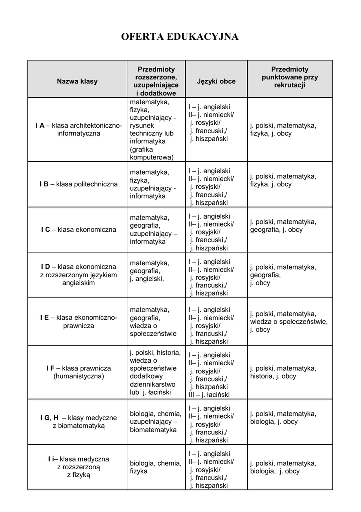 OFERTA EDUKACYJNA Nazwa klasy I A – klasa architektonicznoinformatyczna Przedmioty rozszerzone, uzupełniające i dodatkowe matematyka, fizyka, uzupełniający rysunek techniczny lub informatyka (grafika komputerowa) Języki obce I – j. angielski II– j. niemiecki/ j. rosyjski/ j. francuski,/ j. hiszpański I B – klasa politechniczna matematyka, fizyka, uzupełniający informatyka I – j. angielski II– j. niemiecki/ j. rosyjski/ j. francuski,/ j. hiszpański I C – klasa ekonomiczna matematyka, geografia, uzupełniający – informatyka I – j. angielski II– j. niemiecki/ j. rosyjski/ j. francuski,/ j. hiszpański matematyka, geografia, j. angielski, I – j. angielski II– j. niemiecki/ j. rosyjski/ j. francuski,/ j. hiszpański matematyka, geografia, wiedza o społeczeństwie I – j. angielski II– j. niemiecki/ j. rosyjski/ j. francuski,/ j. hiszpański j. polski, historia, wiedza o społeczeństwie dodatkowy dziennikarstwo lub j. łaciński I – j. angielski II– j. niemiecki/ j. rosyjski/ j. francuski,/ j. hiszpański III – j. łaciński I D – klasa ekonomiczna z rozszerzonym językiem angielskim I E – klasa ekonomicznoprawnicza I F – klasa prawnicza (humanistyczna) I G, H – klasy medyczne z biomatematyką I – j. angielski biologia, chemia, II– j. niemiecki/ uzupełniający – j. rosyjski/ biomatematyka j. francuski,/ j. hiszpański I i– klasa medyczna z rozszerzoną z fizyką I – j. angielski biologia, chemia, II– j. niemiecki/ j. rosyjski/ fizyka j. francuski,/ j. hiszpański Przedmioty punktowane przy rekrutacji j. polski, matematyka, fizyka, j. obcy j. polski, matematyka, fizyka, j. obcy j. polski, matematyka, geografia, j. obcy j. polski, matematyka, geografia, j. obcy j. polski, matematyka, wiedza o społeczeństwie, j. obcy j. polski, matematyka, historia, j. obcy j. polski, matematyka, biologia, j. obcy j. polski, matematyka, biologia, j. obcy