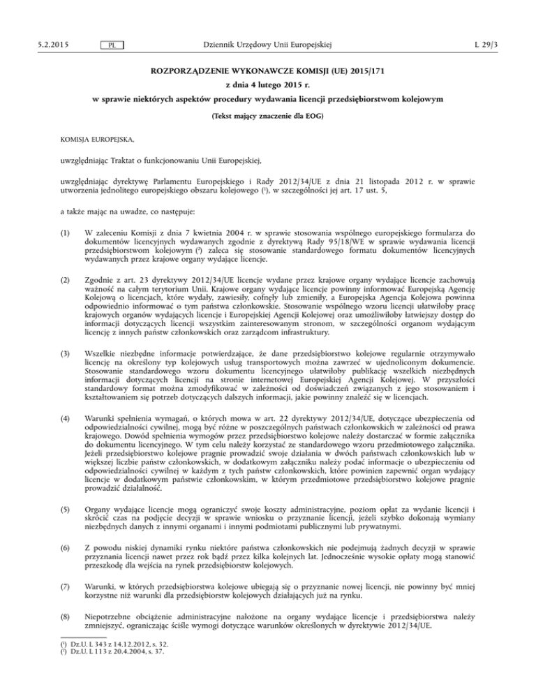 5.2.2015 Dziennik Urzędowy Unii Europejskiej PL L 29/3 ROZPORZĄDZENIE WYKONAWCZE KOMISJI (UE) 2015/171 z dnia 4 lutego 2015 r. w sprawie niektórych aspektów procedury wydawania licencji przedsiębiorstwom kolejowym (Tekst mający znaczenie dla EOG) KOMISJA EUROPEJSKA, uwzględniając Traktat o funkcjonowaniu Unii Europejskiej, uwzględniając dyrektywę Parlamentu Europejskiego i Rady 2012/34/UE z dnia 21 listopada 2012 r. w sprawie utworzenia jednolitego europejskiego obszaru kolejowego (1), w szczególności jej art. 17 ust. 5, a także mając na uwadze, co następuje: (1) W zaleceniu Komisji z dnia 7 kwietnia 2004 r. w sprawie stosowania wspólnego europejskiego formularza do dokumentów licencyjnych wydawanych zgodnie z dyrektywą Rady 95/18/WE w sprawie wydawania licencji przedsiębiorstwom kolejowym (2) zaleca się stosowanie standardowego formatu dokumentów licencyjnych wydawanych przez krajowe organy wydające licencje. (2) Zgodnie z art. 23 dyrektywy 2012/34/UE licencje wydane przez krajowe organy wydające licencje zachowują ważność na całym terytorium Unii. Krajowe organy wydające licencje powinny informować Europejską Agencję Kolejową o licencjach, które wydały, zawiesiły, cofnęły lub zmieniły, a Europejska Agencja Kolejowa powinna odpowiednio informować o tym państwa członkowskie. Stosowanie wspólnego wzoru licencji ułatwiłoby pracę krajowych organów wydających licencje i Europejskiej Agencji Kolejowej oraz umożliwiłoby łatwiejszy dostęp do informacji dotyczących licencji wszystkim zainteresowanym stronom, w szczególności organom wydającym licencję z innych państw członkowskich oraz zarządcom infrastruktury. (3) Wszelkie niezbędne informacje potwierdzające, że dane przedsiębiorstwo kolejowe regularnie otrzymywało licencję na określony typ kolejowych usług transportowych można zawrzeć w ujednoliconym dokumencie. Stosowanie standardowego wzoru dokumentu licencyjnego ułatwiłoby publikację wszelkich niezbędnych informacji dotyczących licencji na stronie internetowej Europejskiej Agencji Kolejowej. W przyszłości standardowy format można zmodyfikować w zależności od doświadczeń związanych z jego stosowaniem i kształtowaniem się potrzeb dotyczących dalszych informacji, jakie powinny znaleźć się w licencjach. (4) Warunki spełnienia wymagań, o których mowa w art. 22 dyrektywy 2012/34/UE, dotyczące ubezpieczenia od odpowiedzialności cywilnej, mogą być różne w poszczególnych państwach członkowskich w zależności od prawa krajowego. Dowód spełnienia wymogów przez przedsiębiorstwo kolejowe należy dostarczać w formie załącznika do dokumentu licencyjnego. W tym celu należy korzystać ze standardowego wzoru przedmiotowego załącznika. Jeżeli przedsiębiorstwo kolejowe pragnie prowadzić swoje działania w dwóch państwach członkowskich lub w większej liczbie państw członkowskich, w dodatkowym załączniku należy podać informacje o ubezpieczeniu od odpowiedzialności cywilnej w każdym z tych państw członkowskich, które powinien zapewnić organ wydający licencje w dodatkowym państwie członkowskim, w którym przedmiotowe przedsiębiorstwo kolejowe pragnie prowadzić działalność. (5) Organy wydające licencje mogą ograniczyć swoje koszty administracyjne, poziom opłat za wydanie licencji i skrócić czas na podjęcie decyzji w sprawie wniosku o przyznanie licencji, jeżeli szybko dokonają wymiany niezbędnych danych z innymi organami i innymi podmiotami publicznymi lub prywatnymi. (6) Z powodu niskiej dynamiki rynku niektóre państwa członkowskich nie podejmują żadnych decyzji w sprawie przyznania licencji nawet przez rok bądź przez kilka kolejnych lat. Jednocześnie wysokie opłaty mogą stanowić przeszkodę dla wejścia na rynek przedsiębiorstw kolejowych. (7) Warunki, w których przedsiębiorstwa kolejowe ubiegają się o przyznanie nowej licencji, nie powinny być mniej korzystne niż warunki dla przedsiębiorstw kolejowych działających już na rynku. (8) Niepotrzebne obciążenie administracyjne nałożone na organy wydające licencje i przedsiębiorstwa należy zmniejszyć, ograniczając ściśle wymogi dotyczące warunków określonych w dyrektywie 2012/34/UE. (1) Dz.U. L 343 z 14.12.2012, s. 32. (2) Dz.U. L 113 z 20.4.2004, s. 37. L 29/4 Dziennik Urzędowy Unii Europejskiej PL 5.2.2015 (9) Organy wydające licencje nie są w żadnym stopniu zobowiązane do żądania opłaty za wydanie licencji od przedsiębiorstwa kolejowego. Państwa członkowskie mogą jednak zdecydować o nałożeniu takiej opłaty za pracę związaną ze sprawdzaniem wniosku przez organy wydające licencje. W takim przypadku opłata za wydanie licencji powinna być niedyskryminacyjna, skutecznie pobierana od wszystkich przedsiębiorstw ubiegających się o licencję oraz oparta na faktycznym nakładzie pracy organu wydającego licencje. Jeżeli opłata za wydanie licencji przekracza 5 000 EUR, organ wydający licencje określa liczbę osobogodzin i poniesione wydatki w rozliczeniu przedmiotowej opłaty. (10) W celu stworzenia równych szans dla przedsiębiorstw kolejowych, w dyrektywie 2012/34/UE uchylono niektóre ustalenia niezgodne ze zwiększonymi warunkami rynkowymi, na mocy których przedsiębiorstwa kolejowe muszą być ubezpieczone lub posiadać odpowiednie gwarancje na warunkach rynkowych. Należy zwrócić się do organów wydających licencje o weryfikację wdrożenia zmienionych warunków we współpracy z innymi organami państw członkowskich. (11) Przyznanie licencji przedsiębiorstwu kolejowemu nie powinno być uzależnione od posiadania przez nie certyfikatu bezpieczeństwa, o którym mowa w art. 10 dyrektywy 2004/49/WE Parlamentu Europejskiego i Rady (1). (12) Nowe przedsiębiorstwa kolejowe mają decydujące znaczenie dla konkurencji, lecz mogą mieć praktyczne trudności z przedstawieniem historii ich zdolności finansowej pozwalającej im na ustanowienie realistycznych z
