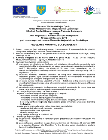 Europejski Fundusz Rolny na rzecz Rozwoju Obszarów Wiejskich Europejski Fundusz Rolny na rzecz Rozwoju Obszarów Wiejskich: Europa inwestująca w obszary wiejskie Muzeum Wsi Opolskiej w Opolu, Urząd Marszałkowski Województwa Opolskiego i Oddział Opolski Stowarzyszenia Twórców Ludowych ogłaszają XXIII Wojewódzki Konkurs Plastyki Obrzędowej Kroszonki Opolskie 2014 pod honorowym patronatem Marszałka Województwa Opolskiego REGULAMIN KONKURSU DLA DOROSŁYCH 1. Celem konkursu jest dokumentowanie, kultywowanie i upowszechnianie plastyki obrzędowej związanej z okresem Świąt Wielkanocnych. 2. Konkurs adresowany jest do wszystkich mieszkańców województwa opolskiego, którzy ukończyli 16 lat. 3. Konkurs odbędzie się 25 marca 2014 r. w godz. 10.30 – 13.30 w sali budynku Muzeum Wsi Opolskiej – Opole, ul. Wrocławska 174. 4. Wymagania dotyczące uczestnictwa: a) warunkiem przystąpienia do konkursu jest podpisanie się na liście uczestników oraz wypełnienie i oddanie oświadczenia wg wzoru stanowiącego załącznik do regulaminu (zał.1). Uczestnicy, którzy nie ukończyli 18 roku życia, zobowiązani są do dostarczenia i oddania osobnego oświadczenia wg wzoru stanowiącego załącznik do regulaminu (zał.2). b) uczestnik konkursu powinien przynieść ze sobą dwie własnoręcznie zdobione kroszonki, pisanki, jajka trawione kwasem, oklejanki lub obszywanki, narzędzia do wykonania prac oraz jajko przygotowane do zdobienia. c) w czasie trwania konkursu uczestnik wykona – dodatkowo jedną pracę konkursową dowolną techniką zdobniczą taką, jak: pisanie woskiem, drapanie, trawienie, oklejanie lub obszywanie. d) po zakończeniu przewodu konkursowego uczestnik przekazuje do oceny Jury trzy prace, w tym jedną wykonaną podczas przewodu konkursowego 5. Informacje dotyczące oceny prac konkursowych: a) prace oceniane będą według następujących kategorii: - wykonane techniką rytowniczą (drapane), - wykonane techniką batikową (pisane woskiem), - wykonane innymi technikami (np. trawione kwasem, oklejane, obszywanie) Do oceny konkursowej będą dopuszczone prace wykonane wyłącznie techniką tradycyjną. b) przy ocenie prac pod uwagę wzięte będą takie elementy jak: - zachowanie tradycyjnych motywów i kolorystyki - precyzja i dokładność wykonania - walory artystyczne c) jury stosuje punktację w skali 0-10 pkt. 6. Informacje dotyczące prac a) nagrodzone i wyróżnione w konkursie prace przechodzą na własność Muzeum Wsi Opolskiej b) pozostałe prace uczestnicy mogą odebrać w terminie od 16 maja do 30 czerwca 2014 r. w siedzibie Muzeum Wsi Opolskiej. Po tym terminie prace nieodebrane zostaną komisyjnie zlikwidowane. Projekt współfinansowany ze środków Unii Europejskiej w ramach Schematu III Pomocy Technicznej Programu Rozwoju Obszarów Wiejskich na lata 2007-2013 Instytucja Zarządzająca Programem Rozwoju Obszarów Wiejskich na lata 2007-2013 – Minister Rolnictwa i Rozwoju Wsi Europejski Fundusz Rolny na rzecz Rozwoju Obszarów Wiejskich Europejski Fundusz Rolny na rzecz Rozwoju Obszarów Wiejskich: Europa inwestująca w obszary wiejskie 7. Nagrody: a) dla zdobywcy maksymalnej liczby punktów - Nagroda Specjalna im. Jerzego Lipki 600,-zł b) za najlepsze prace konkursowe w każdej kategorii zostaną przyznane nagrody i wyróżnienia: I nagroda w wysokości 350,-zł II nagroda w wysokości 250,-zł III nagroda w wysokości 200,-zł 10 wyróżnień w wysokości 100,-zł c) łączna pula nagród wynosi do 6 000 zł. d) o przyznaniu nagród decyduje komisja konkursowa powołana przez organizatorów e) komisja konkursowa posiada prawo zmiany wysokości nagród i ich podziału. 8. Nagrody w konkursie współfinansowane będą ze środków UE, Europejskiego Funduszu Rolnego na rzecz Rozwoju Obszarów Wiejskich w ramach Schematu III Pomocy Technicznej Programu Rozwoju Obszarów Wiejskich na lata 2007-2013. 9. Wręczenie dyplomów, nagród i wyróżnień odbędzie się w dniu 13 kwietnia 2014 r. o godz. 10.30 w Muzeum Wsi Opolskiej w Opolu podczas „Jarmarku Wielkanocnego”. Do odbioru nagród uprawnieni są wyłącznie autorzy prac, oraz rodzice lub opiekunowie prawni osób nieletnich po uprzednim okazaniu ważnego dokumentu tożsamości. 10. Nagrody nieodebrane podczas uroczystości można odebrać w siedzibie Muzeum Wsi Opolskiej do dnia 30 kwietnia 2014 r. Po tym terminie nagrody przechodzą na własność organizatora. 11. Nagrodzone i wyróżnione prace będą prezentowane na wystawie pokonkursowej, której otwarcie nastąpi w dniu 13 kwietnia 2014 r. w Muzeum Wsi Opolskiej, podczas imprezy plenerowej „Jarmark Wielkanocny”. 12. Wszelkie informacje związane z organizacją konkursu można uzyskać od poniedziałku do piątku, w godz. 8.00 – 14.00, tel. 77 4743021, 77 4572349. 13. Przystąpienie do konkursu jest jednoznaczne z akceptacją warunków regulaminu U W A G A: organizatorzy nie pokrywają kosztów przejazdu Projekt współfinansowany ze środków Unii Europejskiej w ramach Schematu III Pomocy Technicznej Programu Rozwoju Obszarów Wiejskich na lata 2007-2013 Instytucja Zarządzająca Programem Rozwoju Obszarów Wiejskich na lata 2007-2013 – Minister Rolnictwa i Rozwoju Wsi Europejski Fundusz Rolny na rzecz Rozwoju Obszarów Wiejskich Europejski Fundusz Rolny na rzecz Rozwoju Obszarów Wiejskich: Europa inwestująca w obszary wiejskie Zał. 1 Opole, 25.03.2014 OŚWIADCZENIE Oświadczam, ze jestem autorką/autorem* prac zgłoszonych do XXIII Wojewódzkiego Konkursu Plastyki Obrzędowej Kroszonki Opolskie 2014. W przypadku przyznania nagrody lub wyróżnienia wyrażam zgodę na przekazanie tych prac w formie darowizny dla Muzeum Wsi Opolskiej w Opolu. Jednocześnie przenoszę majątkowe prawa autorskie przynależne tym pracom na rzecz Muzeum Wsi Opolskiej w Opolu – nieodpłatnie i na czas nieokreślony – w tym między innymi prawo reprodukowania ich w celach reklamowych, informacyjnych, wydawniczych i naukowych. ………………