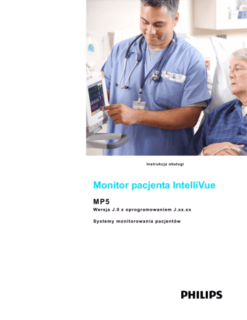 Instr ukc ja o bs łu gi Monitor pacjenta IntelliVue MP5 Wersja J. 0 z op rog ramo wa niem J.xx.x x Systemy m onito rowan ia pa cjentów 1 Spis treści 1 Instalacja Lista kontrolna instalacji Rozpakowywanie i kontrola przesyłki Montaż monitora Podłączanie monitora do sieci elektrycznej Sprawdzanie stanu monitora Wkładanie papieru Obsługa monitora Ustawianie daty i czasu Sprawdzanie ustawień domyślnych dla danego kraju Przekazywanie monitora 2 Obsługa podstawowa Omówienie monitora Obsługa i nawigacja Tryby pracy Informacje dotyczące ekranów Korzystanie ze zdalnego wyświetlacza XDS (nie dotyczy MP5T/MP5SC) Korzystanie z ekranu dla gości Informacje dotyczące profilów Informacje dotyczące ustawień Zmiana prędkości kreślenia krzywej Zamrażanie krzywych Korzystanie z nazw pomiarów Ręczne wprowadzanie pomiarów Zmiana ustawień monitora Sprawdzanie wersji monitora Rozpoczynanie pracy Odłączanie od źródła zasilania Monitorowanie sieciowe (nie dotyczy MP5SC) Korzystanie z monitora MP5 z monitorem głównym 11 11 12 13 13 14 14 15 16 16 17 19 20 24 31 33 34 34 35 36 37 38 39 41 42 43 43 45 45 46 3 Co nowego? 49 Co nowego w wersji J.0? Co nowego w wersji H.0? Co nowego w wersji G.0? Co nowego w wersji F.0? 49 51 52 53 3 4 Alarmy Wizualna sygnalizacja alarmowa Dźwiękowa sygnalizacja alarmowa Potwierdzanie alarmów Pauzowanie lub wyłączanie alarmów Progi alarmu Przeglądanie alarmów Podtrzymanie alarmów Testowanie alarmów Zachowanie alarmów przy włączonym zasilaniu Rejestracje alarmów 5 Alarmy pacjenta i komunikaty techniczne Komunikaty alarmów pacjenta Techniczne komunikaty alarmowe 6 Zarządzanie pacjentami i urządzeniami Pojęcia dotyczące pacjenta Pojęcia dotyczące urządzenia Zarządzanie pacjentami Zarządzanie urządzeniami Kompatybilność Systemu Informacyjnego 7 EKG, arytmia, monitorowanie ST i QT Przygotowanie skóry przed zamocowaniem elektrod Podłączanie kabli EKG Wybór głównego i dodatkowego odprowadzenia EKG Sprawdzanie trybu stymulacji Informacje dotyczące ekranu EKG Monitorowanie pacjentów stymulowanych Zmiana wzmocnienia krzywej EKG Zmiana głośności sygnału QRS Zmiana ustawień filtracji EKG Wybór rozmieszczenia odprowadzeń przedsercowych Va i Vb (w układzie 6 odprowadzeń) Wybór pomiędzy układem odprowadzeń EASI i standardowym Informacje na temat odprowadzeń EKG Zastępowanie odprowadzeń EKG (Fallback) Rozmieszczenie odprowadzeń EKG Funkcja przechwycenia 12 odprowadzeń Przegląd alarmów EKG i arytmii Korzystanie z alarmów EKG Informacje dotyczące bezpieczeństwa EKG Informacje dotyczące monitorowania arytmii Włączanie i wyłączanie analizy arytmii Wybieranie odprowadzenia EKG dla monitorowania arytmii 4 57 58 60 62 63 66 70 71 72 72 73 75 75 82 103 103 103 104 114 129 131 131 131 132 132 133 134 135 136 136 137 137 137 138 139 145 149 150 151 153 154 154 Informacje dotyczące ekranu arytmii Ponowna nauka arytmii Alarmy arytmii Informacje dotyczące monitorowania odcinka ST Włączanie i wyłączanie monitorowania odcinka ST i analizy STE Informacje na ekranie ST Aktualizacja wycinków linii podstawowej ST Rejestracja odcinka ST Informacje o punktach pomiarowych ST Alarmy ST Alarmy STE Przeglądanie ST Map Monitorowanie odstępu QT/QTc Alarmy QT Włączanie i wyłączanie funkcji monitorowania QT 8 Monitorowanie częstości tętna Otwieranie menu ustawień tętna Systemowe źródło tętna Włączanie i wyłączanie tętna Stosowanie alarmów tętna 9 Monitorowanie częstości oddechów (Oddech) Rozmieszczenie odprowadzeń dla monitorowania oddechu Informacje dotyczące ekranu oddechu Zmiana trybów detekcji oddechu Zmiana wielkości wykresu czynności oddechowej Zmiana prędkości kreślenia krzywej oddechu Stosowanie alarmów oddechu Zmiana zwłoki alarmu bezdechu Informacje dotyczące bezpieczeństwa pomiarów oddechu 10 Monitorowanie SpO2 Czujniki SpO2 Mocowanie czujnika Podłączanie kabli SpO2 Pomiar SpO2 Informacje dotyczące odczytów numerycznych pomiarów SpO2 Ocena wątpliwego odczytu SpO2 Zmiana czasu uśredniania Ustawianie trybu pomiaru Informacje o alarmach SpO2 Krzywa pletyzmograficzna Odczyt numeryczny perfuzji 156 158 160 164 165 166 168 169 169 171 172 172 176 179 180 181 181 181 182 182 185 185 186 187 188 188 188 188 189 191 191 191 192 193 194 195 195 196 196 202 202 5 Wskaźnik zmiany perfuzji Ustawianie SpO2/Plety jako źródła tętna Ustawianie modulacji sygnału Ustawianie głośności QRS 11 Monitorowanie NBP Podstawowe informacje dotyczące pomiaru NBP metodą oscylometryczną Przygotowanie do pomiaru NBP Rozpoczynanie i kończenie pomiarów Uruchamianie trybu automatycznego i ustawianie czasu powtarzania Włączanie trybu sekwencyjnego i konfiguracja sekwencji Wybieranie źródła alarmów NBP Włączanie i wyłączanie pomiaru tętna na podstawie NBP Wykonywanie wenopunkcji Wykonywanie kalibracji pomiarów NBP 12 Pomiar temperatury przewidywanej Wykonywanie pomiaru temperatury 13 Monitorowanie temperatury Wykonywanie pomiaru temperatury Obliczanie różnicy temperatur 14 Monitorowanie ciśnień inwazyjnych Konfiguracja pomiaru ciśnienia Zerowanie przetwornika ciśnienia Ustawianie współczynnika kalibracyjnego Wyświetlanie tylko odczytu ciśnienia średniego Zmiana skali krzywej ciśnienia Optymalizacja wykresu Korzystanie z kursora krzywych Ignorowanie artefaktów pochodzenia niefizjologicznego Wybieranie źródła alarmów ciśnienia Kalibracja przetwornika wielorazowego CPJ840J6 Obliczanie ciśnienia perfuzji mózgowej Obliczanie zmienności ciśnienia tętna Pomiar IAP 15 Monitorowanie poziomu dwutlenku węgla Zasady pomiaru Wykonywanie pomiaru CO2 Pomiar CO2 metodą Microstream Konfiguracja wszystkich pomiarów CO2 Informacje dotyczące odczytów numerycznych wskaźnika IPI 6 203 203 203 203 205 205 207 209 210 211 211 212 212 212 213 213 217 217 218 219 219 221 223 223 223 223 223 224 224 225 227 227 228 231 232 232 236 238 240 16 Korzystanie z bezkablowych urządzeń 
