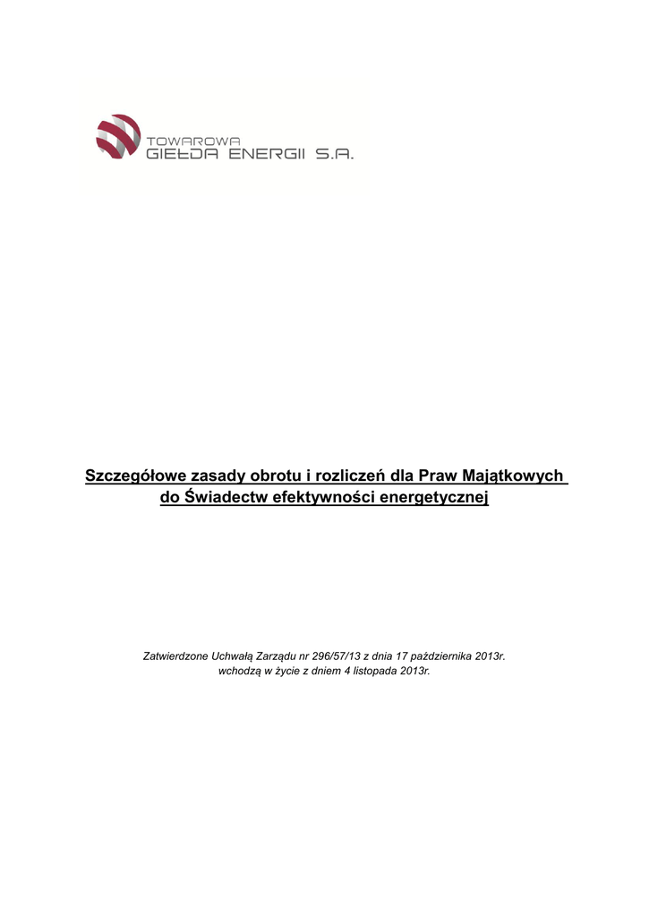 Szczegółowe zasady obrotu i rozliczeń dla Praw Majątkowych do Świadectw efektywności energetycznej Zatwierdzone Uchwałą Zarządu nr 296/57/13 z dnia 17 października 2013r. wchodzą w życie z dniem 4 listopada 2013r. Rozdział 1. Definicje 1) Członek Giełdy – podmiot posiadający status Członka Giełdy i dopuszczony przez Zarząd Giełdy do działania na RPM w zakresie Praw Majątkowych efektywności energetycznej, 2) Członek Rejestru – podmiot posiadający konto ewidencyjne w Rejestrze, 3) Dzień Dostawy – dzień, w którym Prawo Majątkowe zakontraktowane na RPM w Dniu Obrotu i wynikające z niego Świadectwo Pochodzenia, zostanie zarejestrowane na koncie ewidencyjnym w odpowiednim rejestrze, 4) Dzień Obrotu – dzień, kiedy odbywa się sesja RPM lub dzień akceptacji transakcji pozasesyjnych, 5) Dzień T – dzień zawarcia transakcji, 6) Izba Rozliczeniowa – Izba Rozliczeniowa Giełd Towarowych S.A. z siedzibą w Warszawie prowadząca izbę rozliczeniową i rozrachunkową, która pełni funkcję giełdowej izby rozrachunkowej, zgodnie z ustawą o obrocie instrumentami finansowymi, 7) giełda – Rynek Towarów Giełdowych prowadzony przez Towarową Giełdę Energii S.A. zgodnie z Regulaminem Giełdy, 8) Giełda – Towarowa Giełda Energii S.A., 9) Kalendarz – określany przez Giełdę „Kalendarz składania zleceń i notowań Praw majątkowych do Świadectw efektywności energetycznej”, 10) Niepubliczna strona internetowa – strona internetowa dostępna tylko dla danego Członka Giełdy i dla Giełdy, 11) Prawa Majątkowe – zbywalne i stanowiące towar giełdowy prawa wynikające ze Świadectw efektywności energetycznej , 12) Regulamin Giełdy – Regulamin obrotu Rynku Towarów Giełdowych Towarowej Giełdy Energii S.A., 13) Rejestr – RŚP - Rejestr Świadectw Pochodzenia oraz wynikających z nich Praw Majątkowych prowadzony przez Towarową Giełdę Energii S.A., 14) RPM – Rynek Praw Majątkowych prowadzony przez Towarową Giełdę Energii S.A. zgodnie z Regulaminem Giełdy, 15) system informatyczny giełdy – zespół urządzeń i oprogramowania, w szczególności wyspecjalizowany program komputerowy, za pośrednictwem, którego odbywa się obrót na RPM, 16) system informatyczny rejestru – system Rejestru Świadectw Pochodzenia służący do prowadzenia rejestru Praw Majątkowych, 17) Szczegółowe zasady obrotu i rozliczeń – niniejsze Szczegółowe zasady obrotu i rozliczeń dla Praw Majątkowych do Świadectw efektywności energetycznej, 18) Świadectwo efektywności energetycznej – świadectwo, o którym mowa w art. 25 ust. 1 ustawy z dnia 15 kwietnia 2011 r. o efektywności energetycznej (Dz. U. Nr 94, poz. 551); 19) tabela zleceń – uporządkowane zestawienie zleceń kupna i sprzedaży, 20) toe – tona oleju ekwiwalentnego w rozumieniu ustawy o efektywności energetycznej, 21) TPNR – Transakcja pozasesyjna nierozliczana, transakcja pozasesyjna, której rozliczenie pieniężne odbywa się bez pośrednictwa Giełdy, 22) TPR – Transakcja pozasesyjna rozliczana, transakcja pozasesyjna, której rozliczenie pieniężne odbywa się za pośrednictwem Giełdy, Strona 2 z 17 23) transakcja – umowa sprzedaży Praw Majątkowych zawarta między Członkami Giełdy na RPM, 24) transakcja pozasesyjna – umowa sprzedaży Praw Majątkowych zawarta między Członkami Giełdy poza sesją RPM, 25) URE - Urząd Regulacji Energetyki, 26) ustawa o efektywności energetycznej – ustawa z dnia 15 kwietnia 2011 r. o efektywności energetycznej (Dz. U. z 2011 r. Nr 94; poz. 551), 27) zlecenie – złożona przez Członka Giełdy oferta kupna lub sprzedaży Praw Majątkowych na RPM. Strona 3 z 17 Rozdział 2. Postanowienia ogólne Oddział 1. Oznaczenie rodzaju, termin rozpoczęcia oraz prowadzenia obrotu Praw Majątkowych §1 Prawa Majątkowe wynikające ze Świadectw efektywności energetycznej są towarem giełdowym. Prawa Majątkowe są zapisywane na koncie ewidencyjnym w Rejestrze na podstawie Świadectw efektywności energetycznej wydanych przez Prezesa URE dla zrealizowanych przedsięwzięć służących poprawie efektywności energetycznej, na zasadach określonych w ustawie o efektywności energetycznej. §2 Prawa Majątkowe powstają z chwilą zapisania Świadectw Pochodzenia na koncie ewidencyjnym podmiotu, któremu przysługują. Liczba Praw Majątkowych odpowiada wartości toe wykazanej w danym Świadectwie efektywności energetycznej, przy czym jedno Prawo Majątkowe odpowiada 0,001 toe. Prawa Majątkowe są przypisane Świadectwom efektywności energetycznej, z których wynikają. §3 Prawa Majątkowe występują w formie zdematerializowanej, w postaci zapisu elektronicznego w systemie ewidencyjnym Rejestru. §4 Obrót Prawami Majątkowymi odbywa się na giełdzie w trakcie trwania sesji, jak również poza nią, w formie transakcji pozasesyjnych. §5 Wprowadzenie do obrotu poszczególnych Praw Majątkowych następuje z chwilą zapisania ich na koncie ewidencyjnym Członka Rejestru, któremu one przysługują. §6 Prawa Majątkowe są notowane od chwili wprowadzenia ich do obrotu do momentu dokonania ich blokady, w związku z zamiarem umorzenia Świadectwa efektywności energetycznej, z którego wynikają. Świadectwo efektywności energetycznej umorzone do dnia 31 marca danego roku kalendarzowego jest uwzględniane przy rozliczeniu obowiązku umarzania świadectw w poprzednim roku kalendarzowym. Zgodnie z art. 27 ust. 7 ustawy o efektywności energetycznej, Prawa Majątkowe nie umorzone do dnia 31 marca 2016 r., wygasają z mocy prawa z dniem 1 kwietnia 2016 r. §7 Prawa Majątkowe wygasają w przypadku umorzenia Świadectwa efektywności energetycznej, z którego wynikają. Umorzenie Świadectwa efektywności energetycznej może być dokonane w całości albo w części. Umorzenie Świadectwa efektywności energetycznej powoduje wygaśnięcie wszystkich lub części Praw Majątkowych z niego wynikających. Zgodnie z art. 27 ust. 7 