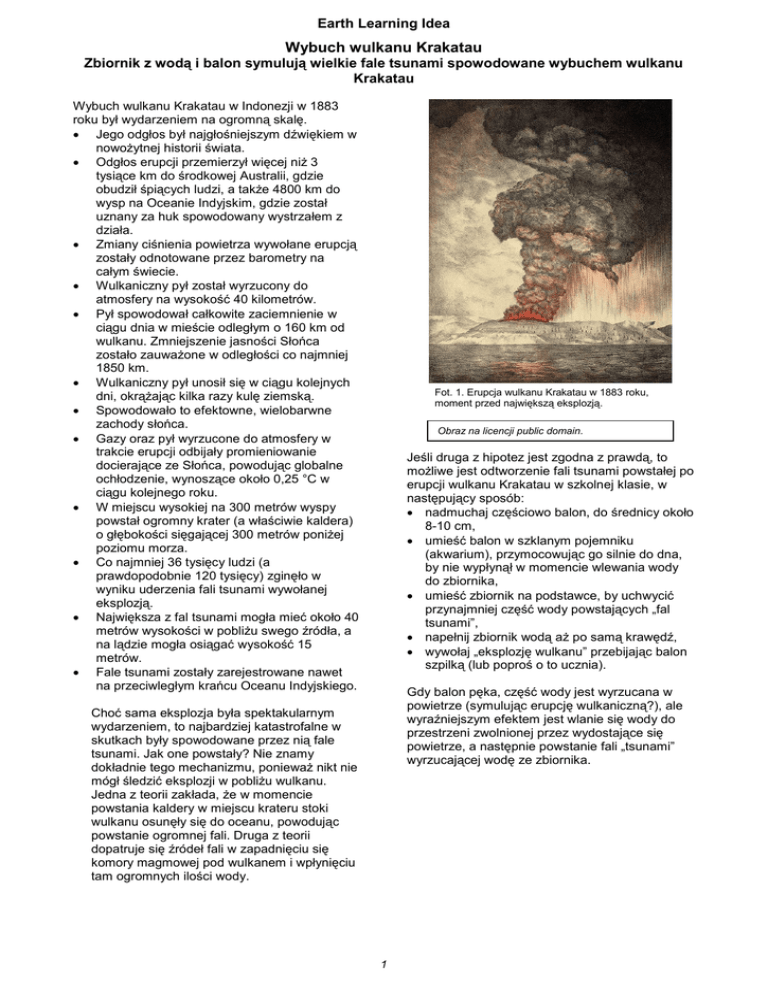 Earth Learning Idea Wybuch wulkanu Krakatau Zbiornik z wodą i balon symulują wielkie fale tsunami spowodowane wybuchem wulkanu Krakatau Wybuch wulkanu Krakatau w Indonezji w 1883 roku był wydarzeniem na ogromną skalę. Jego odgłos był najgłośniejszym dźwiękiem w nowożytnej historii świata. Odgłos erupcji przemierzył więcej niż 3 tysiące km do środkowej Australii, gdzie obudził śpiących ludzi, a także 4800 km do wysp na Oceanie Indyjskim, gdzie został uznany za huk spowodowany wystrzałem z działa. Zmiany ciśnienia powietrza wywołane erupcją zostały odnotowane przez barometry na całym świecie. Wulkaniczny pył został wyrzucony do atmosfery na wysokość 40 kilometrów. Pył spowodował całkowite zaciemnienie w ciągu dnia w mieście odległym o 160 km od wulkanu. Zmniejszenie jasności Słońca zostało zauważone w odległości co najmniej 1850 km. Wulkaniczny pył unosił się w ciągu kolejnych dni, okrążając kilka razy kulę ziemską. Spowodowało to efektowne, wielobarwne zachody słońca. Gazy oraz pył wyrzucone do atmosfery w trakcie erupcji odbijały promieniowanie docierające ze Słońca, powodując globalne ochłodzenie, wynoszące około 0,25 °C w ciągu kolejnego roku. W miejscu wysokiej na 300 metrów wyspy powstał ogromny krater (a właściwie kaldera) o głębokości sięgającej 300 metrów poniżej poziomu morza. Co najmniej 36 tysięcy ludzi (a prawdopodobnie 120 tysięcy) zginęło w wyniku uderzenia fali tsunami wywołanej eksplozją. Największa z fal tsunami mogła mieć około 40 metrów wysokości w pobliżu swego źródła, a na lądzie mogła osiągać wysokość 15 metrów. Fale tsunami zostały zarejestrowane nawet na przeciwległym krańcu Oceanu Indyjskiego. Fot. 1. Erupcja wulkanu Krakatau w 1883 roku, moment przed największą eksplozją. Obraz na licencji public domain. Jeśli druga z hipotez jest zgodna z prawdą, to możliwe jest odtworzenie fali tsunami powstałej po erupcji wulkanu Krakatau w szkolnej klasie, w następujący sposób: nadmuchaj częściowo balon, do średnicy około 8-10 cm, umieść balon w szklanym pojemniku (akwarium), przymocowując go silnie do dna, by nie wypłynął w momencie wlewania wody do zbiornika, umieść zbiornik na podstawce, by uchwycić przynajmniej część wody powstających „fal tsunami”, napełnij zbiornik wodą aż po samą krawędź, wywołaj „eksplozję wulkanu” przebijając balon szpilką (lub poproś o to ucznia). Gdy balon pęka, część wody jest wyrzucana w powietrze (symulując erupcję wulkaniczną?), ale wyraźniejszym efektem jest wlanie się wody do przestrzeni zwolnionej przez wydostające się powietrze, a następnie powstanie fali „tsunami” wyrzucającej wodę ze zbiornika. Choć sama eksplozja była spektakularnym wydarzeniem, to najbardziej katastrofalne w skutkach były spowodowane przez nią fale tsunami. Jak one powstały? Nie znamy dokładnie tego mechanizmu, ponieważ nikt nie mógł śledzić eksplozji w pobliżu wulkanu. Jedna z teorii zakłada, że w momencie powstania kaldery w miejscu krateru stoki wulkanu osunęły się do oceanu, powodując powstanie ogromnej fali. Druga z teorii dopatruje się źródeł fali w zapadnięciu się komory magmowej pod wulkanem i wpłynięciu tam ogromnych ilości wody. 1 Earth Learning Idea Fig. 2. „Krakatau” przed eksplozją. Fig. 3. Fala „tsunami” wywołana przez „eksplozję wulkanu”. Oba zdjęcia wykonane przez Lucy Greenwood. Informacje pomocnicze się trzy kolejne fale kolosalnych rozmiarów. I przed naszymi oczami to straszne wrzenie morza pochłonęło w jednej chwili ruiny miasta. Tam, gdzie kilka minut temu istniało miasto Telok Belong, nie było nic oprócz otwartego morza.” (za: McGuire, M, (2002) Raging Planet. Hove, East Sussex: Apple, str. 63.) Tytuł: Wybuch wulkanu Krakatau Podtytuł: Zbiornik z wodą i balon symulują wielkie fale tsunami spowodowane wybuchem wulkanu Krakatau Temat: Eksperyment odtwarzający, zgodnie z jedną z teorii, sposób powstania fal tsunami po eksplozji wulkanu Krakatau Dodatkowe ćwiczenia: Uczniowie mogą odszukać informacje o skutkach innych katastrofalnych erupcji wulkanicznych, w bibliotece lub w internecie. Wiek uczniów: 5 lat i więcej Mechanizmy rządzące powstawaniem fali tsunami: Gdy magma jest wyrzucana gwałtownie z komory magmowej, doprowadza to do jej katastrofalnego zapadnięcia się i utworzenia kaldery. Zarówno wypełnienie kaldery wodą, jak i osunięcie się do morza stoków wulkanu, mogą doprowadzić do powstania fal tsunami. Fale tsunami mogą przemierzać ogromne obszary oceanów, niszcząc nisko położone wybrzeża. Czas potrzebny na wykonanie doświadczenia: Około 10 minut na przygotowanie zbiornika; milisekundy na zaobserwowanie efektów przebicia balonu. Korzyści dla uczniów: Uczniowie mogą: opisać jeden z mechanizmów powstawania fal tsunami, odkryć skalę oddziaływania katastrof wywołanych procesami geologicznymi. Kontekst: Eksplozja wulkanu Krakatau była pierwszą dużą erupcją wulkaniczną zbadaną naukowo. W skali VEI (Indeks Eksplozywności Wulkanicznej) jest ona opisywana jako „kolosalna”, ponieważ objętość wyrzuconych 3 materiałów wyniosła więcej niż 100 km . (Erupcja wulkanu Tambora w 1815 roku, również na terenie Indonezji, była eksplozją „superkolosalną”, ponieważ spowodowała wyrzucenie ponad 1000 3 km materii. Z kolei wybuch wulkanu Taupo na Nowej Zelandii, 28 tys. lat temu, był erupcją „megakolosalną”, która doprowadziła do 3 wyrzucenia do atmosfery więcej niż 10000 km pyłów i gazów. Obie te erupcje miały jednak miejsce przed rozpoczęciem badań.) Mamy więc stosunkowo dobry zapis skutków takiej eksplozji, choć nie rozumiemy jeszcze do końca mechanizmów erupcji oraz powstawania fal tsunami. Zdobyte umiejętności: Eksperyment stanowi pomost pomiędzy modelem a rzeczywistym procesem i jego skutkami. Potrzebne materiały: zbiornik, na przykład plasti