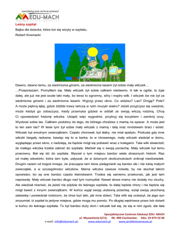 Leśny szpital Bajka dla dziecka, które boi się wizyty w szpitalu. Robert Kownacki Dawno, dawno temu, za siedmioma górami, za siedmioma lasami żył sobie mały wilczek… …Przepraszam. Pomyliłem się. Mały wilczek żył sobie całkiem niedawno. A tak w ogóle, to żyje dalej, ale już nie jest wcale taki mały, bo teraz to ogromny, silny i mądry wilk. I wilczek ów nie żył za siedmioma górami i za siedmioma lasami. Wyjrzyj przez okno. Co widzisz? Las? Drogę? Pole? A może piękną łąkę, gdzie źdźbła trawy tańczą w rytm muzyki wiatru? Jeżeli przyjrzysz się uważnie, może kiedyś go zobaczysz, kiedy przemyka gdzieś w oddali ze swoją wilczą rodziną. Chcę Ci opowiedzieć historię wilczka. Usiądź więc wygodnie, przykryj się kocykiem i zamknij oczy. Wyobraź sobie las. Całkiem podobny do tego, do którego chodzisz z mamą na spacer. A może jest to ten sam las? W lesie tym żył sobie mały wilczek z mamą i tatą oraz mnóstwem braci i sióstr. Wilczek był smutnym zwierzątkiem. Często chorował, był słaby, nie miał apetytu. Podczas gdy inne wilczki biegały radosne, bawiąc się to w berka, to w chowanego, mały wilczek siedział w domu, wyglądając przez okno, z nadzieją, że będzie mógł się pobawić wraz z kolegami. Tata wilk stwierdził, że małego wilczka trzeba zabrać do szpitala. Martwił się o swoją pociechę. Mały wilczek był temu przeciwny. Bał się iść do szpitala. Słyszał o tym miejscu bardzo wiele strasznych historii. Raz od małej wiewiórki, która tam była, usłyszał, że w dziwnych okolicznościach zniknął niedźwiadek. Drugim razem od kogoś innego, że pracujące tam lisice pielęgniarki są bardzo złe i nie lubią małych zwierzątek, a w szczególności wilczków. Mama wilczka zawsze mówiła, by nie słuchał takich opowieści, bo są one bardzo często kłamstwami. Trzeba się samemu przekonać, jak jest tam naprawdę. Mały wilczek bardzo długo nad tym rozmyślał. Nawet słowa mamy nie dodały mu otuchy. Ale wiedział również, że jeżeli nie pójdzie do leśnego szpitala, to dalej będzie chory i nie będzie się mógł bawić z innymi zwierzątkami. W końcu wyjął swoją ulubioną piżamkę, wziął swoją ukochaną zabawkę i powiedział rodzicom, że chce być taki, jak inne dzieci. Tata wilk się ucieszył, że jego syn zrozumiał, iż szpital to jedyne miejsce, gdzie mogą mu pomóc. Po długiej wędrówce przez bór dotarli w końcu do leśnego szpitala. To był bardzo duży dom i wilczek bał się, że się w nim zgubi, ale tata Specjalistyczne Centrum Edukacji EDU- MACH ul. Wyzwolenia 6/12; 06- 400 Ciechanów; faks: 23 673 52 66 e-mail: [email protected]; www.edumach.pl www.problemywnauce.pl natychmiast mu wytłumaczył, że wilki potrafią zawsze odnaleźć słuszną drogę. Jak się okazało, leśny szpital nie był aż tak bardzo straszny. Było tam mnóstwo zwierzątek, małych i dużych. Równie chorych, jak on, ale zwierzątka nie były wystraszone. Mały wilczek zdecydował, że on również nie będzie się bał. W końcu jest wilkiem, a wilki są odważne. Szybko się zaprzyjaźnił z innymi zwierzątkami. Pan lekarz, który był ogromnym niedźwiedziem powiedział wilczkowi, że niedługo wyzdrowieje, ale będzie jeszcze musiał tutaj pobyć. Mały się tym nie przejmował. Miał dużo przyjaciół, rodzina odwiedzała go bardzo często. Z dnia na dzień czuł się coraz lepiej. Nawet zaczął biegać, dzięki czemu mógł się bawić w chowanego i w berka. No, powoli trzeba iść spać. To już koniec bajeczki. Muszę Ci powiedzieć, że ostatnio widziałem wilczka. Powiedział mi, że szpital nie jest taki straszny. A lekarze i pielęgniarki pomogli mu wyzdrowieć. Po tym, jak wyszedł ze szpitala, mógł się bawić z innymi zwierzątkami. Dziś jest już dorosłym wilkiem. Utwór dedykowany jest dzieciom, u których lęk wywołują szpitale i personel medyczny. Dotyka również kwestii separacji od rodziców i konieczności przebywania w obcym miejscu. Pokazuje, że lęk jest uczuciem powszechnym, przeżywanym przez wiele osób (również te, które są dziś dorosłe i dzielne) i nie należy się go wstydzić. W jego pokonywaniu prócz ważnych dla dziecka osób mogą pomagać np. talizmany obniżające napięcie takie jak ulubiona maskotka, piżamka czy książeczka. W redukcji lęku przed pobytem w szpitalu pomaga również wizualizacja jego efektu, jakim jest wyzdrowienie i nieskrępowana zabawa. Bajka ta może stanowić wsparcie również dla dzieci chorujących przewlekle. Proponowane pytania pogłębiające: - Czego bał się mały Wilczek? - Czy ktoś z Was był kiedyś w szpitalu? - Co nasz bohater mógł robić dzięki pobytowi w szpitalu? - Co pomogło mu przetrwać trudne chwile? Prace plastyczne Dzieci mogą wykonać ilustracje dla bajki, np. namalować Małego Wilczka – bohatera utworu lub leśny szpital. Bajkę zaczerpnięto z książki pod redakcją M. Leszczawskiej Bajki całkiem nowe. Opowieści terapeutyczne studentów filologii polskiej. (2008). Jelenia Góra: Kolegium Karkonoskie, Państwowa Wyższa Szkoła Zawodowa. s.138. Obrazek pochodzi ze strony: www.encuentos.com/noticias/el-70-de-los-ninos-con-cancer-se-cura Specjalistyczne Centrum Edukacji EDU- MACH ul. Wyzwolenia 6/12; 06- 400 Ciechanów; faks: 23 673 52 66 e-mail: [email protected]; www.edumach.pl www.problemywnauce.pl