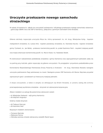 Komenda Powiatowa Państwowej Straży Pożarnej w Limanowej Uroczyste przekazanie nowego samochodu strażackiego W sobotę 16 kwietnia br. odbyła się uroczystość poświęcenia i oficjalnego przekazania nowego samochodu ratowniczo - gaśniczego GBARt Iveco dla OSP w Kamienicy, połączona z gminnymi obchodami Dnia Strażaka. Główne obchody rozpoczęła uroczysta Msza św. którą sprawowali: ks. mł. bryg. Władysław Kulig - kapelan małopolskich strażaków, ks. Łukasz Kita - kapelan powiatowy strażaków, ks. Stanisław Kaczka - kapelan strażaków gminy Tymbark, ks. Jan Betlej - proboszcz kamienickiej parafii, ks. prałat Kazimierz Pach - rezydent tutejszej parafii oraz księża wikariusze kamiennickiej parafii: ks. Marcin Kawa i ks. Radosław Słowik. Po skończonym nabożeństwie pododdziały strażaków z gminy Kamienica oraz zaprzyjaźnionych jednostek udały się na parking przy kościele, gdzie rozpoczęły się główne uroczystości. Po przeglądzie i przywitaniu pododdziałów przez Komendanta Wojewódzkiego Państwowej Straży Pożarnej w Krakowie - mł. bryg. Stanisława Nowaka nastąpiło uroczyste podniesienie flagi państwowej na maszt. Następnie prezes OSP Kamienica dh Marian Wąchała przywitał zaproszonych gości i przedstawił rys historyczny tutejszej jednostki. Z okazji uroczystości, a także w związku ze zbliżającym się Dniem Strażaka, w uznaniu zasług dla ochrony przeciwpożarowej wyróżniono strażaków - otrzymali oni odznaczenia korporacyjne. Złotym medalem za zasługi dla pożarnictwa odznaczeni zostali: ● ● dr Władysław Sadowski - wójt gminy Kamienica dh Wojciech Augustyn Srebrny medal otrzymali: ● ● dh Tadeusz Gierczyk dh Kazimierz Kwit Brązowym medalem uhonorowano: ● ● ● Tomasza Wąchałę Mateusza Farona Odznaką wzorowy strażak odznaczony zostałdh Marek Syjud. 1 Komenda Powiatowa Państwowej Straży Pożarnej w Limanowej W podziękowaniu za działalność na rzecz ochrony przeciwpożarowej, w dowód wdzięczności za dotychczasową współpracę oraz za szczególne zasługi Kapelan Małopolskich Strażaków wyróżnił: Złotym Krzyżem Zasługi Orderu Świętego Floriana: ● ● Janusza Kurzeję Kazimierza Czyrnka Srebrnym Krzyżem Zasługi Orderu Świętego Floriana: ● ● ● ● ● ● ● Władysława Sadowskiego Marcina Kuliga Eugeniusza Rutkę Piotra Kalicińskiego Mariana Wąchałę Adama Opyda Mateusza Chlipałę Kulminacyjnym momentem uroczystego apelu było przekazanie kluczy do pojazdu prezesowi OSP Kamienica, którego dokonał wójt gminy Kamienica - dr Władysław Sadowski. Następnie samochód został poświęcony przez księży kapelanów. W uroczystościach, poza wymienionymi wcześniej osobami, udział wzięli m.in.: ● ● ● ● ● ● ● dh Kazimierz Czyrnek- Wiceprezes Zarządu Oddziału Wojewódzkiego Związku Ochotniczych Straży Pożarnych w Krakowie, a zarazem Prezes Zarządu Oddziału Powiatowego Związku OSP RP w Limanowej; Janusz Kurzeja - Komendant Powiatowy PSP w Limanowej, Członek Zarządu Oddziału Powiatowego ZOSR RP w Limanowej; mł. bryg. Tomasz Pawlik- Zastępca Komendanta Powiatowego PSP w Limanowej; kpt. Marcin Kulig - Zastępca Naczelnika Wydziału ds. Operacyjno – Szkoleniowych KP PSP w Limanowej; dh Agata Zięba - Członek Zarządu Powiatu Limanowskiego; dh Eugeniusz Rutka- Przewodniczący Rady Gminy Kamienica; Radni Gminy Kamienica. Foto : GOK Kamienica 2