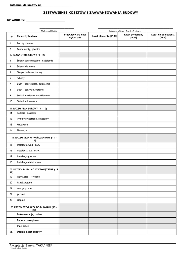 Załącznik do umowy nr __________________ ZESTAWIENIE KOSZTÓW I ZAAWANSOWANIA BUDOWY Nr wniosku: __________________ __________________ Miejscowość i data l.p. Elementy budowy 1 Roboty ziemne 2 Fundamenty, piwnice I. RAZEM STAN ZEROWY (1 - 2) 3 Ściany konstrukcyjne - nadziemia 4 Ścianki działowe 5 Stropy, balkony, tarasy 6 Schody 7 Dach - konstrukcja, ocieplenie 8 Dach - pokrycie, obróbki 9 Stolarka okienna z oszkleniem 10 Stolarka drzwiowa II. RAZEM STAN SUROWY (3 - 10) 11 Podłogi i posadzki 12 Tynki wewnętrzne, okładziny 13 Malowanie 14 Elewacja III. RAZEM STAN WYKOŃCZENIOWY (11 14) 15 Instalacja wod.- kan. 16 Instalacja c.o. i c.w. 17 Instalacja gazowa 18 Instalacja elektryczna IV. RAZAEM INSTALACJE WEWNĘTRZNE (15 18) 19 Przyłącza: - wodne 20 kanalizacyjne 21 energetyczne 22 gazowe 23 cieplne V. RAZEM PRZYŁĄCZA DO BUDYNKU (19 23) Dokumentacja, nadzór Roboty zewnętrzne Inne prace VI. Ogółem koszt budowy Akceptacja Banku: TAK*/ NIE* * niepotrzebne skreślić _______________________________________ imię i nazwisko, podpis Kredytobiorcy Przewidywana data wykonania Koszt elementu [PLN] Koszt poniesiony [PLN] Koszt do poniesienia [PLN] Minimalne koszty budowy budynków jednorodzinnych stosowane w Banku DnB NORD Polska S.A. w procesie udzielania produktów hipotecznych klientom indywidualnym Podwyższony Standard standard Województwo / Miasto Minimalny koszt Minimalny 2 budowy 1 m koszt budowy 1 m2 dolnośląskie 2 608 PLN 3 225 PLN kujawsko-pomorskie 2 439 PLN 3 016 PLN lubelskie 2 356 PLN 2 913 PLN lubuskie 2 449 PLN 3 029 PLN łódzkie 2 479 PLN 3 066 PLN małopolskie 2 638 PLN 3 262 PLN mazowieckie 2 509 PLN 3 104 PLN opolskie 2 479 PLN 3 066 PLN podkarpackie 2 449 PLN 3 029 PLN podlaskie 2 487 PLN 3 075 PLN pomorskie 2 708 PLN 3 350 PLN świętokrzyskie 2 267 PLN 2 804 PLN śląskie 2 479 PLN 3 066 PLN warmińsko-mazurskie 2 456 PLN 3 038 PLN wielkopolskie 2 550 PLN 3 153 PLN zachodnio-pomorskie 2 592 PLN 3 206 PLN Warszawa 2 865 PLN 3 543 PLN