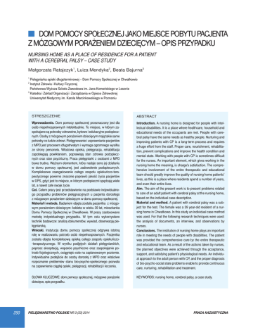 DOM POMOCY SPOŁECZNEJ JAKO MIEJSCE POBYTU PACJENTA Z MÓZGOWYM PORAŻENIEM DZIECIĘCYM – OPIS PRZYPADKU NURSING HOME AS A PLACE OF RESIDENCE FOR A PATIENT WITH A CEREBRAL PALSY – CASE STUDY Małgorzata Ratajczyk1, Luiza Mendyka2, Beata Bajurna3 1 Pielęgniarka opieki długoterminowej – Dom Pomocy Społecznej w Chwałkowie Instytut Zdrowia i Kultury Fizycznej Państwowa Wyższa Szkoła Zawodowa im. Jana Komeńskiego w Lesznie 3 Katedra i Zakład Organizacji i Zarządzania w Opiece Zdrowotnej Uniwersytet Medyczny im. Karola Marcinkowskiego w Poznaniu 2 250 STRESZCZENIE ABSTRACT Wprowadzenie. Dom pomocy społecznej przeznaczony jest dla osób niepełnosprawnych intelektualnie. To miejsce, w którym zaspokajane są potrzeby zdrowotne, bytowe i edukacyjne podopiecznych. Osoby z mózgowym porażeniem dziecięcym mają takie same potrzeby co ludzie zdrowi. Pielęgnowanie i usprawnianie pacjentów z MPD jest procesem długotrwałym i wymaga ogromnego wysiłku ze strony personelu. Właściwa opieka, pielęgnacja, rehabilitacja zapobiegają powikłaniom, poprawiają stan zdrowia podopiecznych oraz stan psychiczny. Praca pielęgniarki z osobami z MPD bywa trudna. Ważnym elementem, który nadaje sens jej działaniu w domu pomocy społecznej, jest zadowolenie podopiecznych. Kompleksowe zaangażowanie całego zespołu opiekuńczo-terapeutycznego powinno znacznie poprawić jakość życia pacjentów w DPS, gdyż jest to miejsce, w którym podopieczni spędzają wiele lat, a nawet całe swoje życie. Cel. Celem pracy jest przedstawienie na podstawie indywidualnego przypadku problemów pielęgnacyjnych u pacjenta dorosłego z mózgowym porażeniem dziecięcym w domu pomocy społecznej. Materiał i metoda. Badaniem objęta została pacjentka z mózgowym porażeniem dziecięcym: kobieta w wieku 39 lat, mieszkanka Domu Pomocy Społecznej w Chwałkowie. W pracy zastosowano metodę indywidualnego przypadku. W tym celu wykorzystano techniki badawcze: analizę dokumentów, wywiad, obserwację pielęgniarską. Wnioski. Instytucja domu pomocy społecznej odgrywa istotną rolę w realizowaniu potrzeb osób niepełnosprawnych. Pacjentka została objęta kompleksową opieką całego zespołu opiekuńczo-terapeutycznego. W wyniku podjętych działań pielęgniarskich, poprzez akceptację, wsparcie psychiczne oraz zaspokajanie potrzeb fizjologicznych, osiągnięto cele na zaplanowanym poziomie. Indywidualne podejście do osoby dorosłej z MPD oraz właściwe rozpoznanie problemów stanu bio-psycho-społecznego pozwala na zapewnienie ciągłej opieki, pielęgnacji, rehabilitacji i leczenia. Introduction. A nursing home is designed for people with intellectual disabilities. It is a place where healthcare, household and educational needs of the occupants are met. People with cerebral palsy have the same needs as healthy people. Nurturing and improving patients with CP is a long-term process and requires a huge effort from the staff. Proper care, nourishment, rehabilitation, prevent complications and improve the health condition and mental state. Working with people with CP is sometimes difficult for the nurses. An important element, which gives working in the nursing home the meaning, is charge’s satisfaction. The comprehensive involvement of the entire therapeutic and educational team should greatly improve the quality of nursing home patients’ lives, as this is a place where residents spend a number of years, and even their entire lives. Aim. The aim of the present work is to present problems related to care of an adult patient with cerebral palsy at the nursing home, based on the individual case description. Material and method. A patient with cerebral palsy was a subject for the test. The female was a 39 year-old resident of a nursing home in Chwałkowo. In this study an individual case method was used. For that the following research techniques were used: the analysis of documents, an interview, and observations by nurses. Conclusions. The institution of nursing home plays an important role in meeting the needs of people with disabilities. The patient was provided the comprehensive care by the entire therapeutic and educational team. As a result of the actions taken by nurses, the planned objectives were achieved through the acceptance, support, and satisfying patient’s physiological needs. An individual approach to the adult person with CP, and the proper diagnosis of bio-psycho-social state problems enable to provide continuous care, nurturing, rehabilitation and treatment. SŁOWA KLUCZOWE: dom pomocy społecznej, mózgowe porażenie dziecięce, opis przypadku. KEYWORDS: nursing home, cerebral palsy, a case study. PIELĘGNIARSTWO POLSKIE NR 3 (53) 2014 PRACA KAZUISTYCZNA Wprowadzenie Każdego dnia wokół nas spotykamy osoby niepełnosprawne fizycznie i intelektualnie. Nie wszyscy wiemy, jak mamy się wtedy zachować. Osoby z mózgowym porażeniem dziecięcym mają te same potrzeby co ludzie zdrowi. Może to wydać się nieprawdziwe, szczególnie w przypadku głęboko upośledzonych umysłowo, u których dostrzegamy i najchętniej zaspokajamy jedynie potrzeby fizjologiczne. Uważamy, że żyją one w bardzo ograniczonym świecie. Jednak osoby te mają potrzeby wyższego rzędu, ale trudno im je wyrazić. Szukają oparcia w opiekunie, pragną miłości i szacunku, chcą być akceptowane takimi, jakimi są, interesują się najbliższym otoczeniem, są wrażliwe na przyjemne bodźce estetyczne. Każda osoba z MPD jest niepowtarzalnym człowiekiem, mającym indywidualne uczucia i reakcje, jak również wspomniane potrzeby psychiczne, inny jest tylko poziom ich występowania i sposób zaspokajania. Oceny zadowolenia z życia są zróżnicowanie w zależności od stopnia niepełnosprawności. Im większa niepełnosprawność fizyczna osób z MPD, tym niższy jest wskaźnik oceny poziomu jakości życia [1]. Personel domu pomocy społecznej ma ogromny wpływ na jakość życia podopiecznych, w tym osób z 