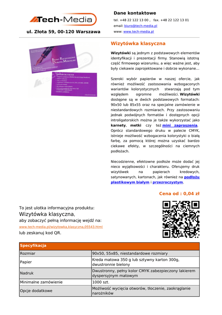 Dane kontaktowe tel. +48 22 122 13 00 , fax. +48 22 122 13 01 email: [email protected] ul. Złota 59, 00-120 Warszawa www: www.tech-media.pl Wizytówka klasyczna Wizytówki są jednym z podstawowych elementów identyfikacji i prezentacji firmy. Stanowią istotną część firmowego wizerunku, a więc ważne jest, aby były ciekawie zaprojektowane i dobrze wykonane… Szeroki wybór papierów w naszej ofercie, jak również możliwość zastosowania wzbogaconych wariantów kolorystycznych stwarzają pod tym względem ogromne możliwości. Wizytówki dostępne są w dwóch podstawowych formatach: 90x50 lub 85x55 oraz na specjalne zamówienie w niestandardowych rozmiarach. Przy zastosowaniu jednak podwójnych formatów i dostępnych opcji introligatorskich można je także wykorzystać jako karnety, metki czy też mini zaproszenia. Oprócz standardowego druku w palecie CMYK, istnieje możliwość wzbogacenia kolorystyki o białą farbę, za pomocą której można uzyskać bardzo ciekawe efekty, w szczególności na ciemnych podłożach. Niecodzienne, efektowne podłoże może dodać jej nieco wyjątkowości i charakteru. Oferujemy druk wizytówek na papierach kredowych, satynowanych, kartonach, jak również na podłożu plastikowym białym i przezroczystym. Cena od : 0,04 zł To jest ulotka informacyjna produktu: Wizytówka klasyczna, aby zobaczyć pełną informację wejdź na: www.tech-media.pl/wizytowka,klasyczna,05543.html lub zeskanuj kod QR. Specyfikacja Rozmiar 90x50, 55x85, niestandardowe rozmiary Papier Kreda matowa 350 g lub sztywny karton 300g, dwustronnie bielony Nadruk Dwustronny, pełny kolor CMYK zabezpieczony lakierem dyspersyjnym matowym Minimalne zamówienie 1000 szt. Opcje dodatkowe Możliwość wycięcia otworów, tłoczenie, zaokrąglanie narożników