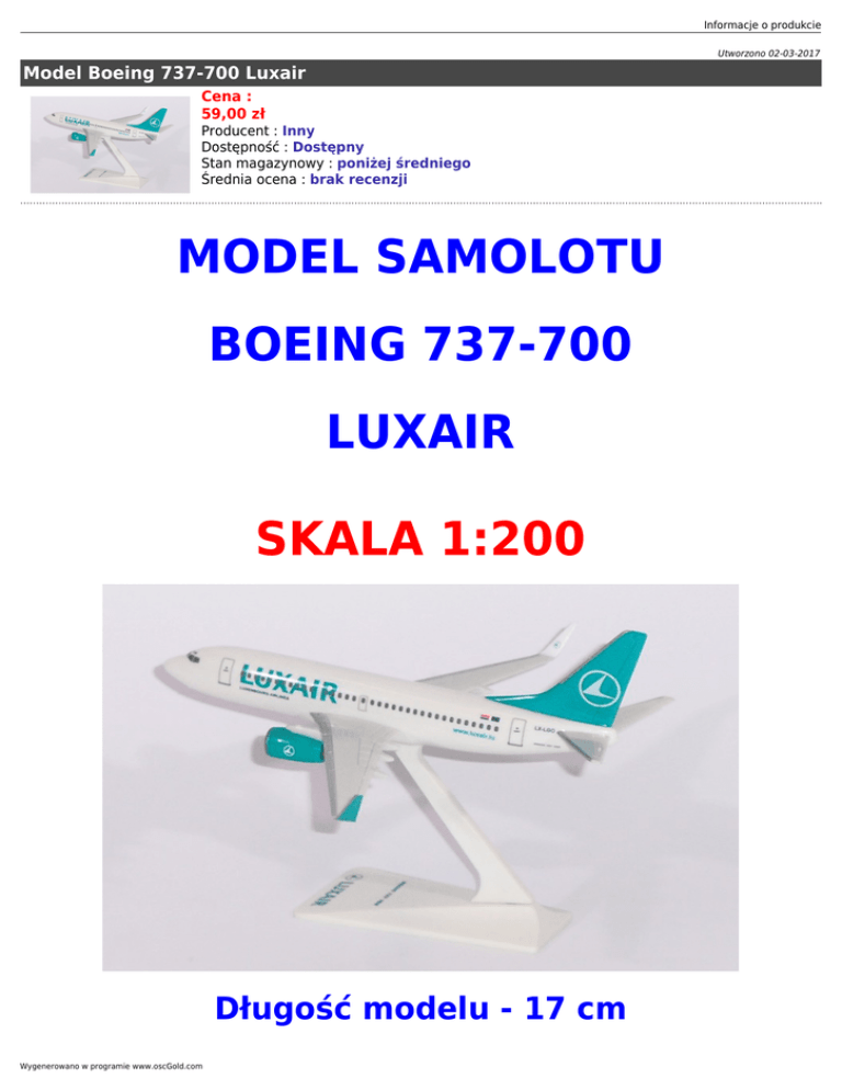 Informacje o produkcie Utworzono 02-03-2017 Model Boeing 737-700 Luxair Cena : 59,00 zł Producent : Inny Dostępność : Dostępny Stan magazynowy : poniżej średniego Średnia ocena : brak recenzji MODEL SAMOLOTU BOEING 737-700 LUXAIR SKALA 1:200 Długość modelu - 17 cm Wygenerowano w programie www.oscGold.com Rozpiętość skrzydeł - 17 cm Samolot zapakowany w pudełko, wewnątrz którego każdy z elementów jest dodatkowo zabezpieczany w foliowych blistrach. Samolot do szybkiego złożenia bezklejowego KWESTIA WPIĘCIA w kadłub skrzydeł i stateczników. Przed wysyłką opakowanie z modelem jest dodatkowo zabezpieczane. Model plastikowy. WYPRZEDAŻ!!! OSTATNIE DOSTĘPNE SZTUKI NA NASZYM MAGAZYNIE. MODEL NIEDOSTĘPNY JUŻ U PRODUCENTA!