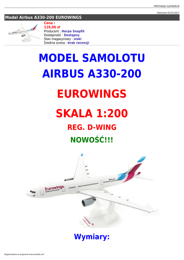 Informacje o produkcie Utworzono 02-03-2017 Model Airbus A330-200 EUROWINGS Cena : 119,00 zł Producent : Herpa Snapfit Dostępność : Dostępny Stan magazynowy : niski Średnia ocena : brak recenzji MODEL SAMOLOTU AIRBUS A330-200 EUROWINGS SKALA 1:200 REG. D-WING NOWOŚĆ!!! Wymiary: Wygenerowano w programie www.oscGold.com Długość - 29,5 cm Rozpiętość skrzydeł - 30 cm Samolot zapakowany w pudełko, wewnątrz którego każdy z elementów jest dodatkowo zabezpieczany w blistrach. Samolot do szybkiego złożenia bezklejowego - KWESTIA WPIĘCIA w kadłub skrzydeł i stateczników. Przed wysyłką opakowanie z modelem jest dodatkowo zabezpieczane. Informacje o produkcie Model jest oczywiście nowy i w oryginalnym opakowaniu. Materiał bardzo wysokiej jakości produkowany według najnowszych standardów. Perfekcyjnie wykonane malowanie! Model plastikowy. PRODUCENT - HERPA SNAPFIT Wygenerowano w programie www.oscGold.com